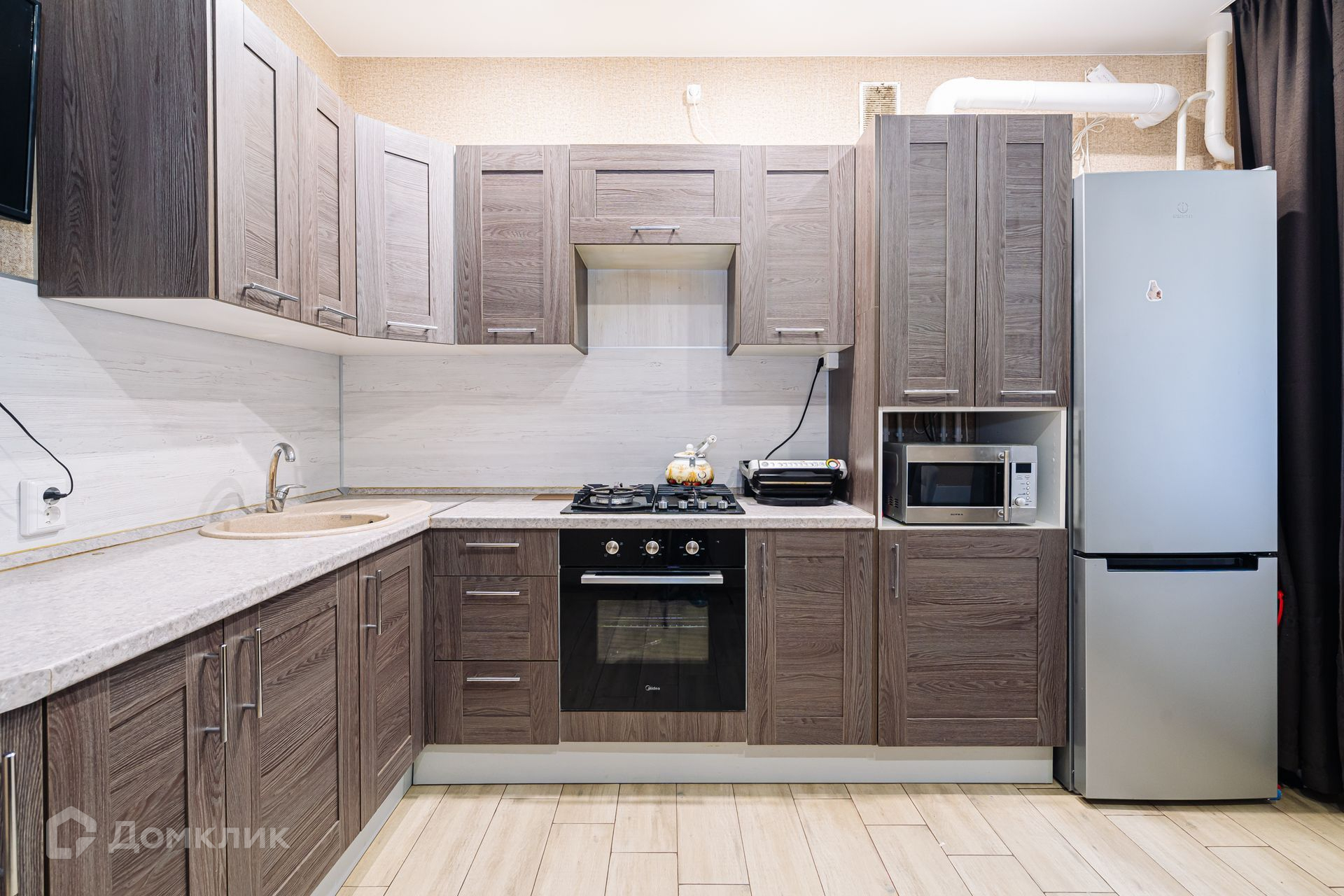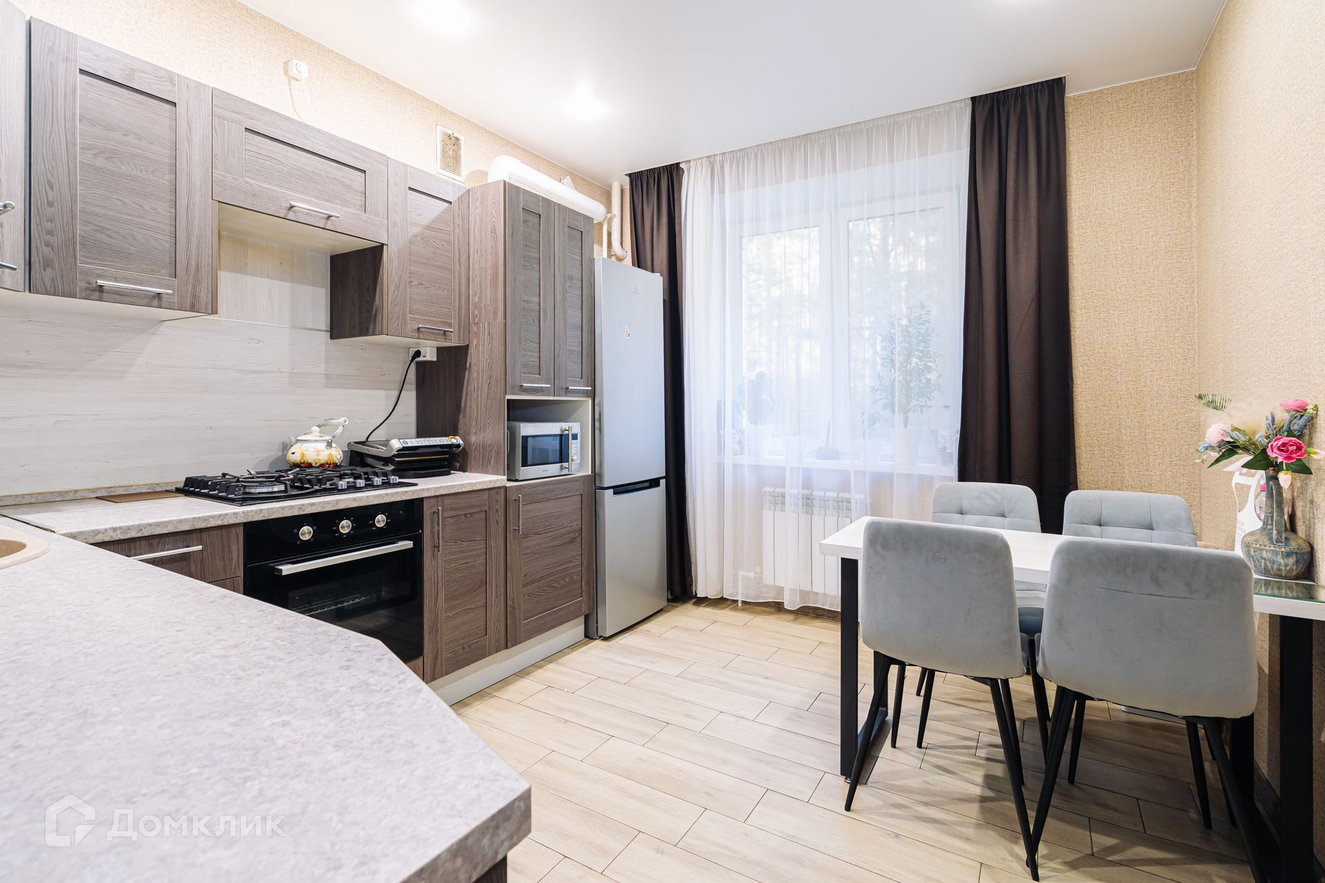 Кухонный гарнитур остается новым владельцам, включая варочную поверхность, духовой шкаф.