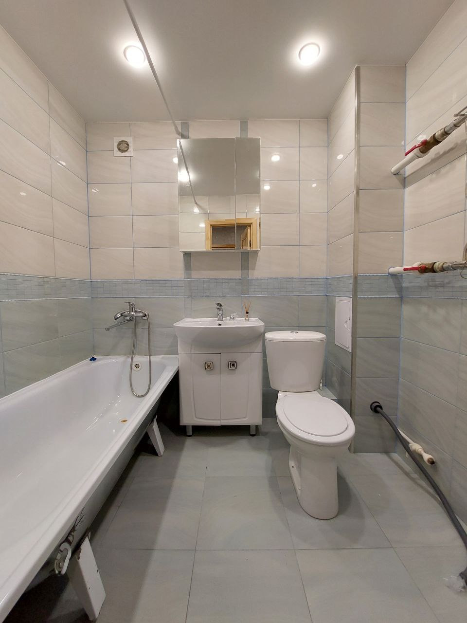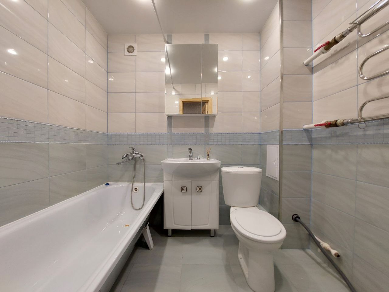 Санузел совмещенный, в плитке, есть место для стиральной машины.