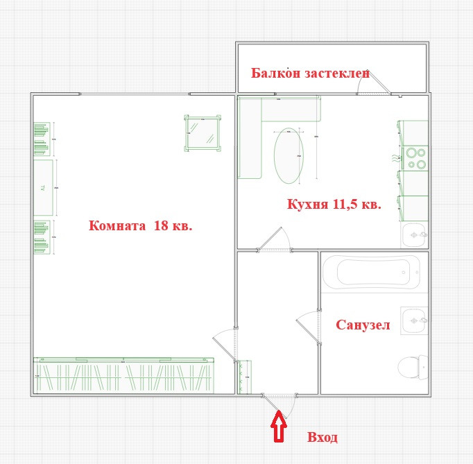 Площадь квартиры 38,6 / 19 / 11,5 (кухня).
