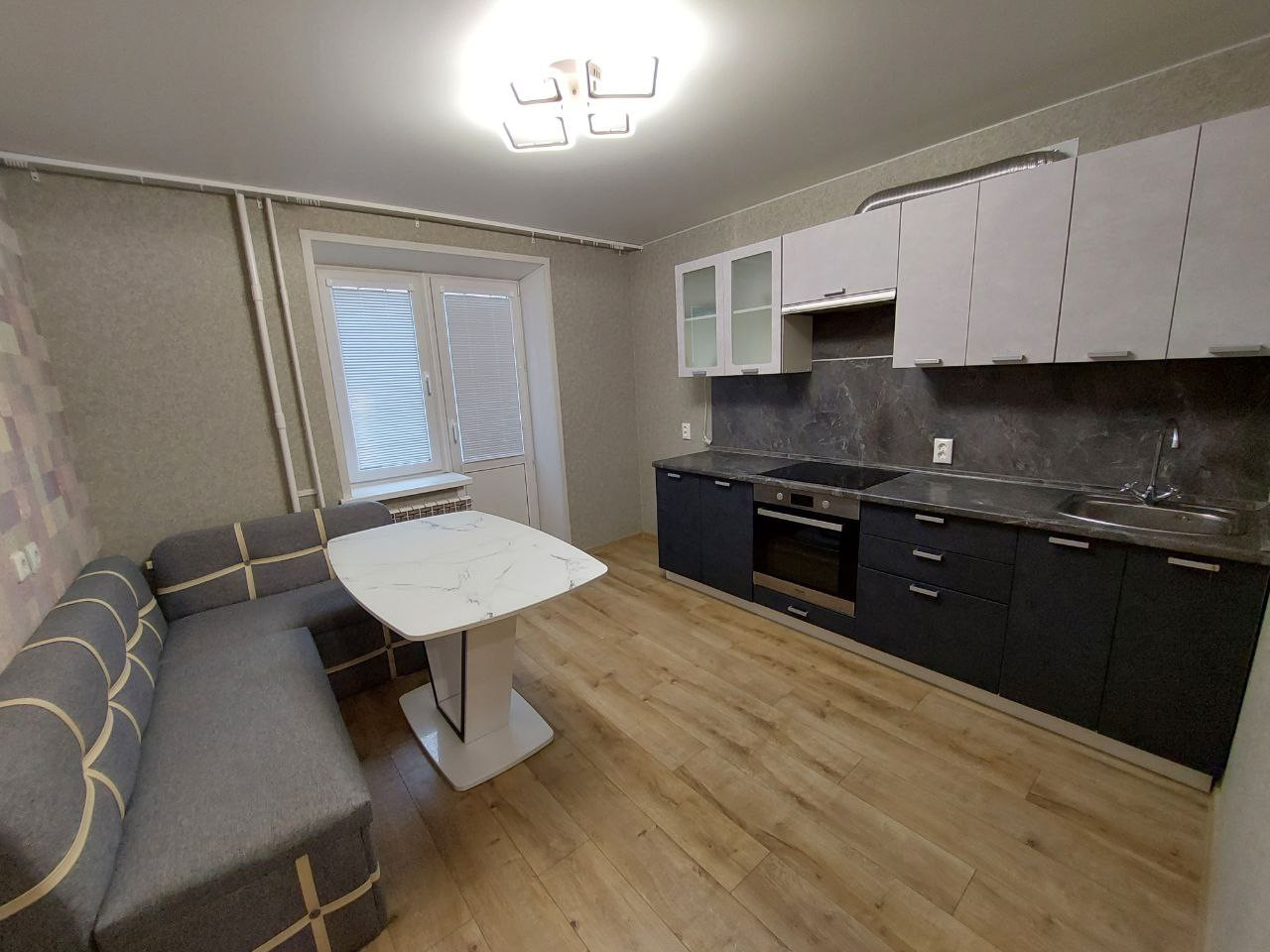 ВСЯ МЕБЕЛЬ НА ФОТО ОСТАЕТСЯ: кухонный гарнитур, варочная панель Haier, духовой шкаф Hotpoint Ariston, обеденный стол, кухонный уголок (раскладывается в спальное место) стенка под ТВ, большой шкаф купе, журнальный столик, вешалка для одежды в коридоре.