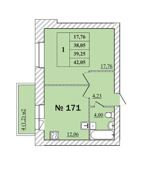Общая площадь 42.05 м2