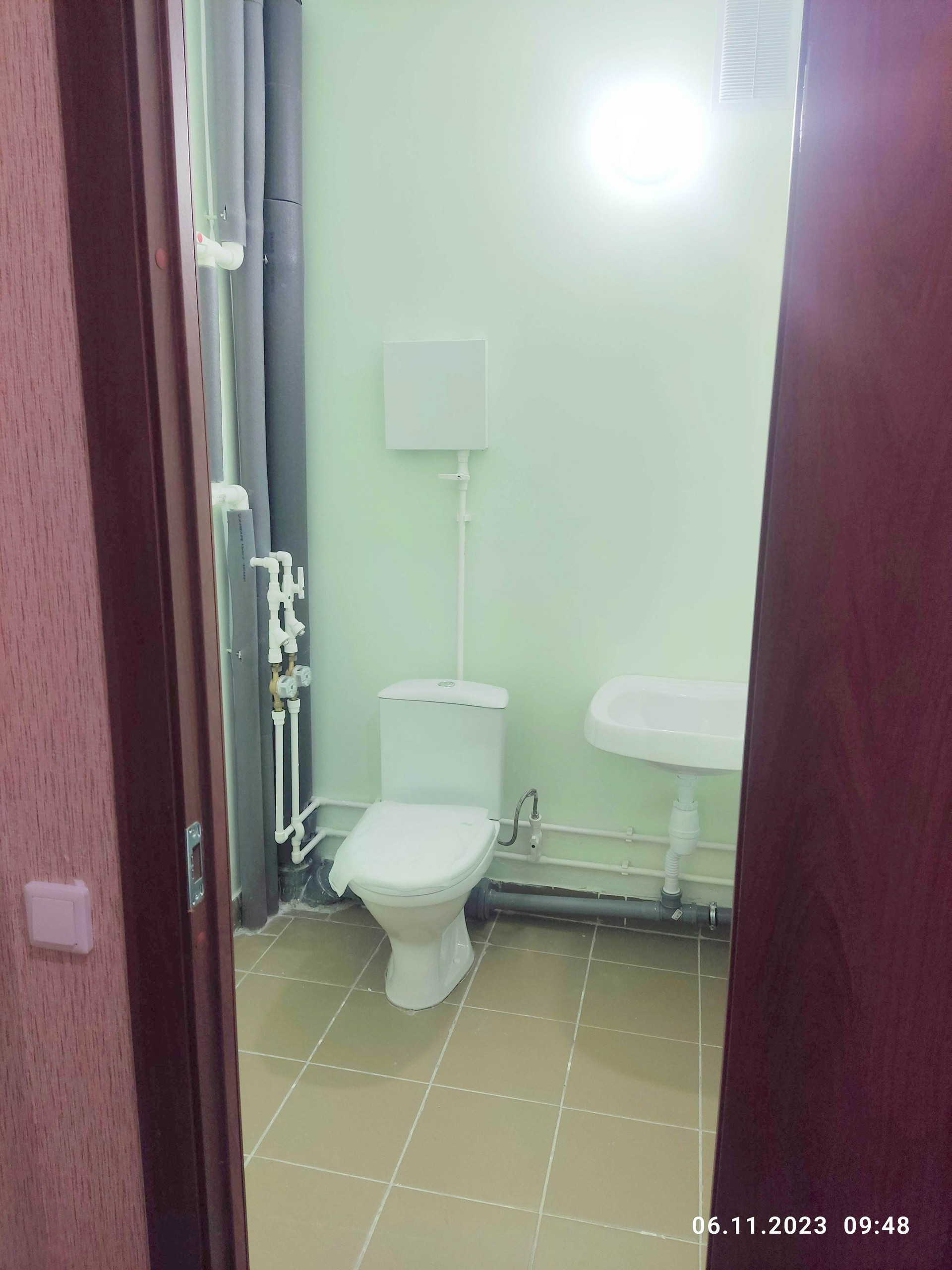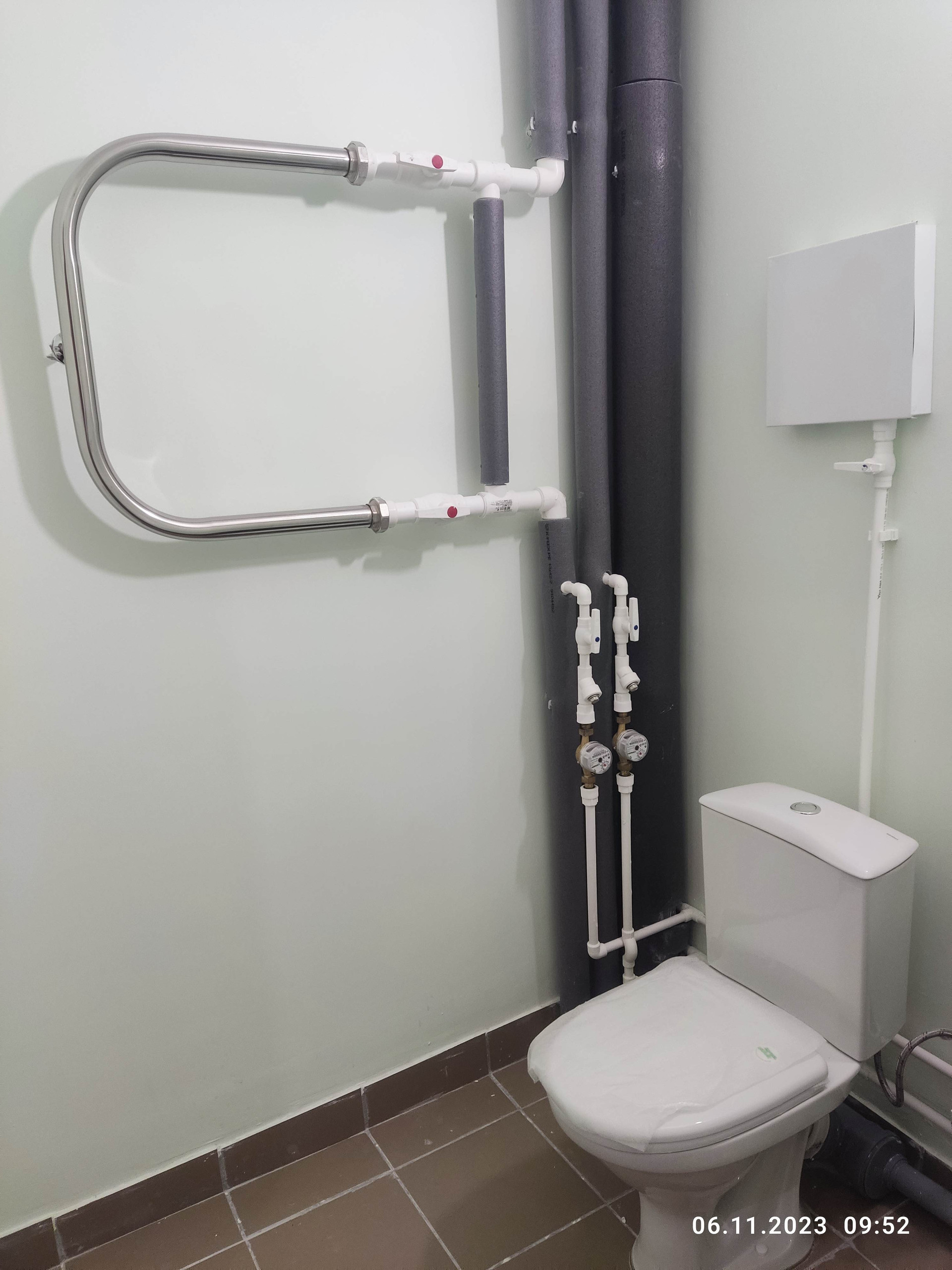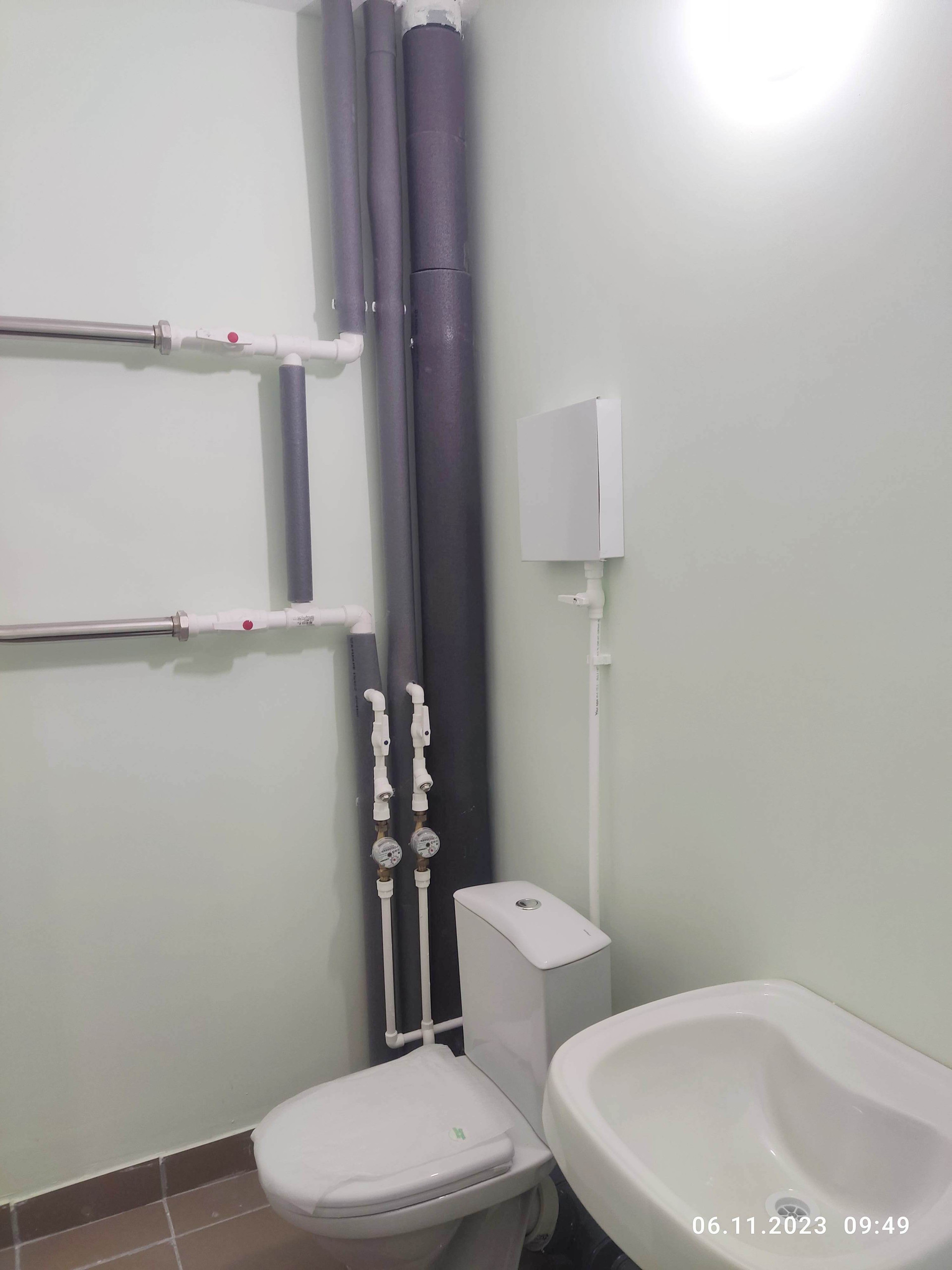 - В санузле на полу плитка. Трубы горячего и холодного водоснабжения из полипропилена. Полотенцесушитель из нержавеющей стали.