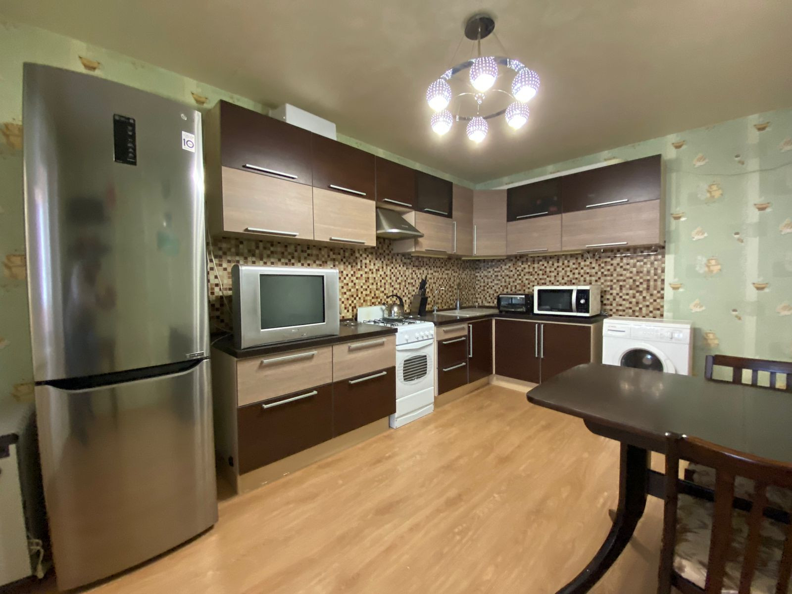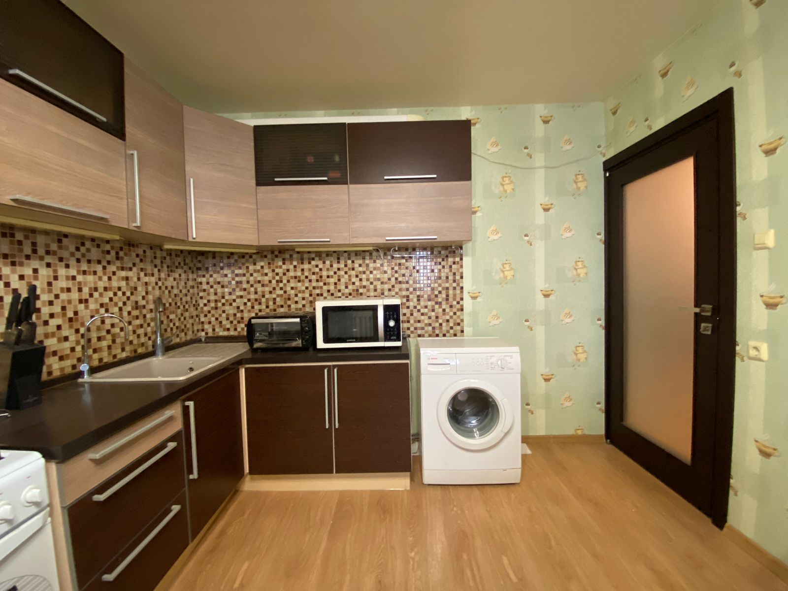 Кухня 16 кв.м оборудована просторным и современным кух.гарнитуром, газ.плитой, вытяжкой, микроволновой печью, небольшим телевизором, электро-чайником, холодильником, стир.машиной, и обеденной зоной с выходом на лоджию. В большой комнате располагается диван еврокнижка 160x200 спального места, тумба под ТВ, и телевизор. Во второй комнате установлен вместительный шкаф-купе (с зеркалом во весь рост), и гостевой диван-софа со вторым выходом на лоджию. Лоджия удлинённая 8 кв.м полностью застеклённая (обшита деревянной рамой), расположена на солнечной стороне. В спальне установлена двухместная кровать с матрасом 160*200 спального места, вместительный угловой шкаф, для хранения вещей и компактный комод. Санузел раздельного типа ПОЛНОСТЬЮ В ПЛИТКЕ, оборудован дополнительно ВОДОНАГРЕВАТЕЛЕМ! Коридор оснащен просторной стенкой-прихожей (под верхнюю одежду).