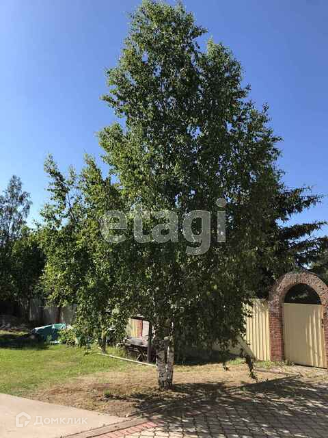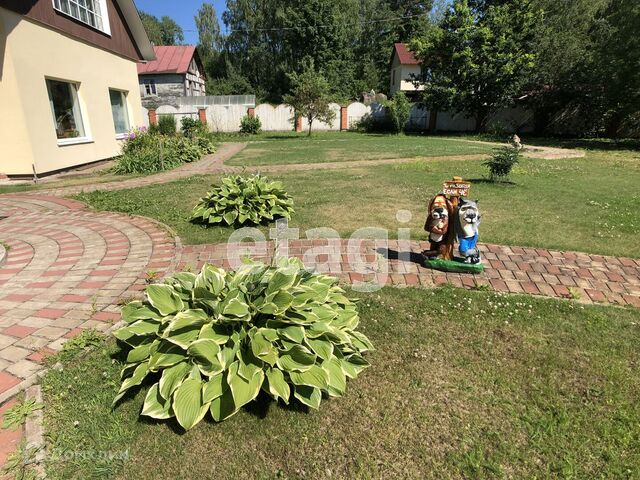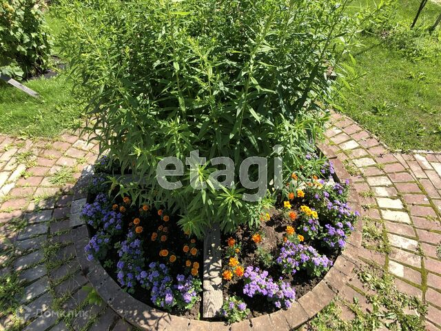 На участке уложены тропинки тротуарным камнем, красиво высажены цветы, растут взрослые деревья.