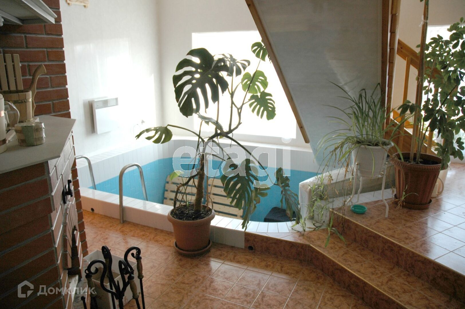 2) 2-х этажная баня: 1 этаж - г/б, 2-ой - деревянный, лестница деревянная, перекрытия деревянные. На 1 этаже бассейн, комната, парилка. На 2-м этаже установлен бильярдный стол.