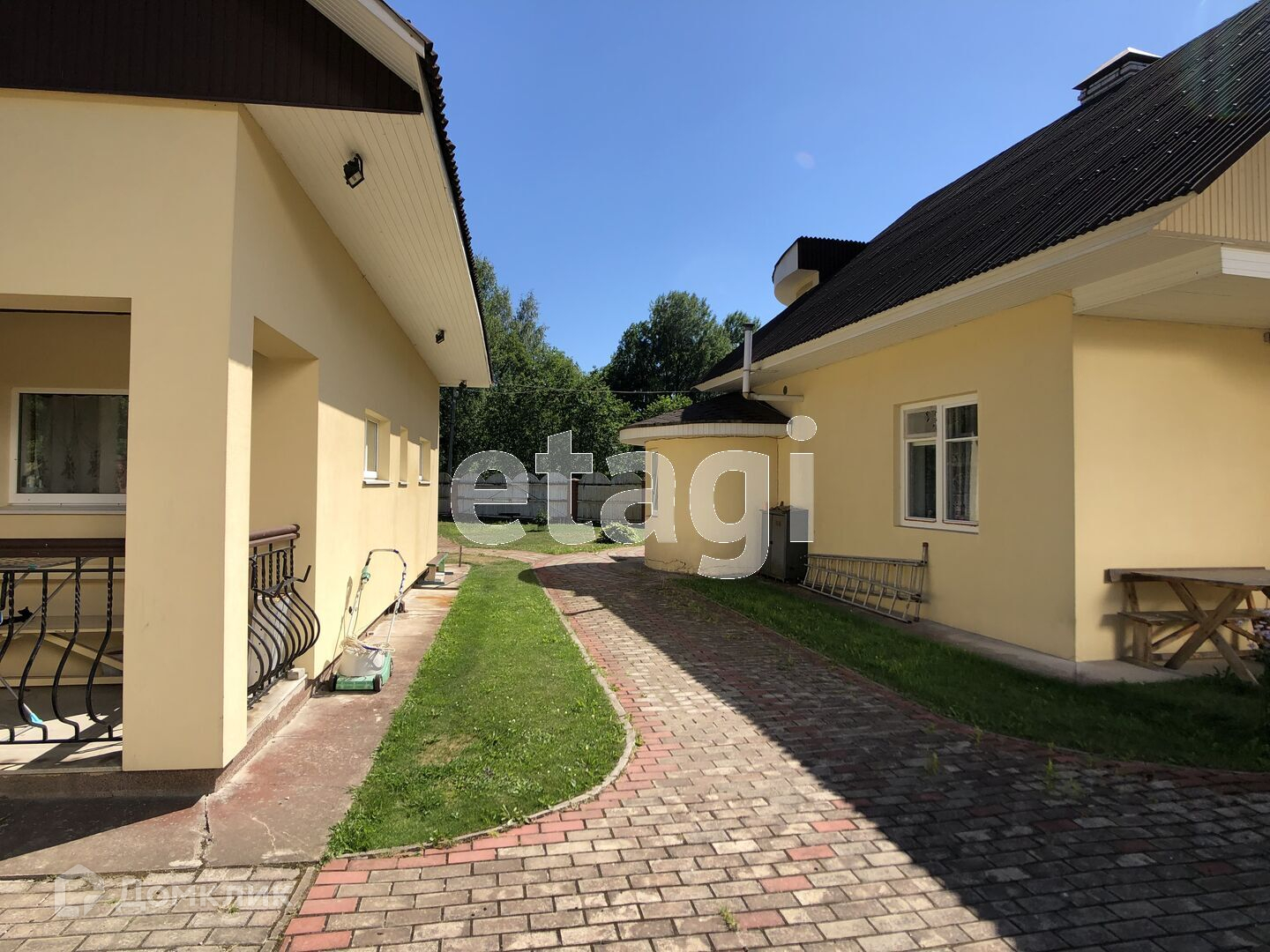 На участке уложены тропинки тротуарным камнем, красиво высажены цветы, растут взрослые деревья.