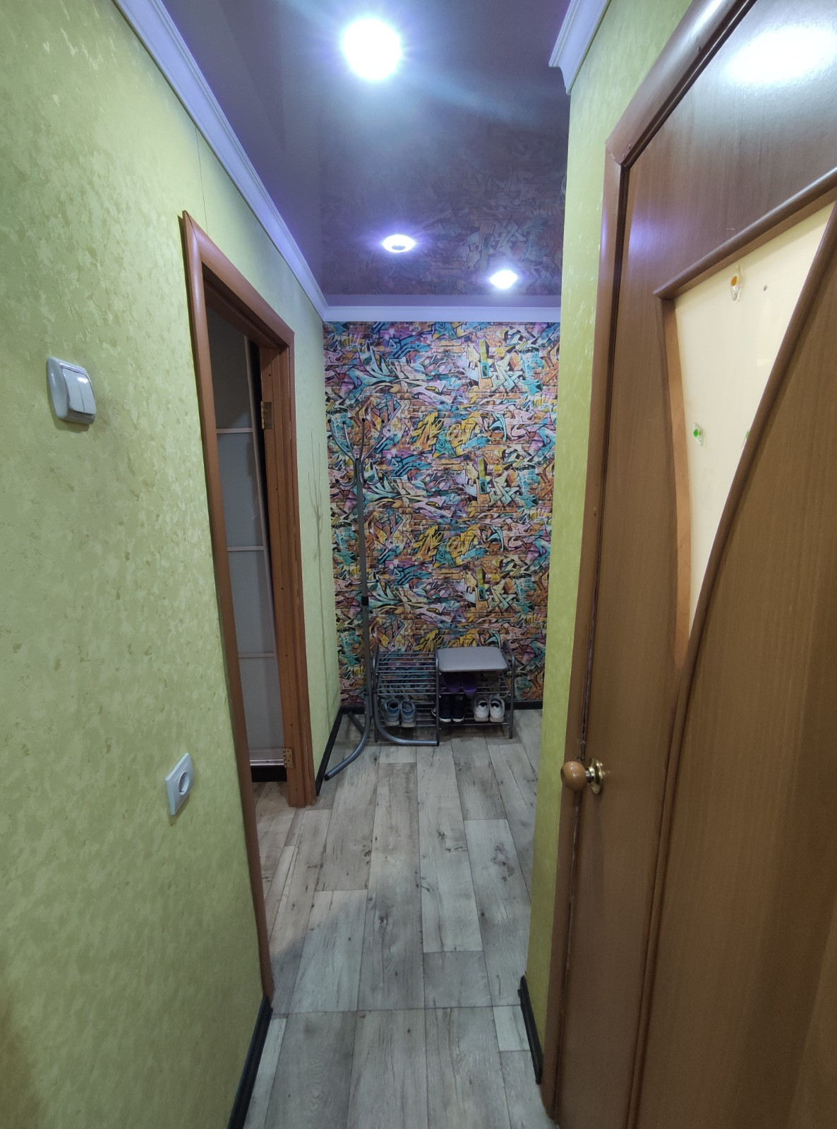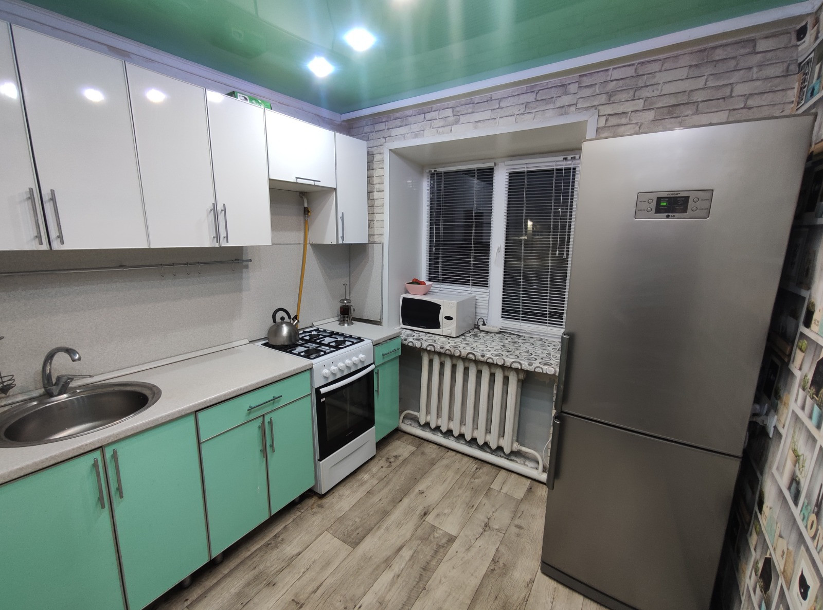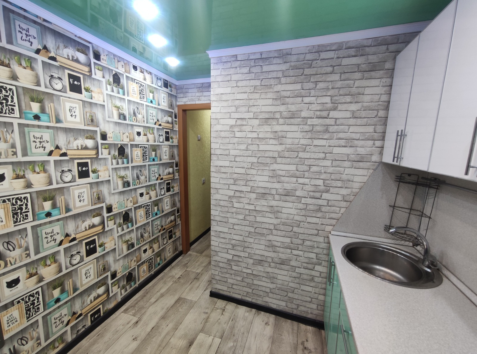 В квартире выровнены стены, полы досчатые постелен новый линолеум, заменены: входная и межкомнатные двери, пластиковые окна, натяжные потолки, обои, плинтуса, полипропиленовые трубы, счетчики, сантехника.