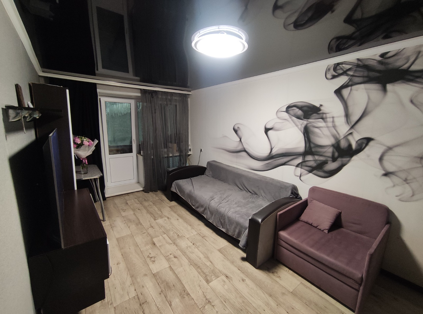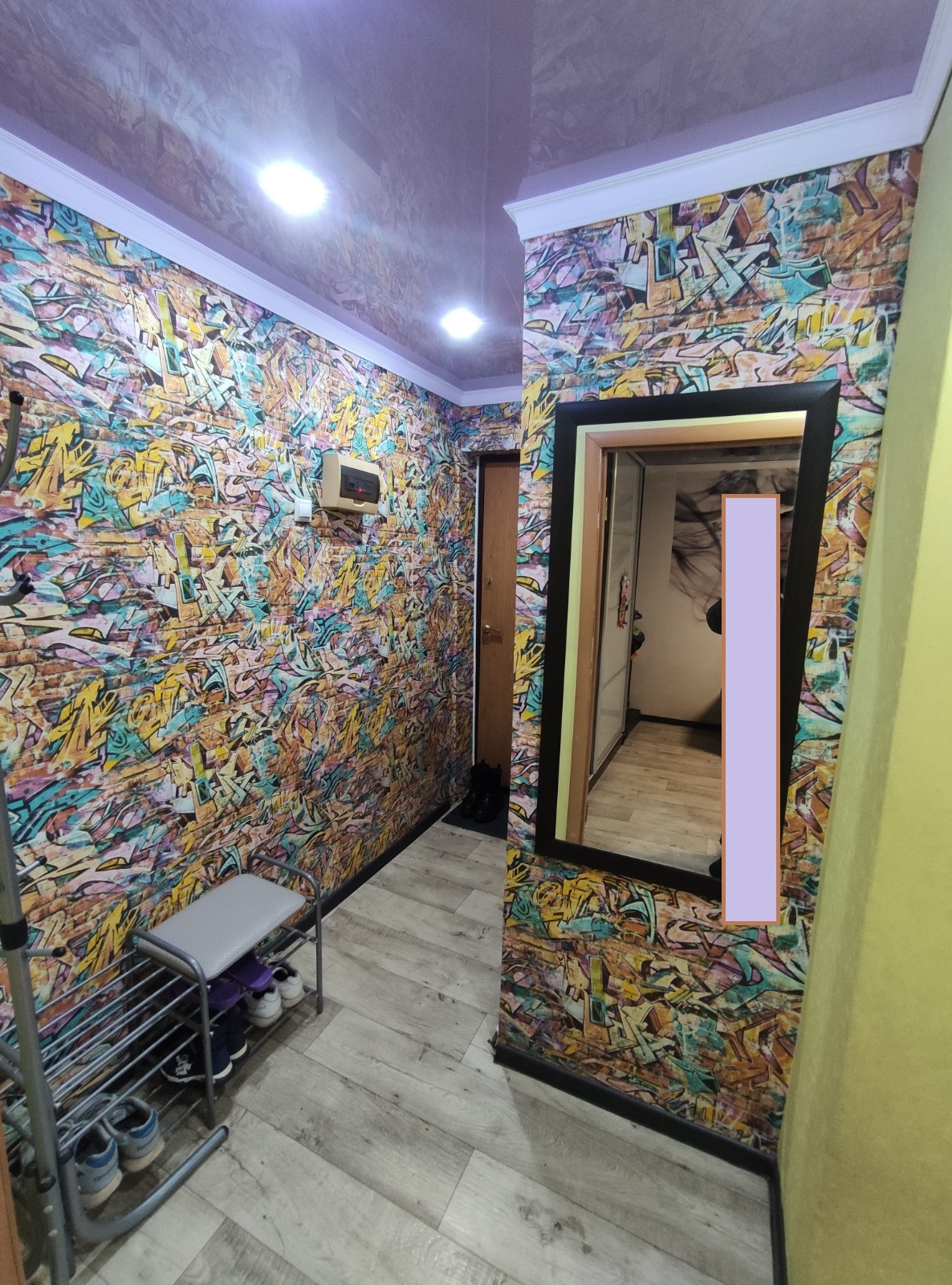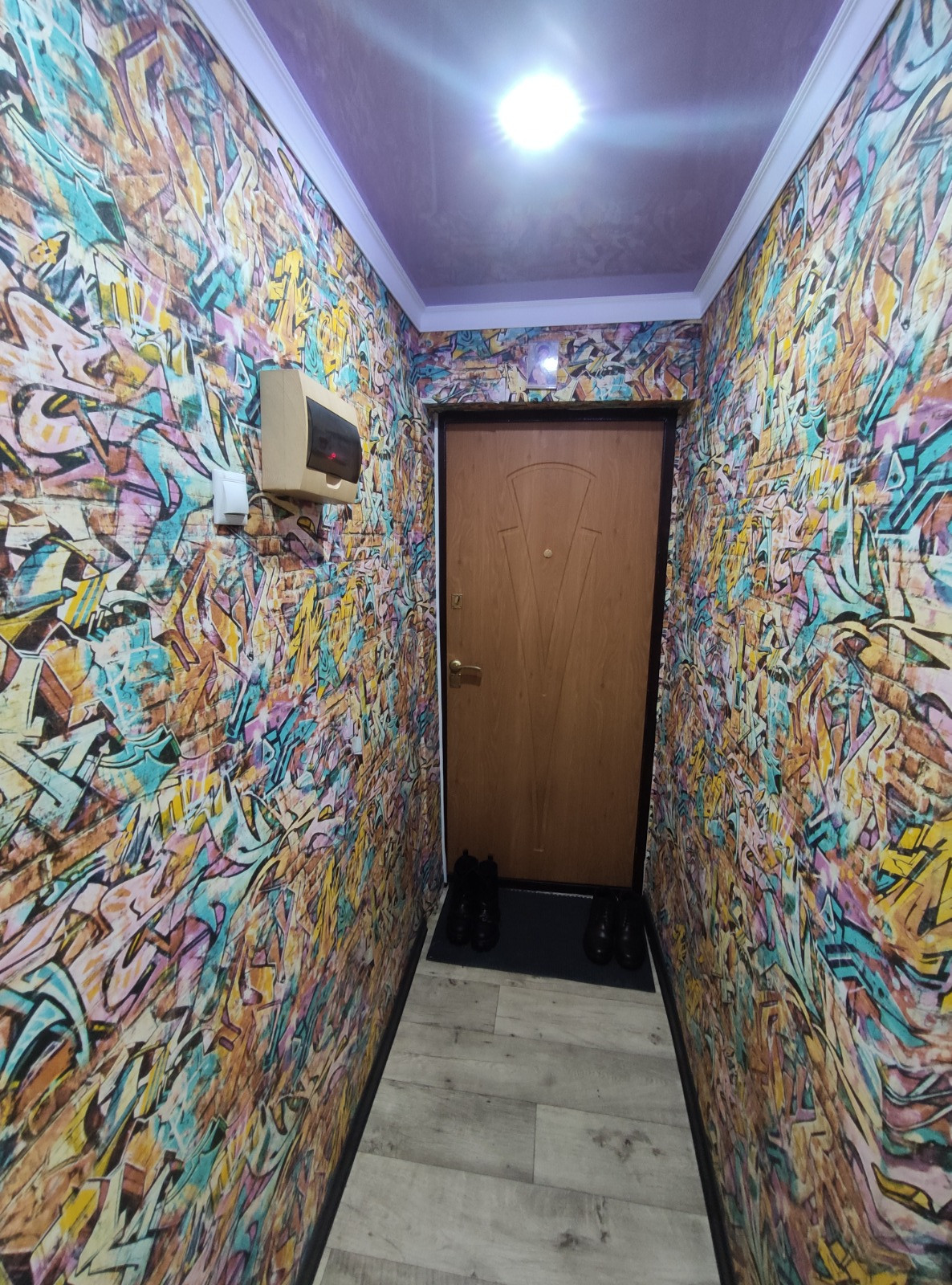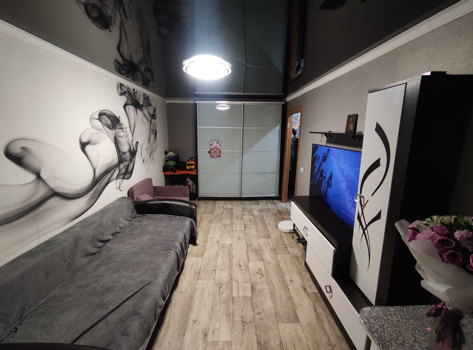 В квартире выровнены стены, полы досчатые постелен новый линолеум, заменены: входная и межкомнатные двери, пластиковые окна, натяжные потолки, обои, плинтуса, полипропиленовые трубы, счетчики, сантехника.