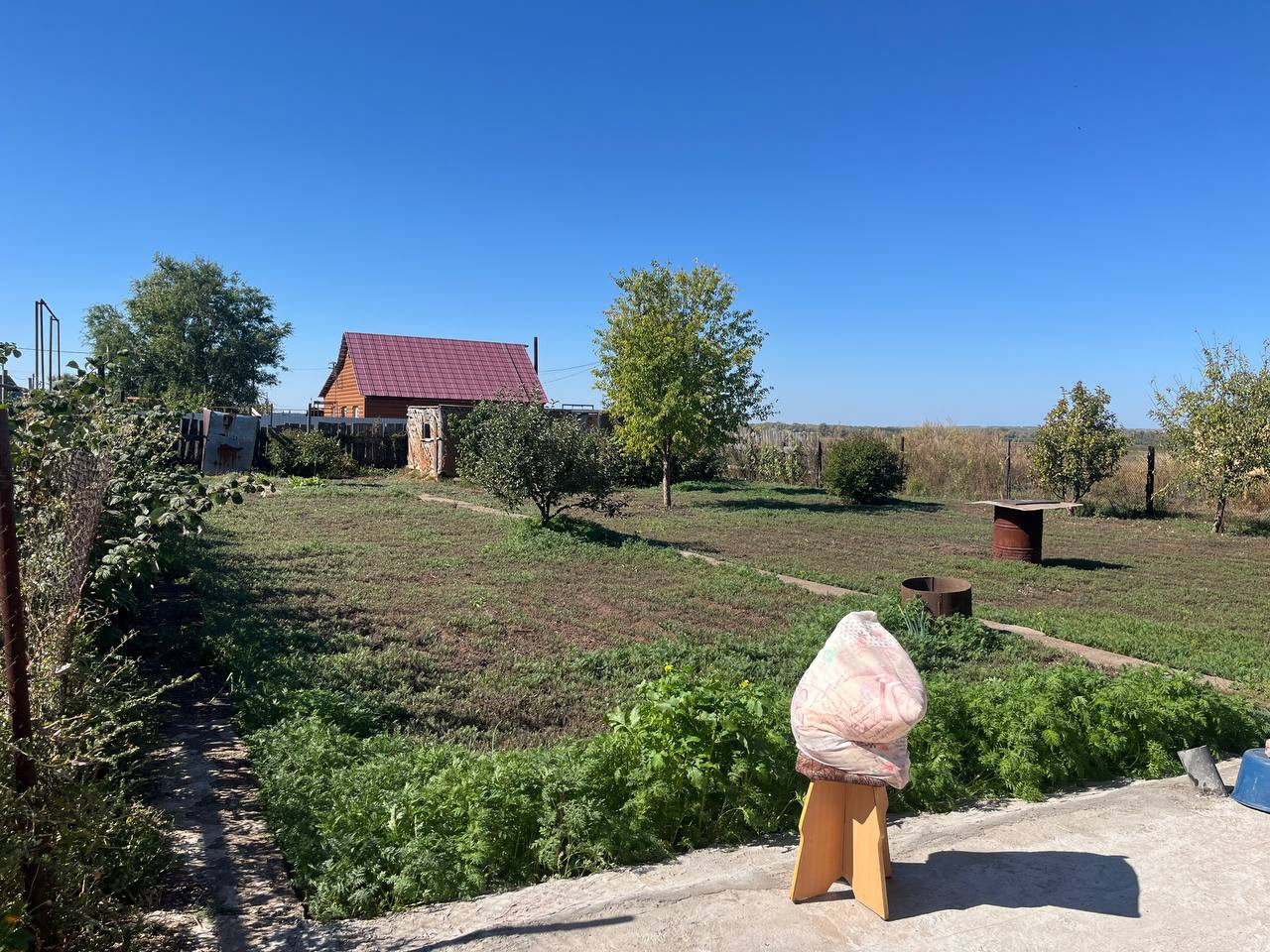 Участок полностью огорожен по периметру, залиты площадки и дорожки, посажены плодово-ягодные насаждения.