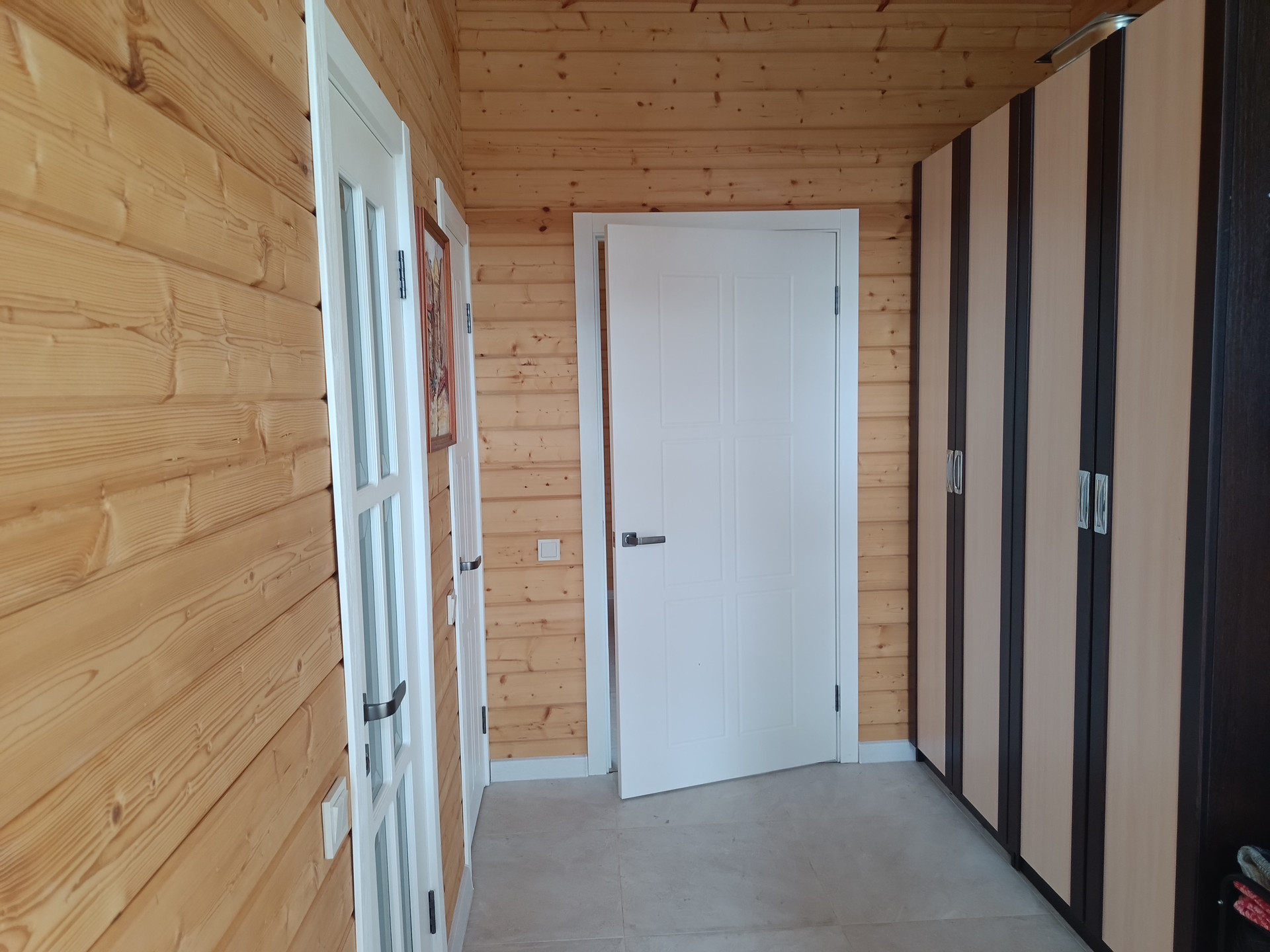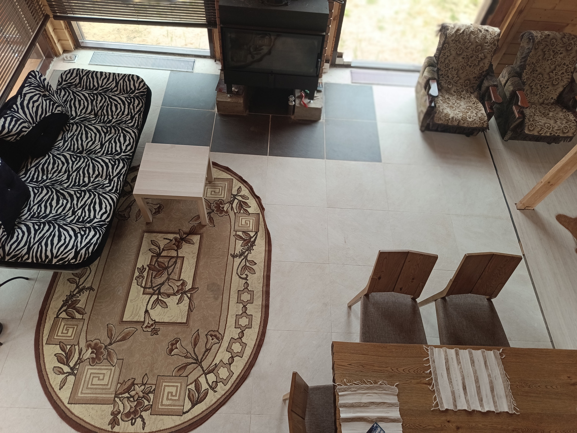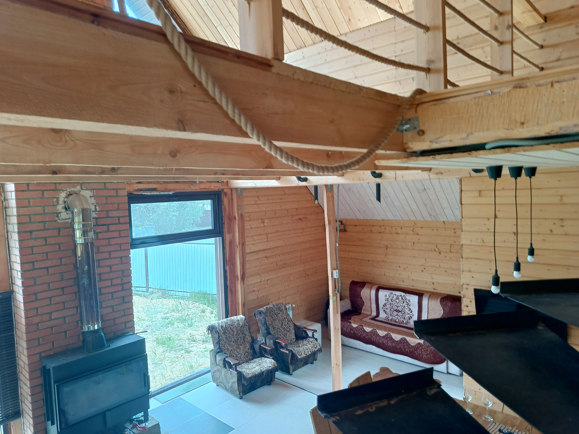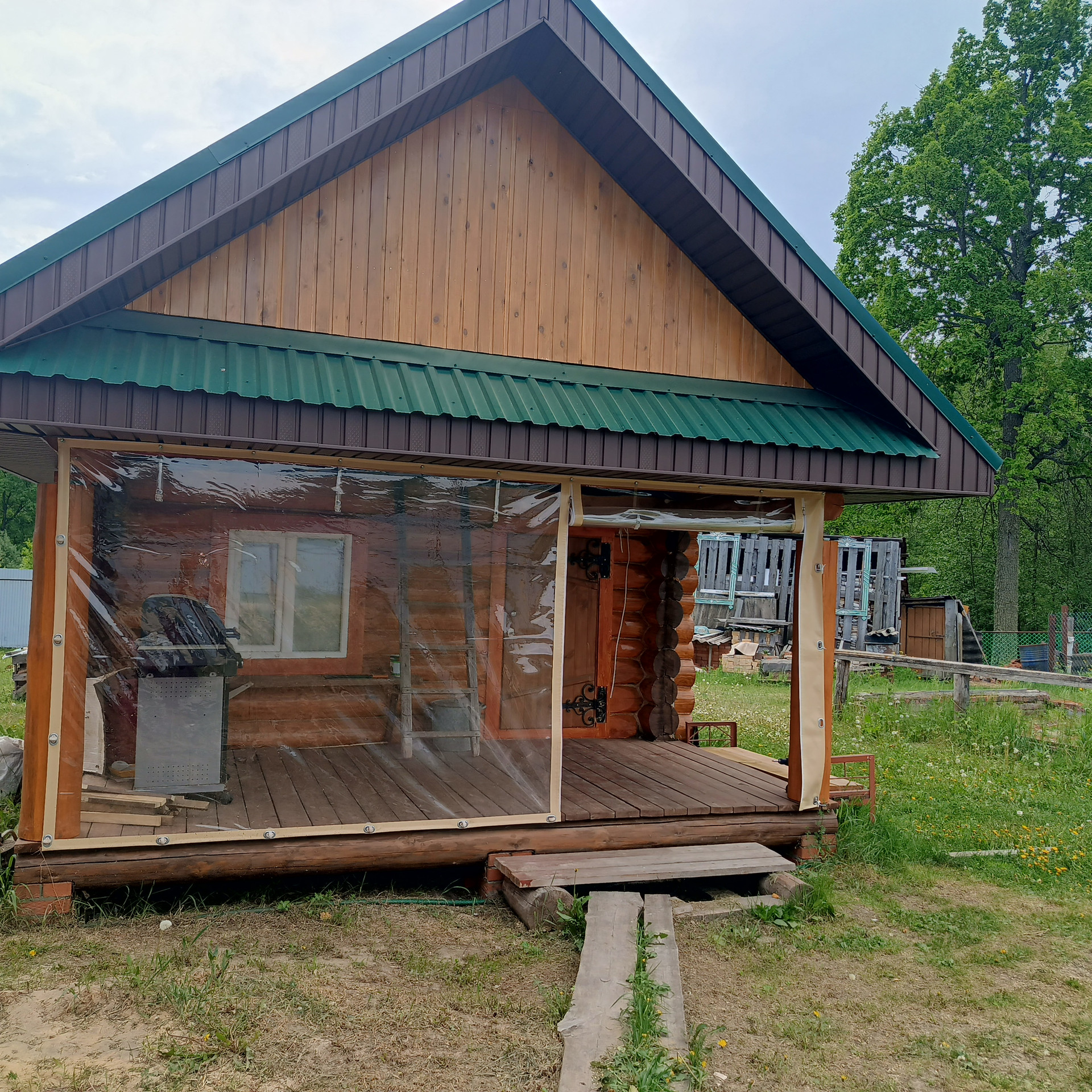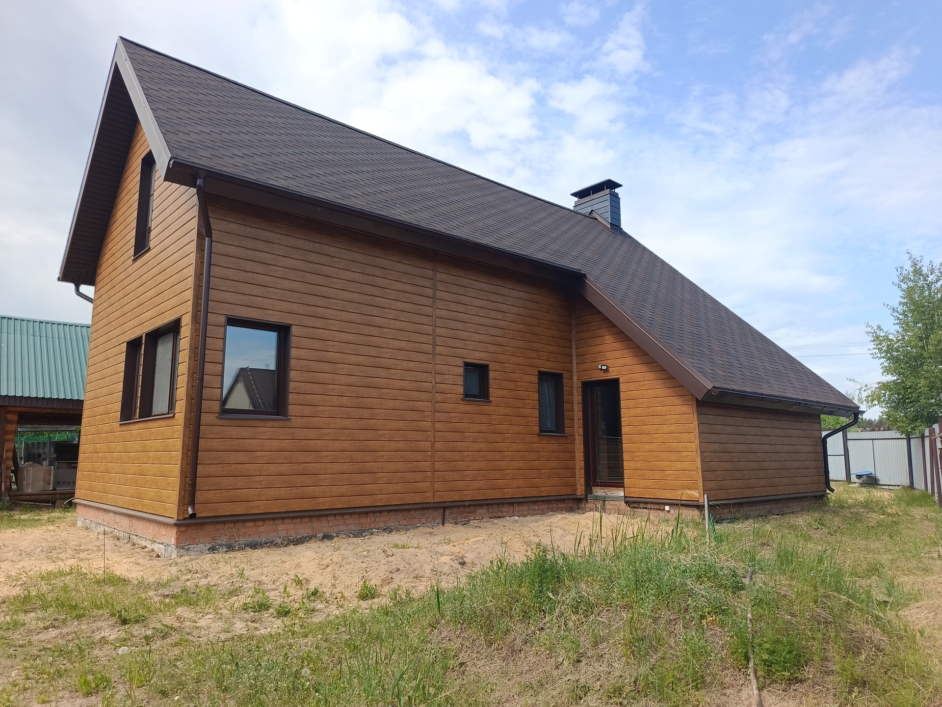 -КАРКАС ВЕРАНДЫ покрыт коричневым поликарбонатом 16 мм. КРЫША - финской мягкой черепицей фирмы "KATERAL" с вентилируемым коньком площадью 160 кв.м, толщина утепления крыши 300 мм. в доме уложен на полу керамогранит, в комнатах ламинат 33 класса.