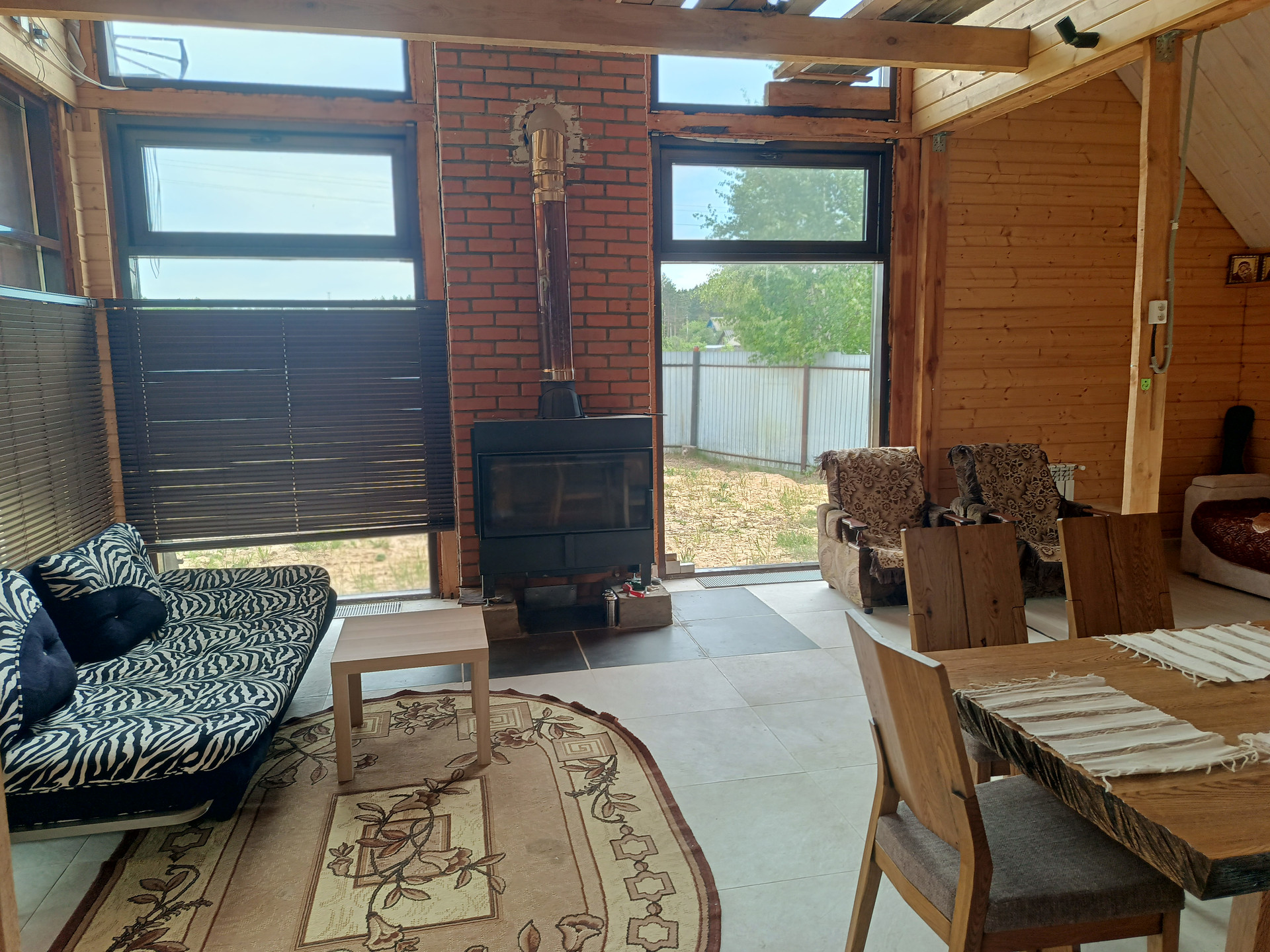 -ОСТЕКЛЕНИЕ панорамное , второй свет и гостинная, профиль алюминий "Татпроф" (двойной стеклопакет из каленого стекла толщиной 6 мм), все остальные окна - из пластика с ламинацией и тройными стеклопакетами фирмы "BRASHBOX".