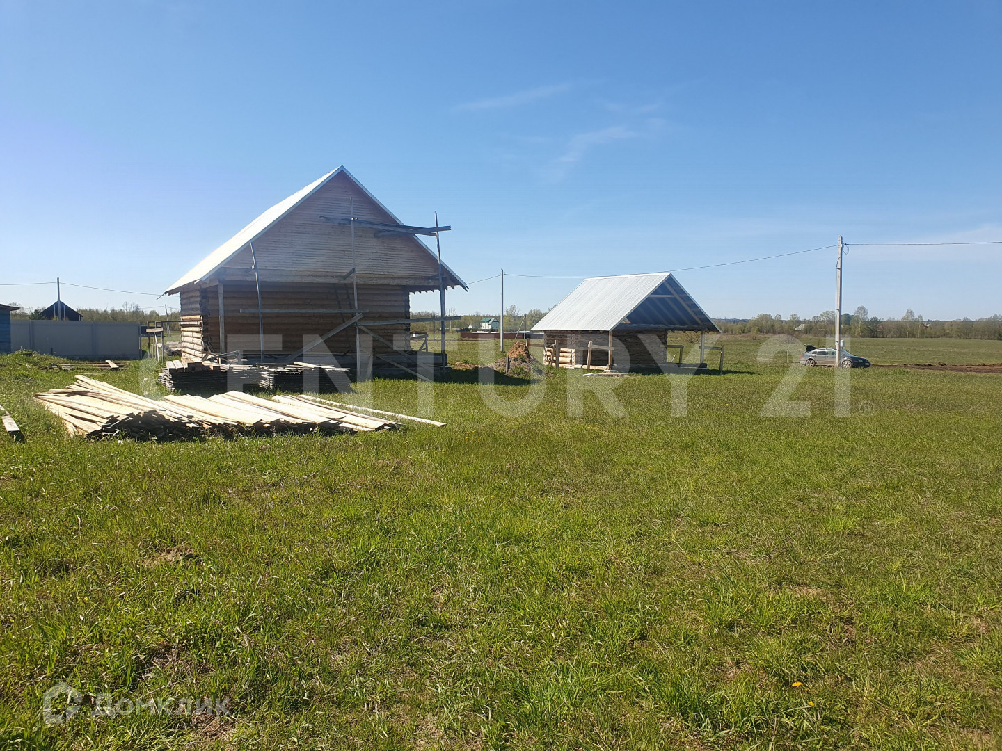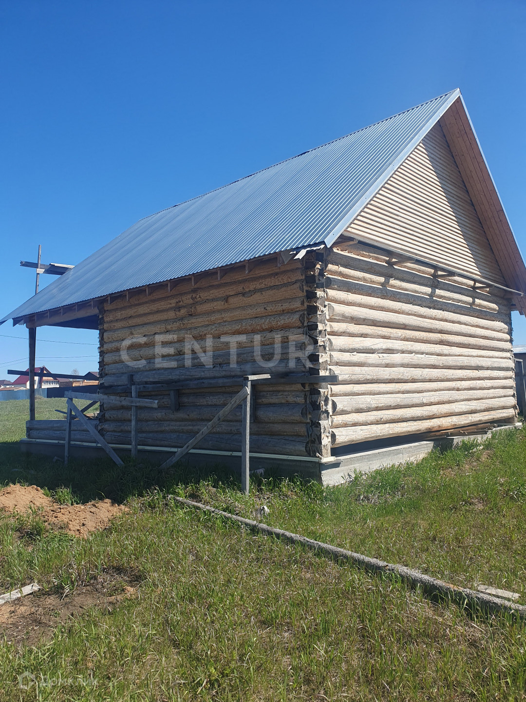 На участке поставлен дом - сруб 6*8 кв.м. из шлифованного бревна, под крышей (профнастил с утепление) с выносом 4 кв.м., под одной крышей, фундамент ленточный, канализация септик на 3 кольца, газ по границе участка,