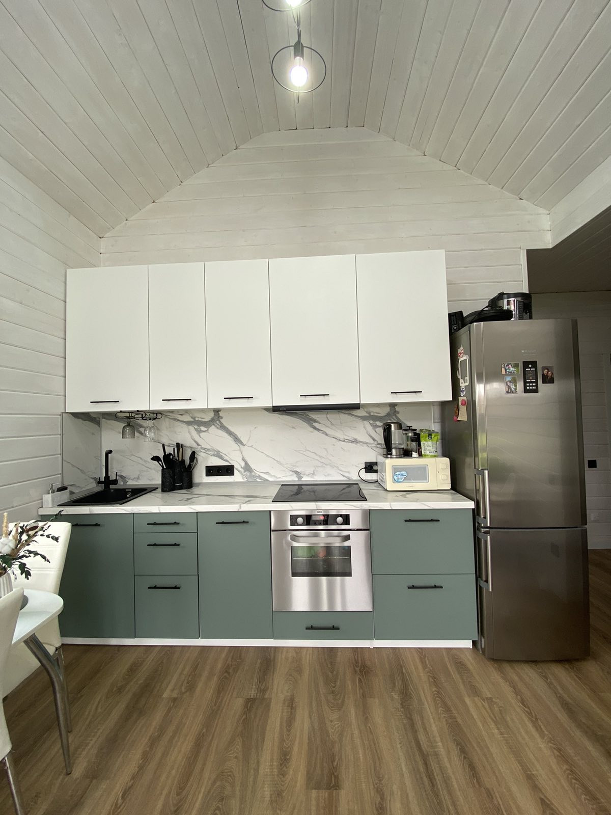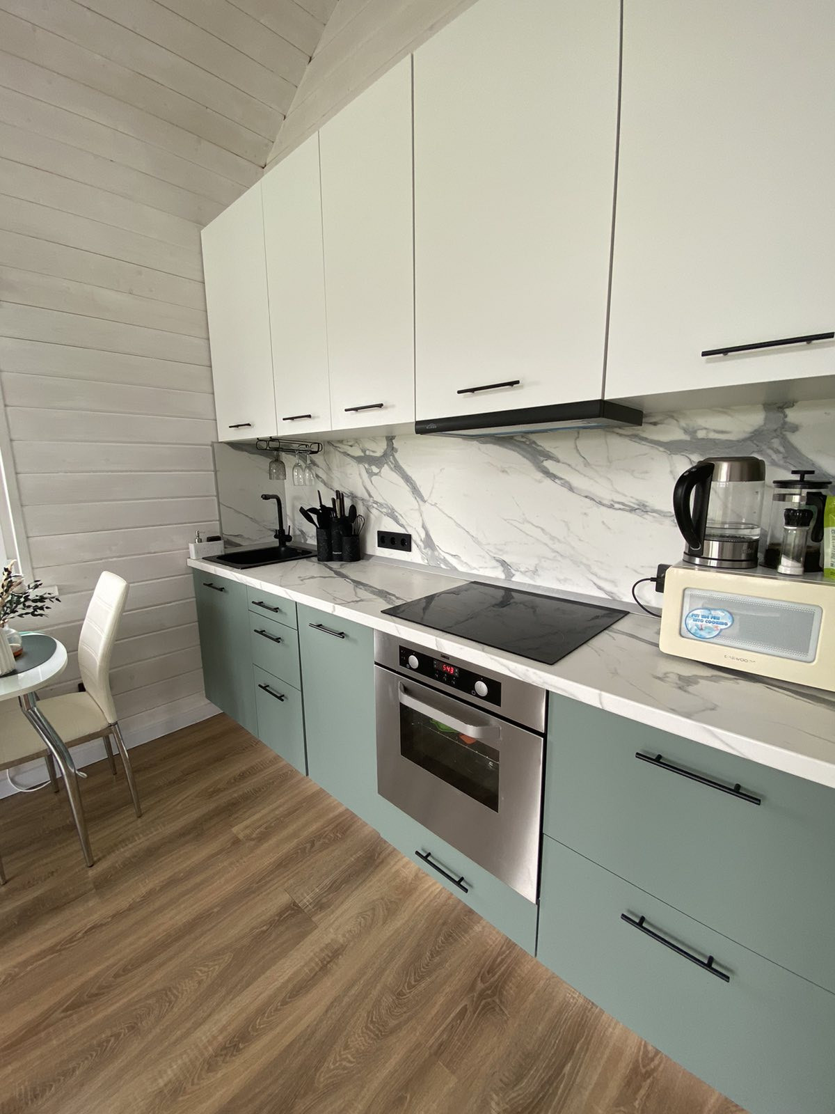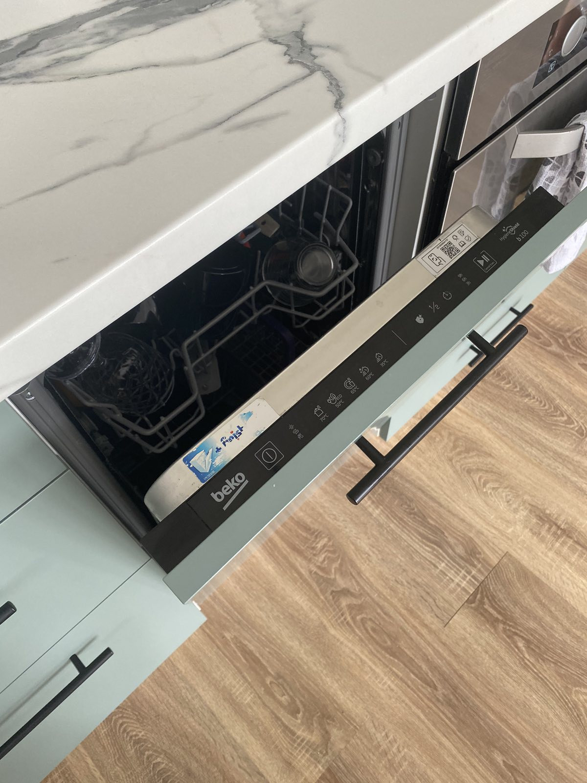 - качественная кухня с хорошей фурнитурой, доводчиками, встроенной техникой: посудомоечная машина Веко, вытяжка, электрическая варочная панель, электрический духовой шкаф