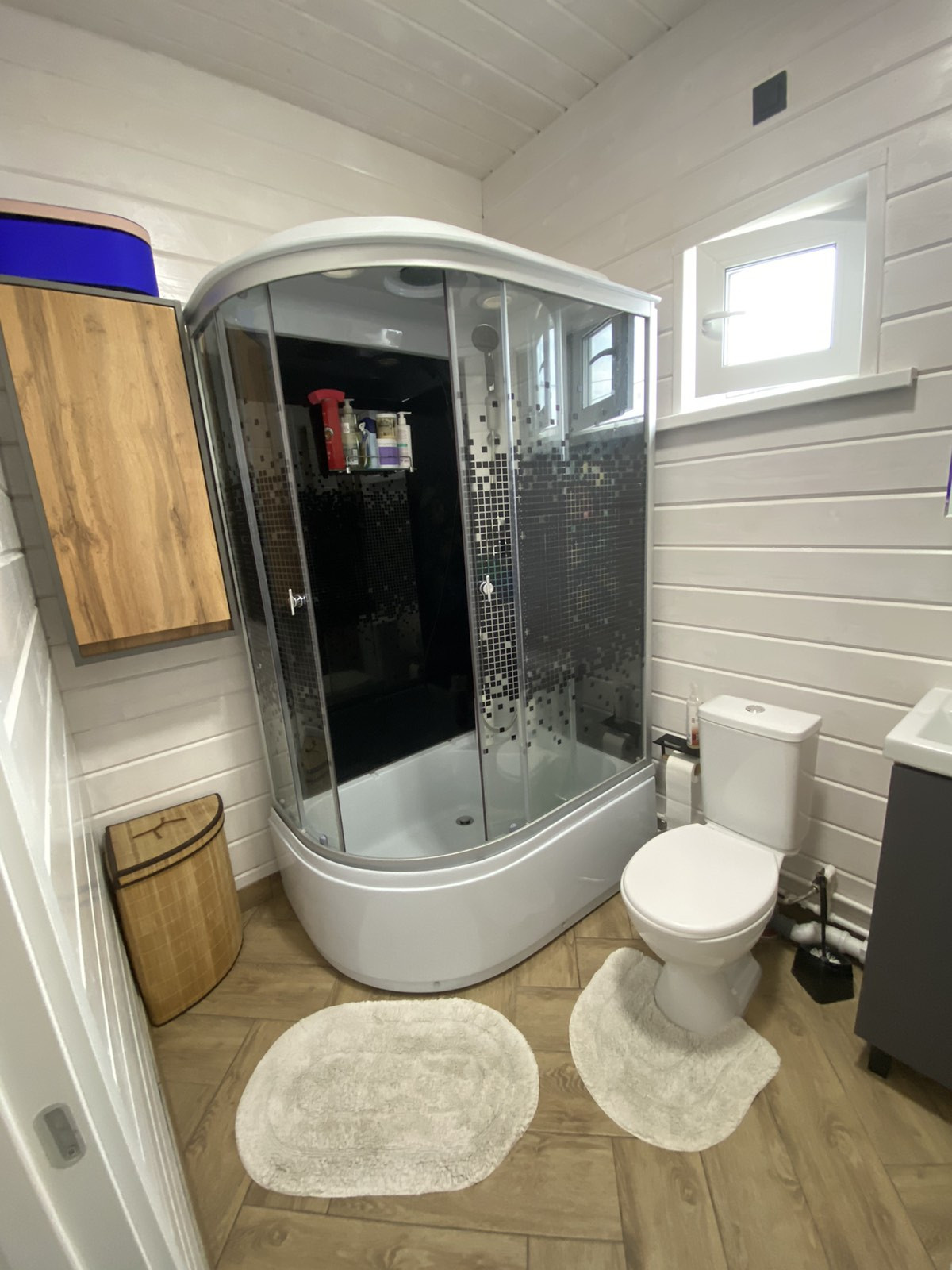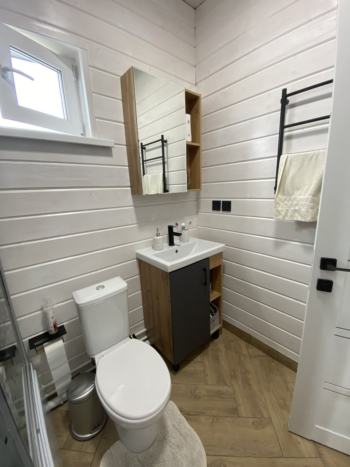 - в санузле покраска пропиткой для бань и саун (можно мыть!), на полу керамогранит, сделан тёплый пол