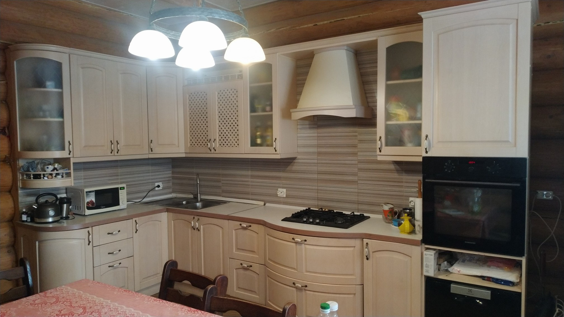 На первом этаже расположены: прихожая, спальня, уютная гостиная с панорамными окнами, большая кухня, оборудована кухонной мебелью, техникой, посудомойкой. Полы в комнатах дубовый паркет. Также есть душевая комната с окном, хозяйственная кладовая с водяным бойлером ariston на 120 литров. Душевая комната отделана кафелем, полы с электрическим подогревом.