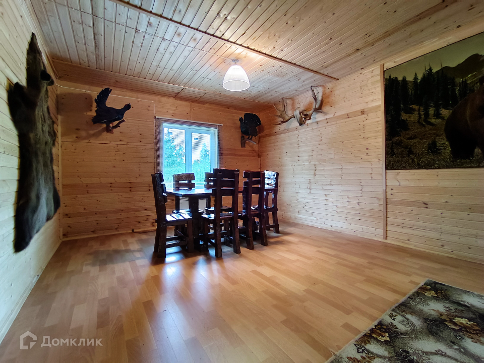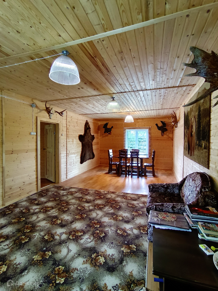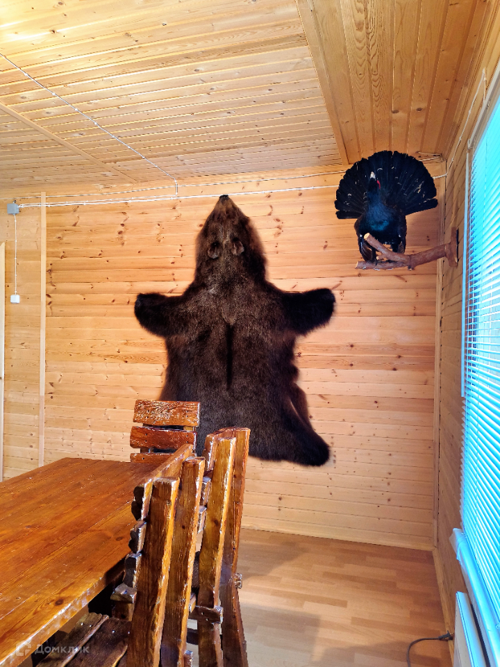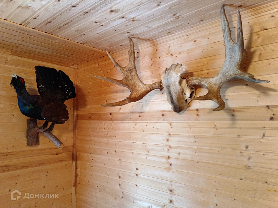 Каждая спальня полностью оснащены под сдачу, гостиную украшает шкура медведя, чучела тетеревов, рога оленя и лося.