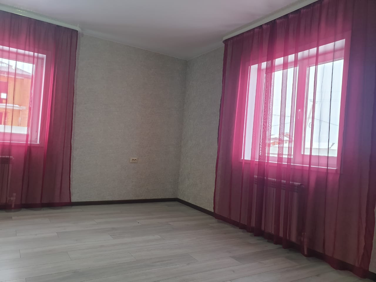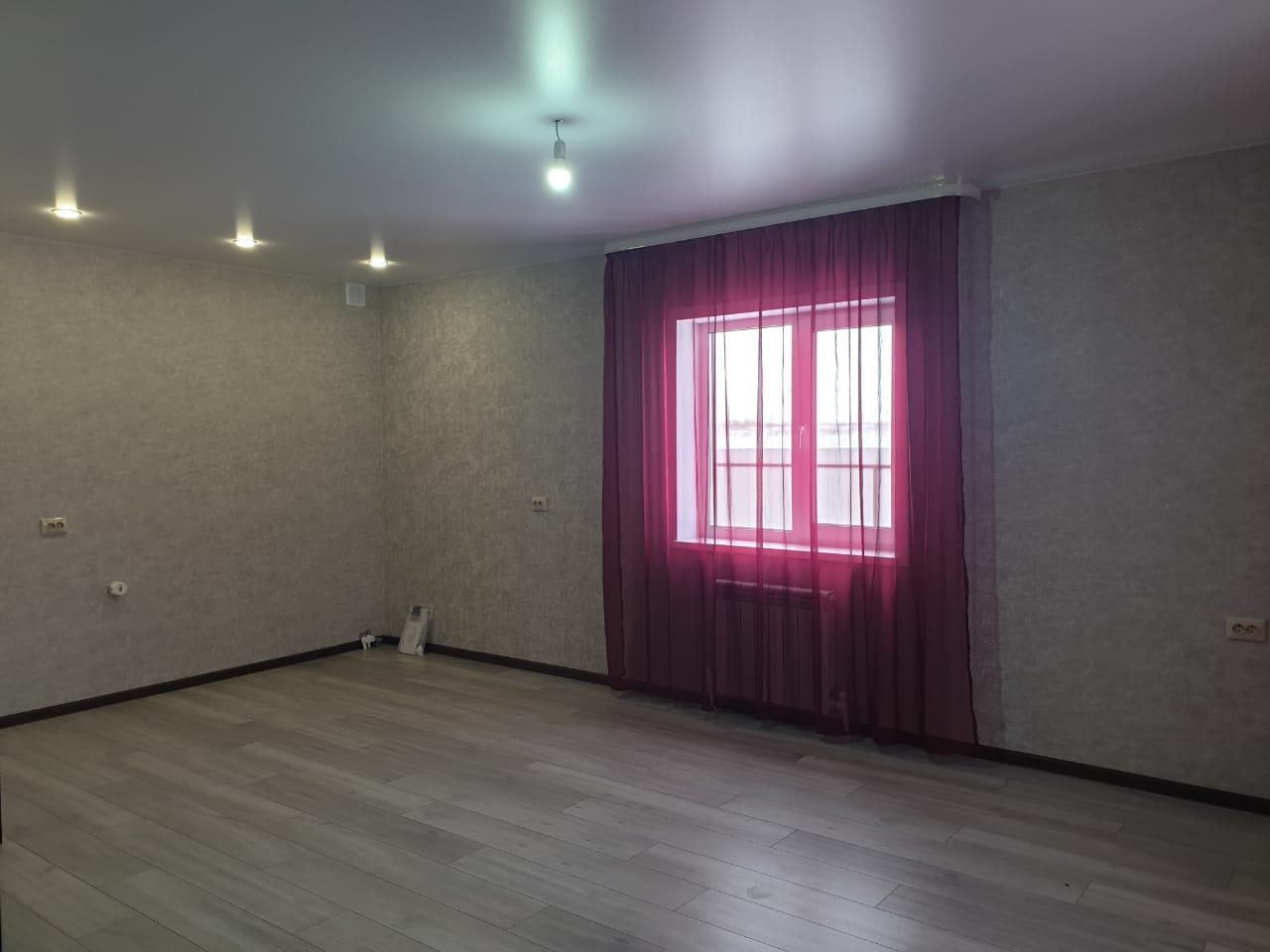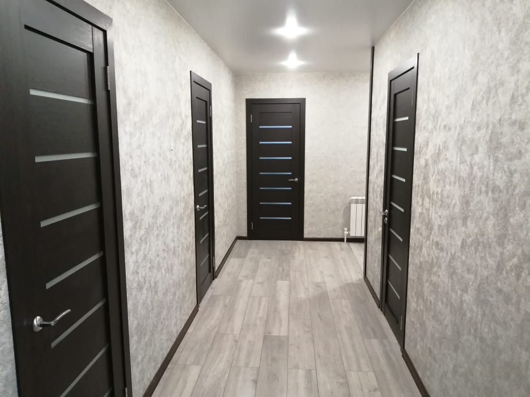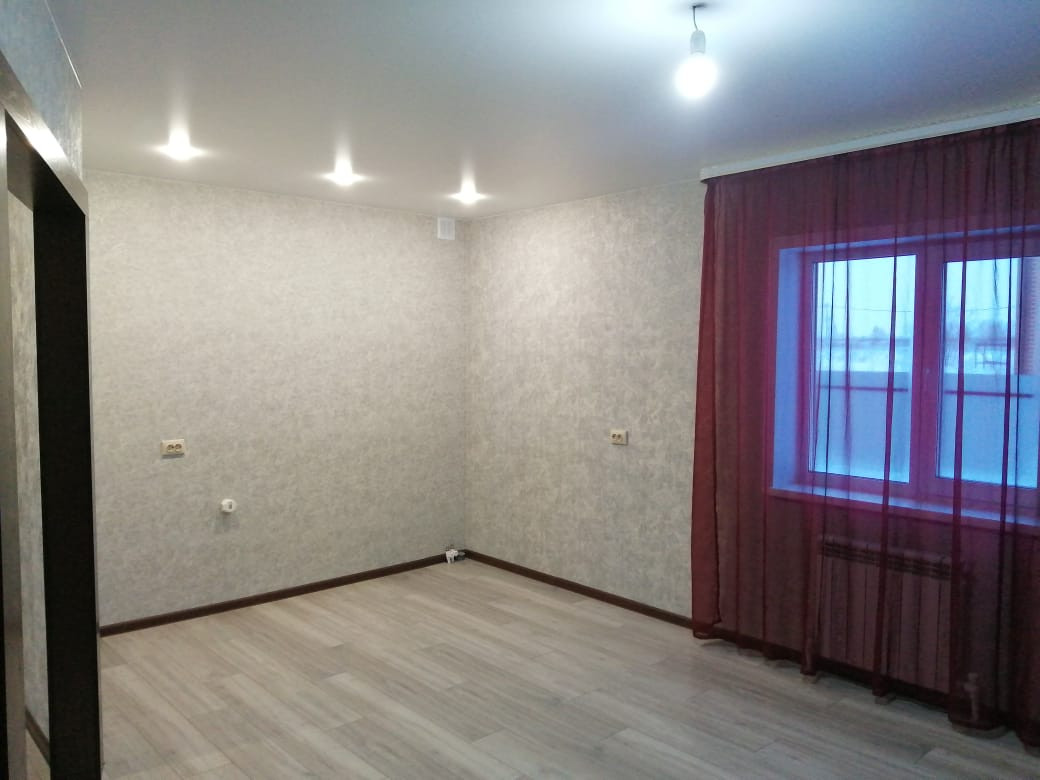 На полу ламинат, натяжные потолки, высокого качества окна и двери.