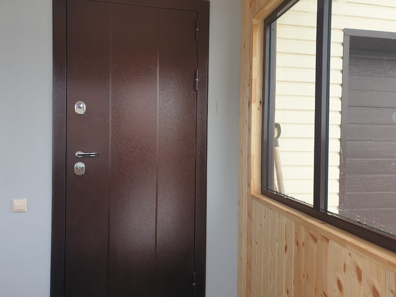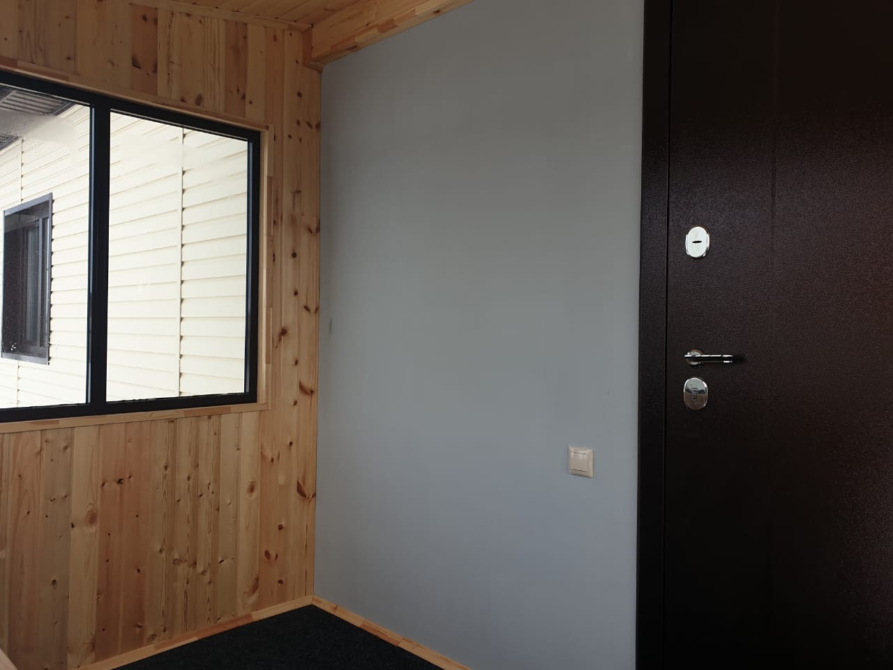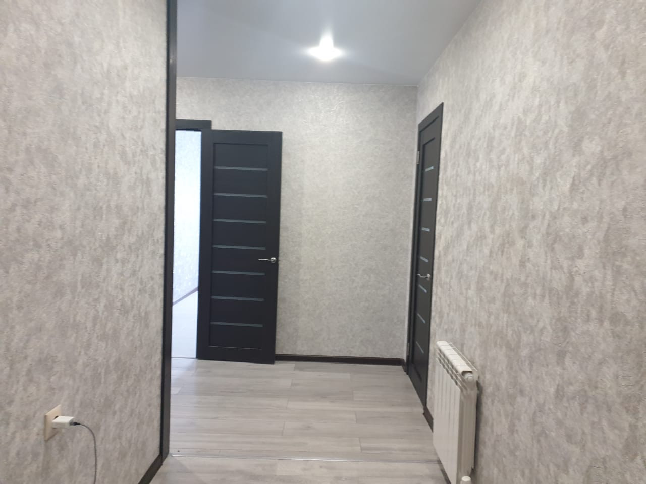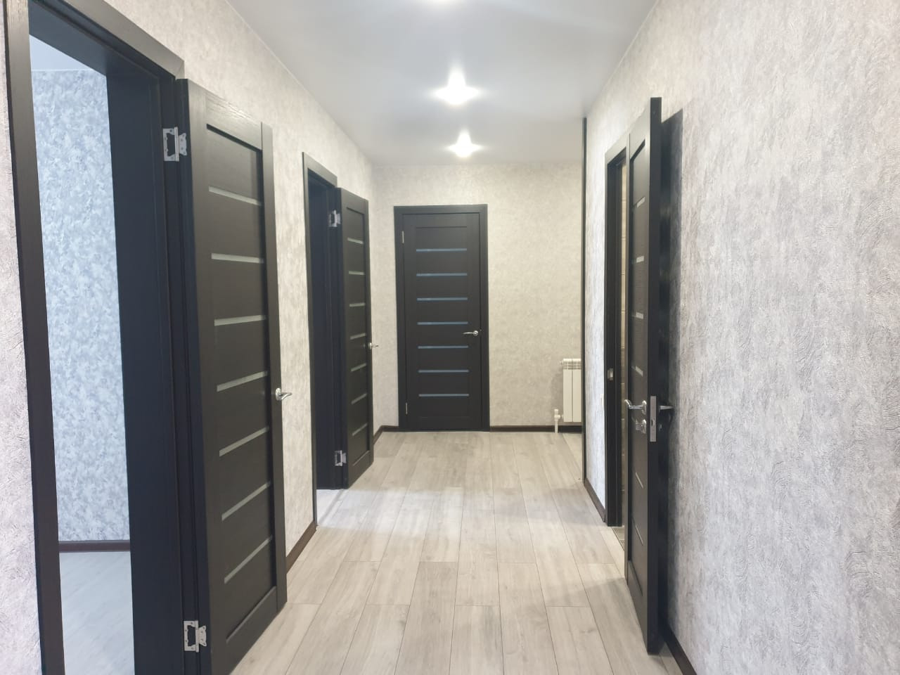 На полу ламинат, натяжные потолки, высокого качества окна и двери.