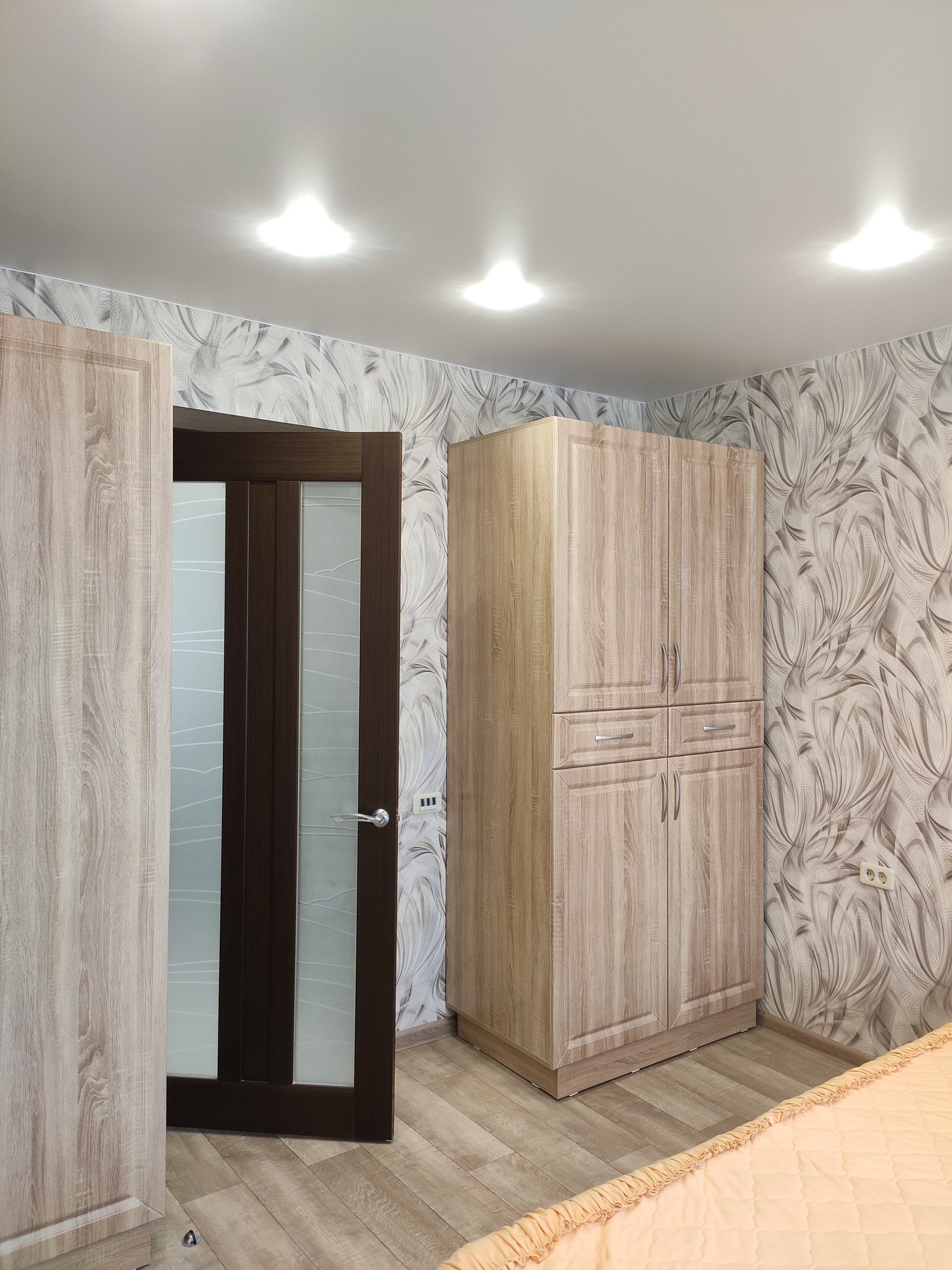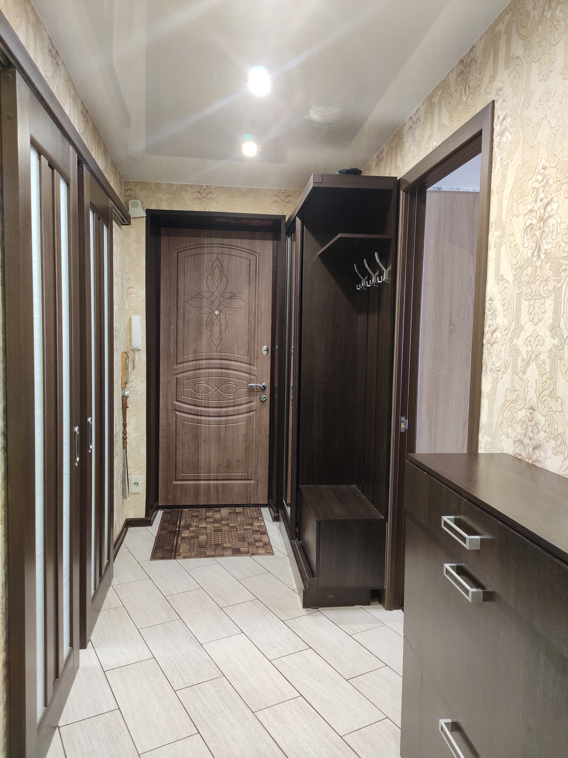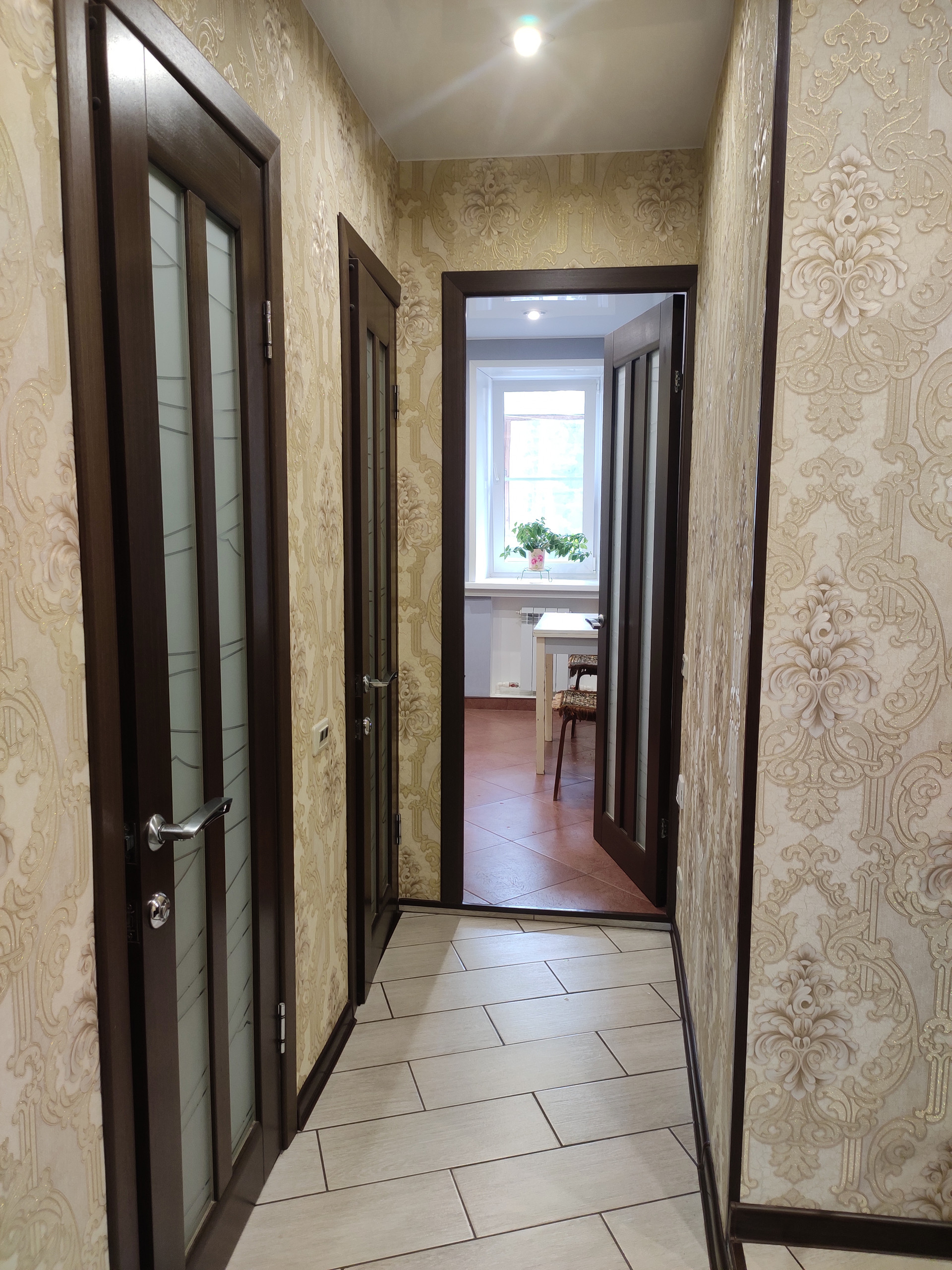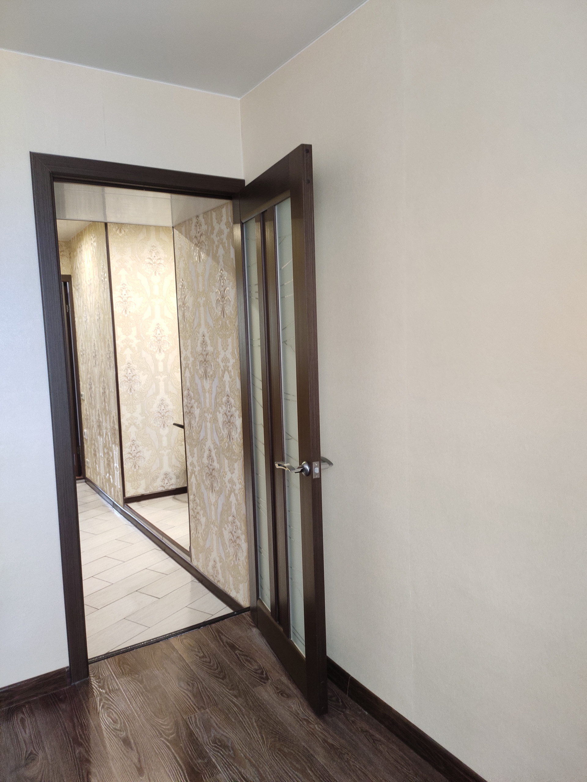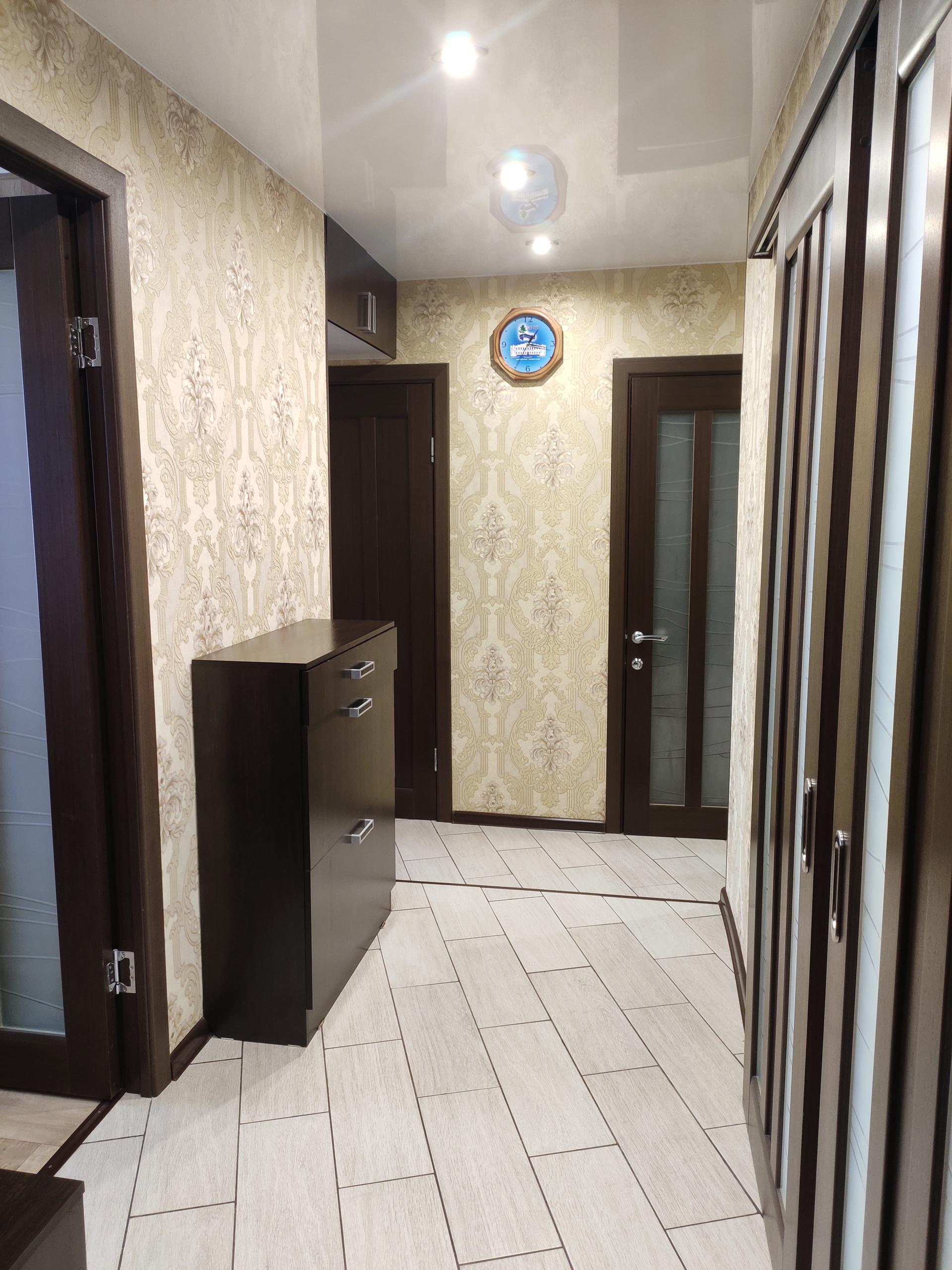 в квартире сделан ремонт. Полы: прихожая, кухня, ванная, туалет - кафель. В двух комнатах полы: ламинат. Потолок подвесной, натяжной. Окна ПВХ, трубы п/п, установлены счётчики. Установлена новая входная дверь.
