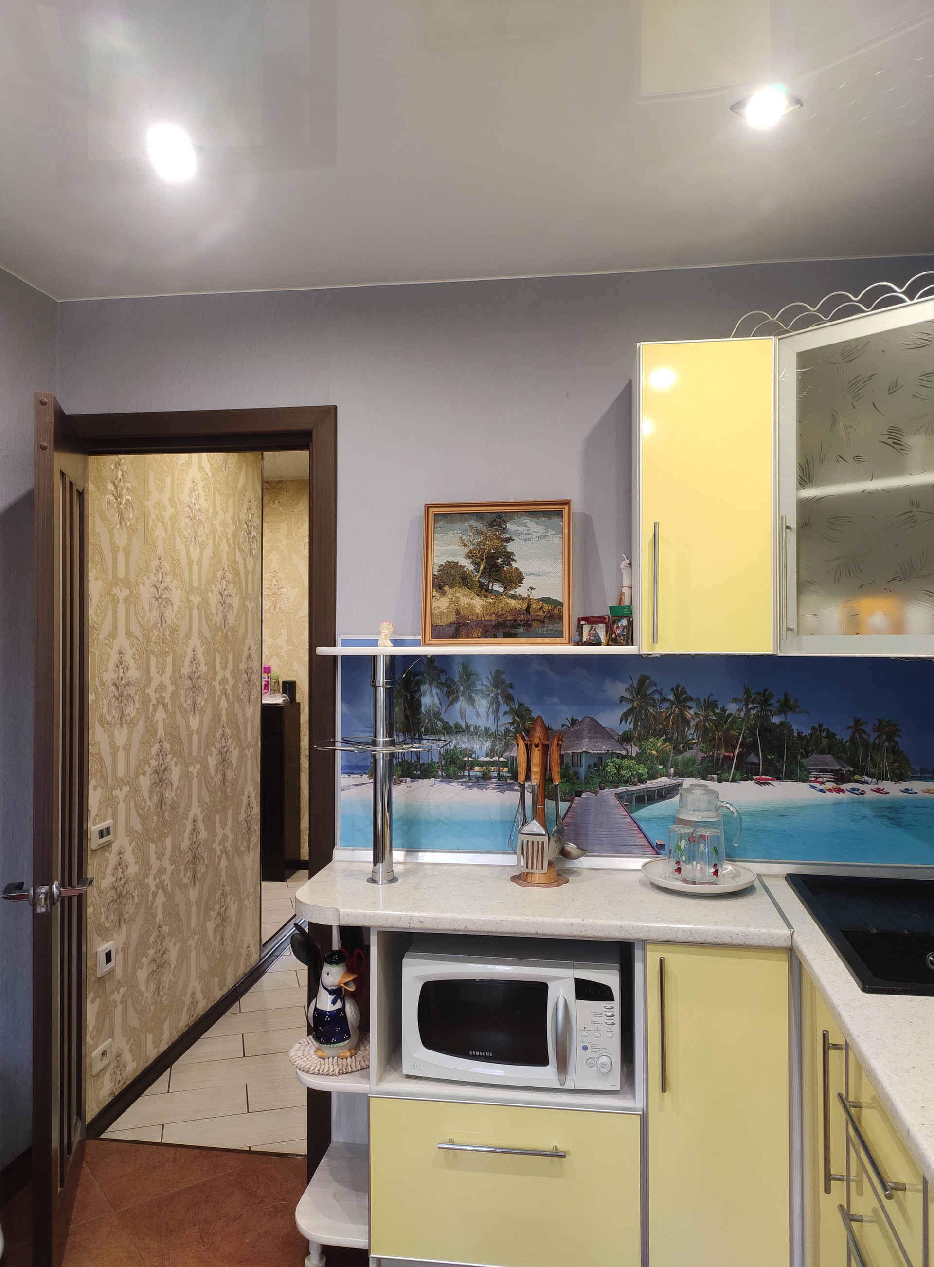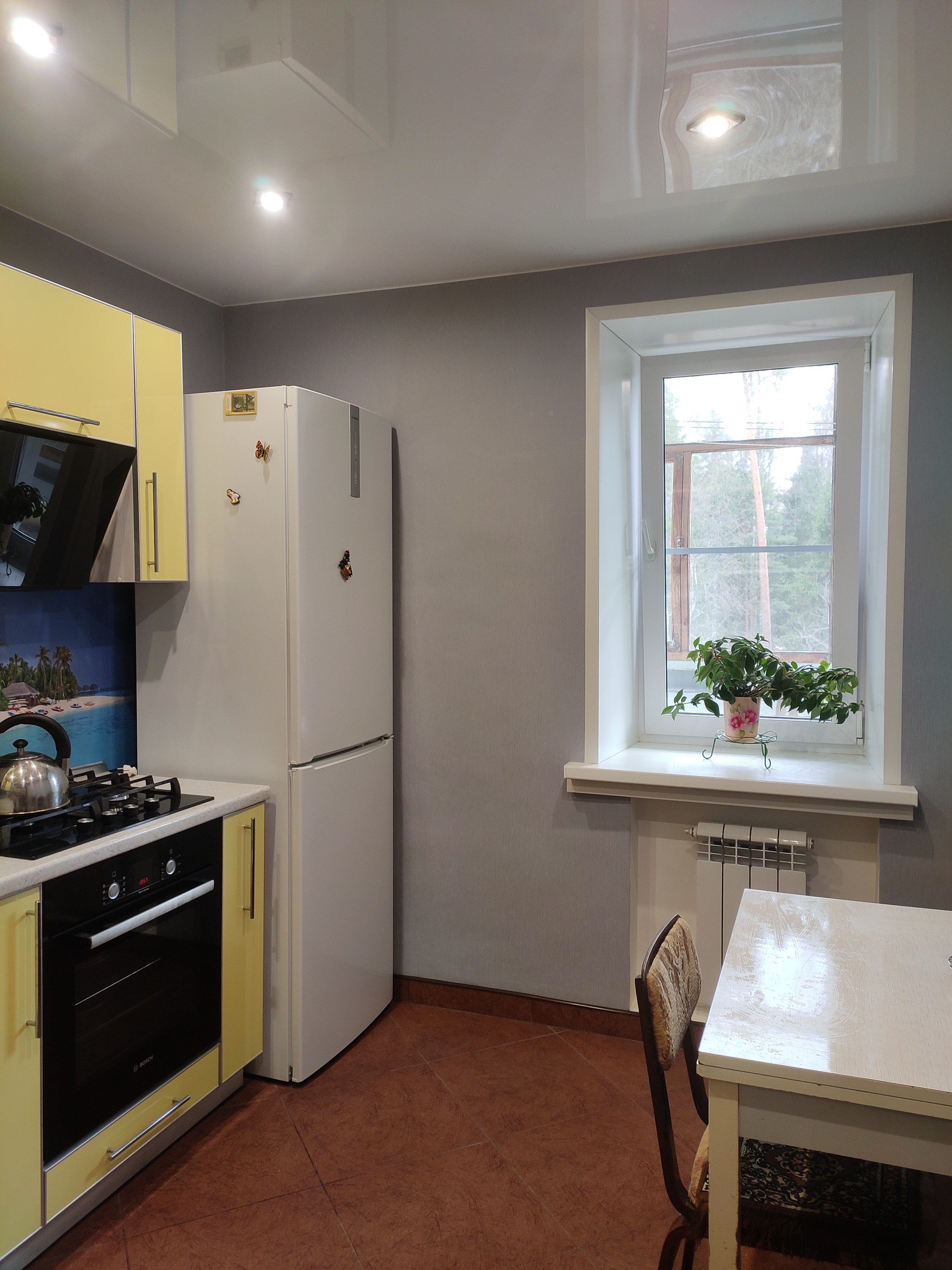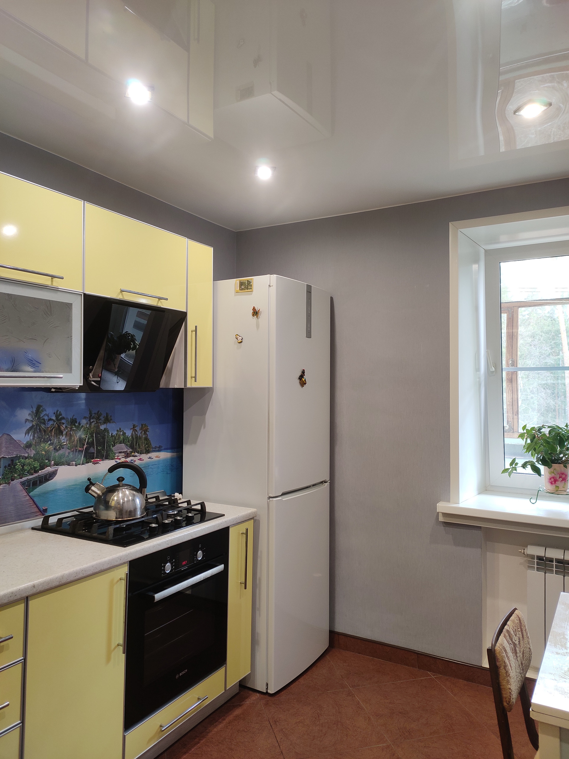 Кухня с встроенным кухонным гарнитуром, пол на кухне - кафель, тёплый.
