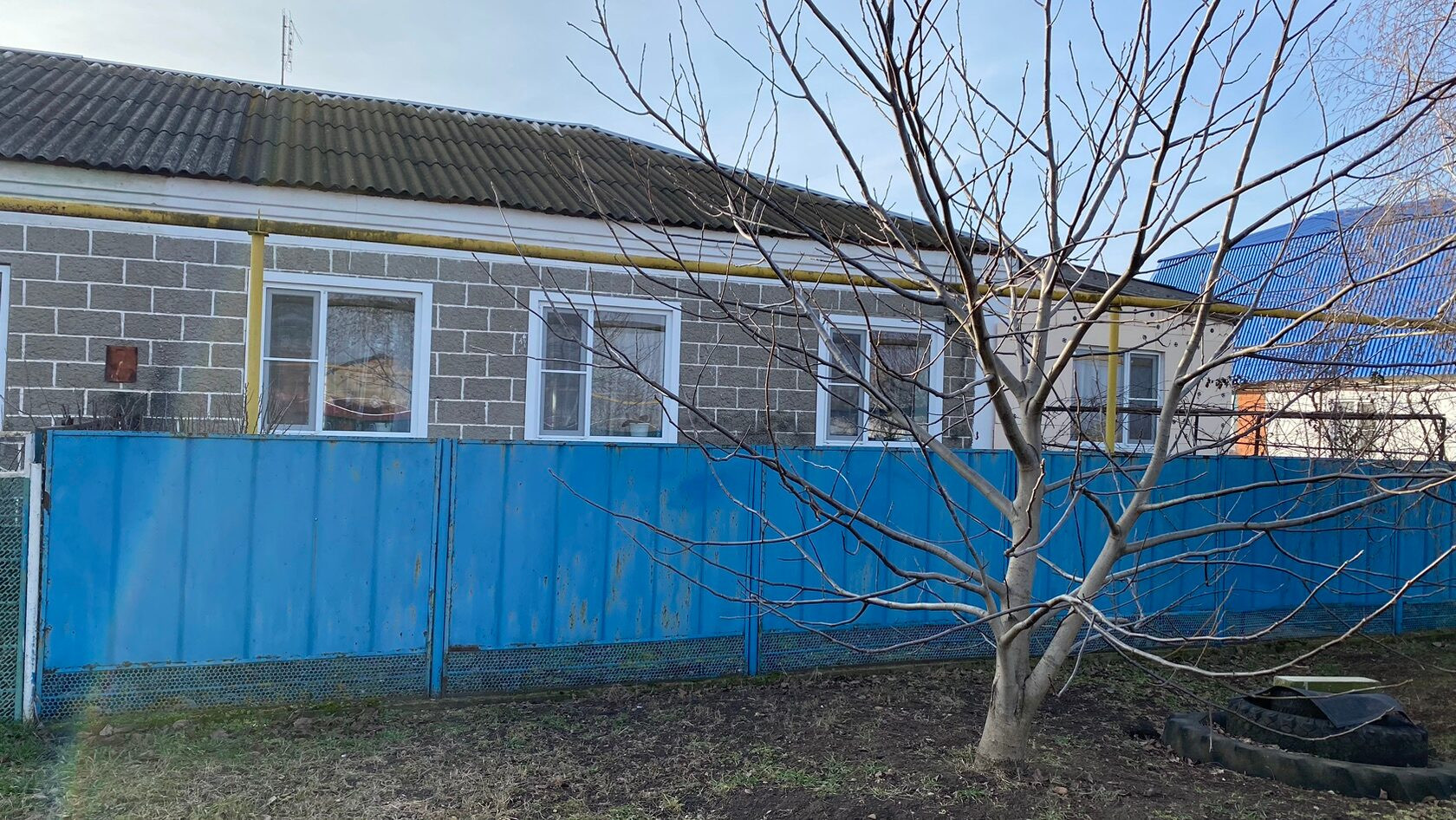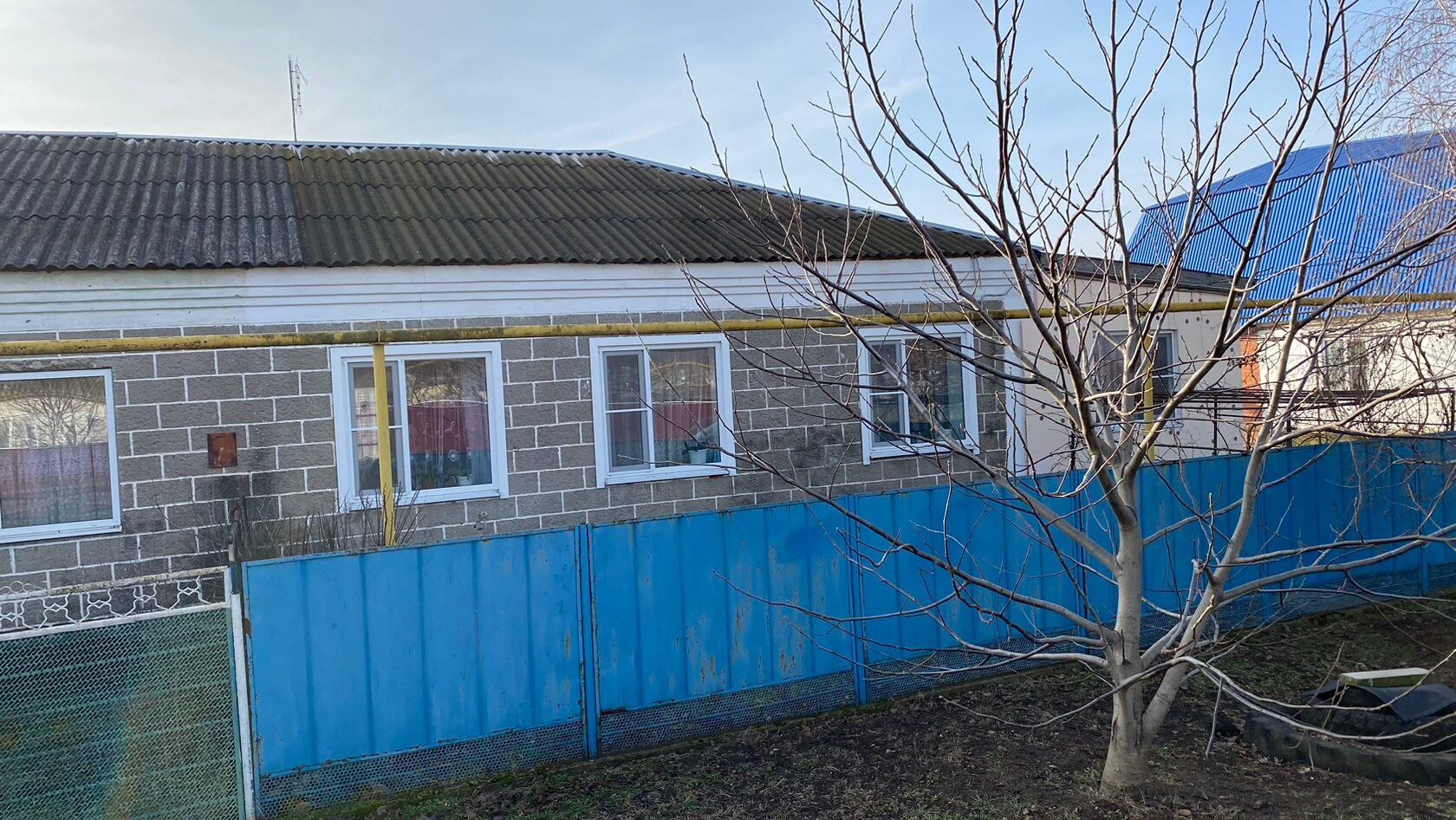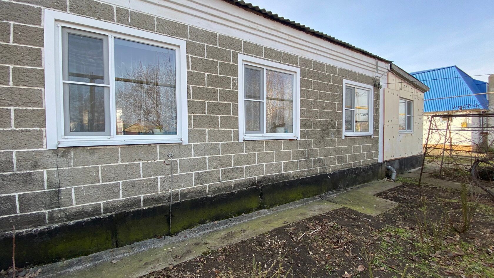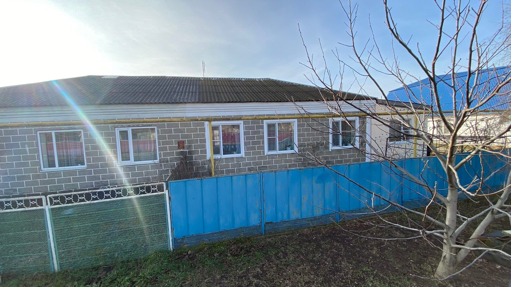 Год постройки домовладения 1983 год. Дом блочный, крыша Шиферная, окна металлопластиковые. По фасаду у нас стоит металлический забор, длина фасада составляет 16 м. Глубина двора составляет 96 м.
