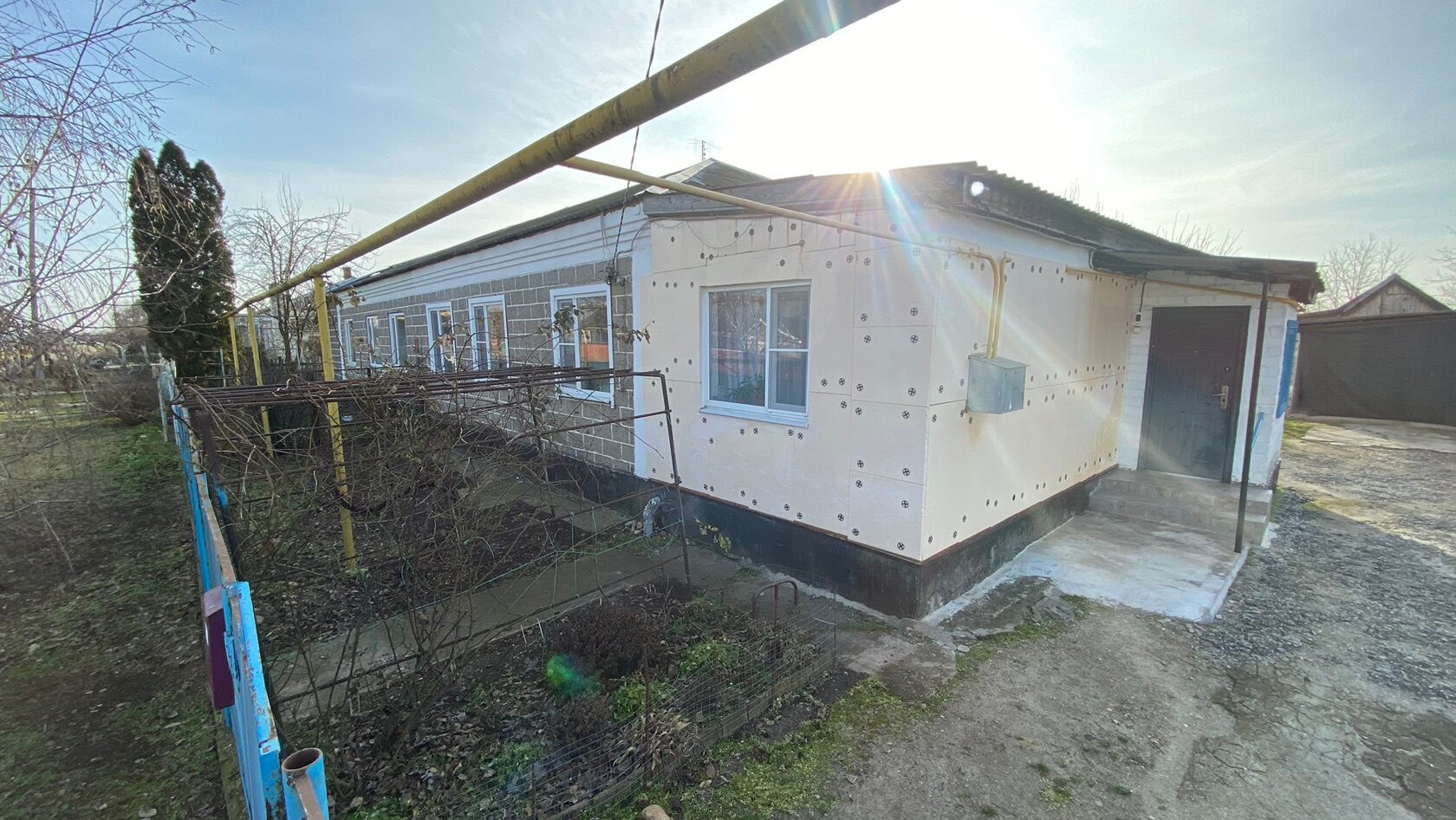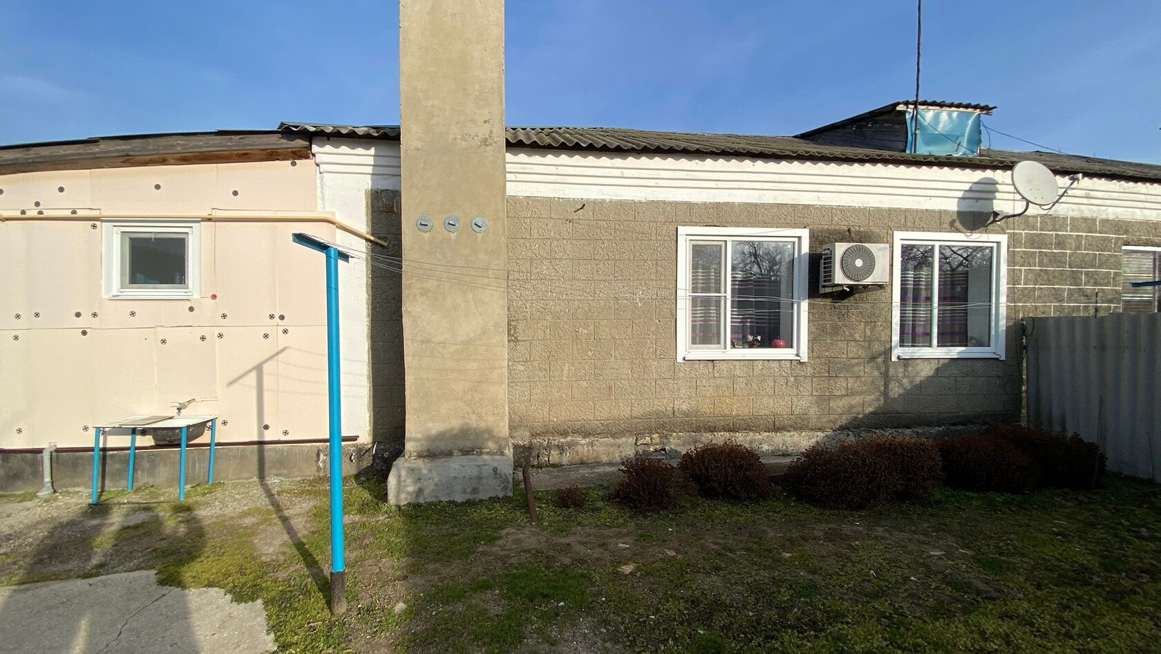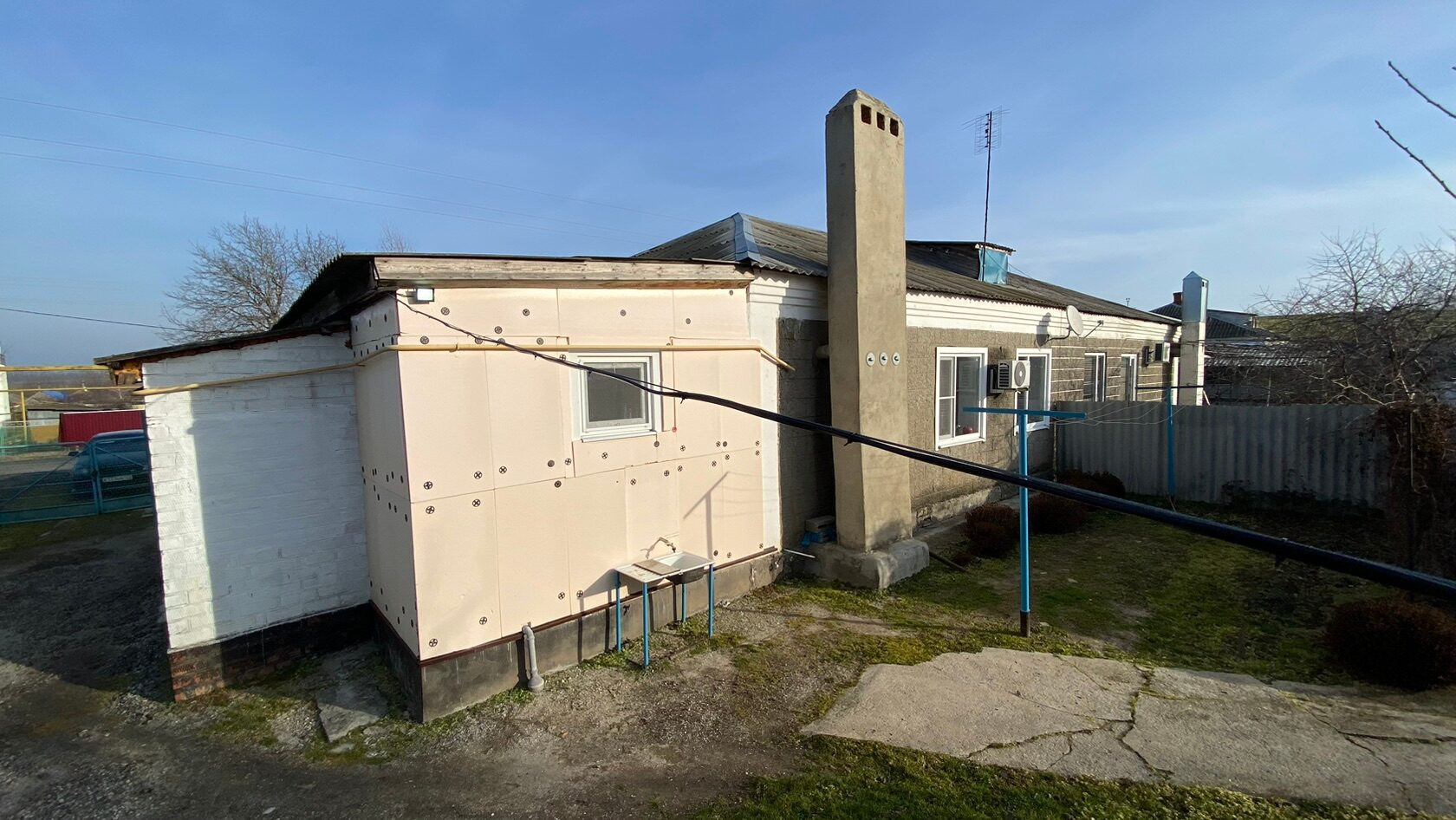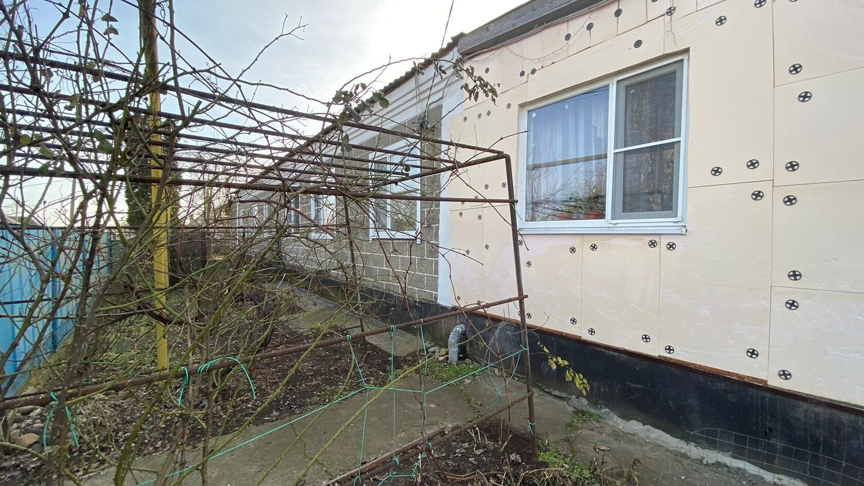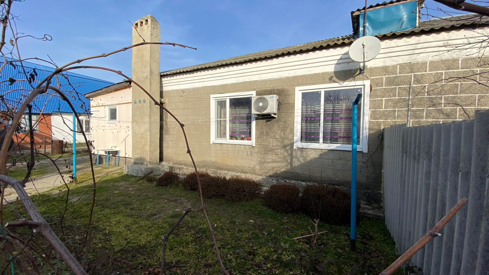 Год постройки домовладения 1983 год. Дом блочный, крыша Шиферная, окна металлопластиковые. По фасаду у нас стоит металлический забор, длина фасада составляет 16 м. Глубина двора составляет 96 м.