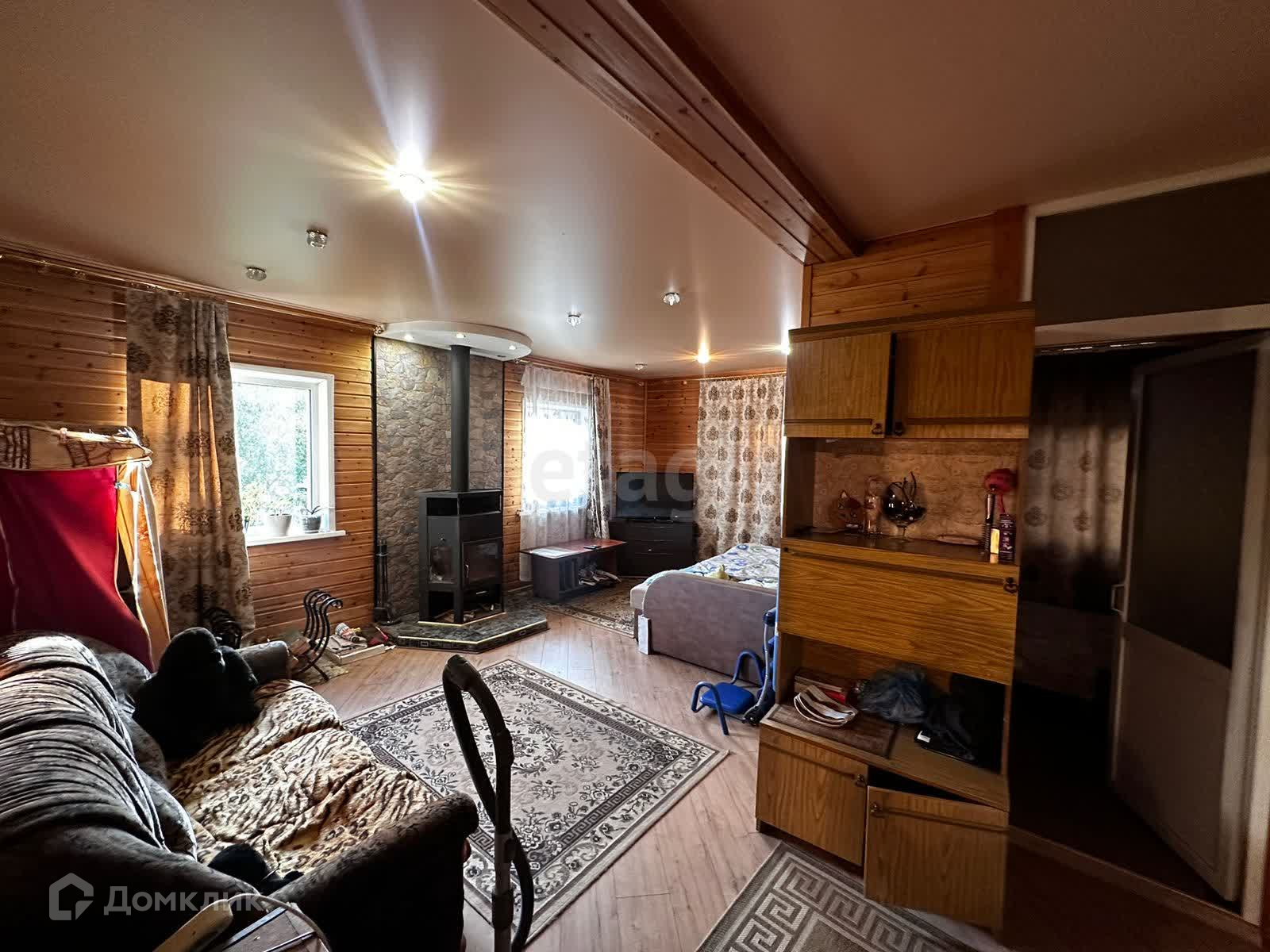 Двухэтажный, четырехкомнатный дом из бруса, с внутренней отделкой из кедра, наличием душа и санузла, натяжными потолками, камином, пластиковыми окнами, наружная отделка сайдинг.