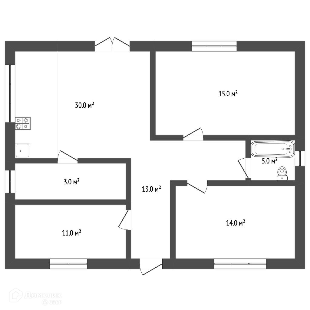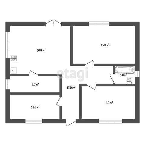 Планировка - Холл 13 м2, кухня-гостиная 30 м2 с выходом во двор, 3 комнаты (14+15+11м2), ванная комната 5 м2, тех.помещение 3 м2.