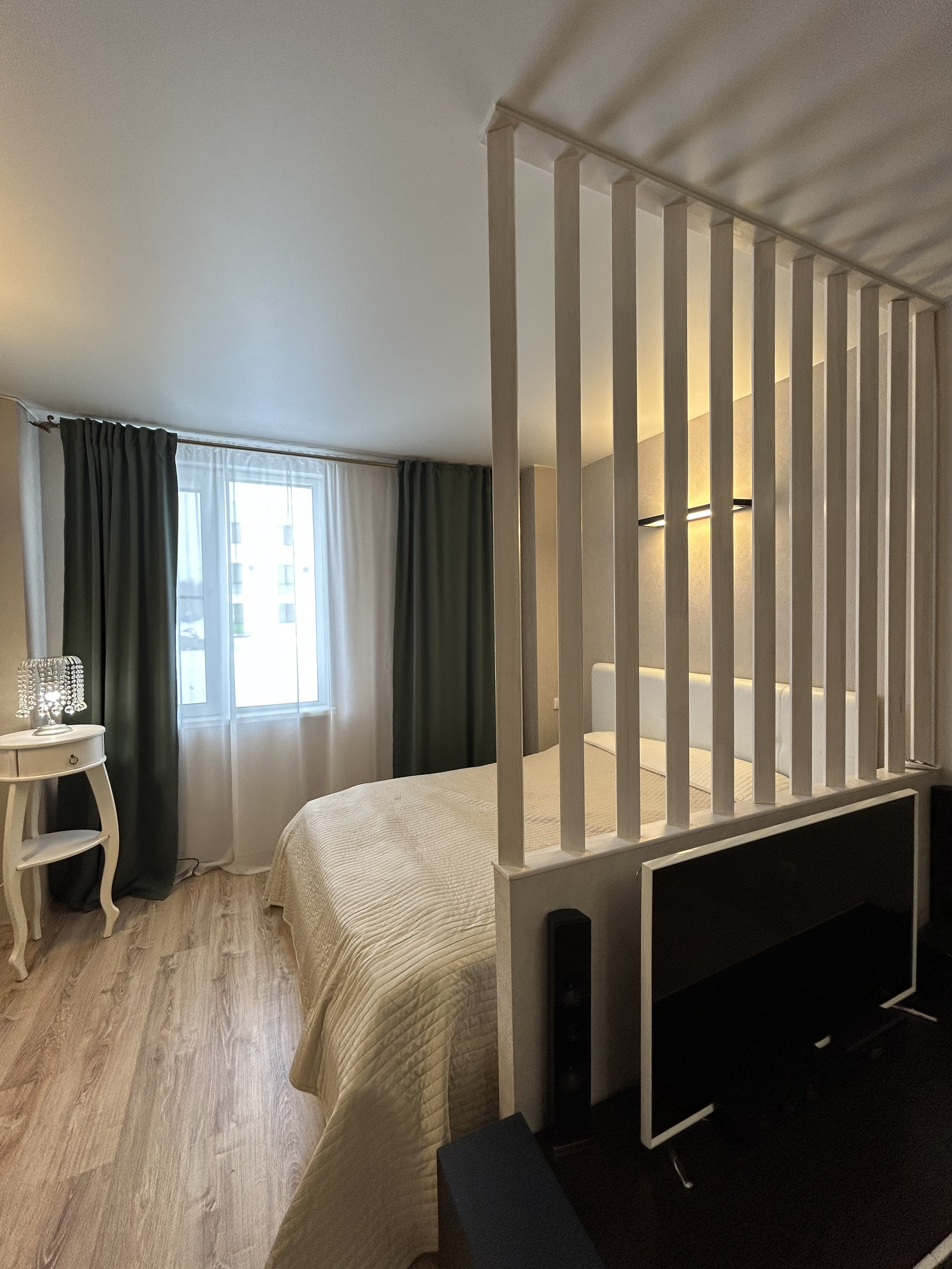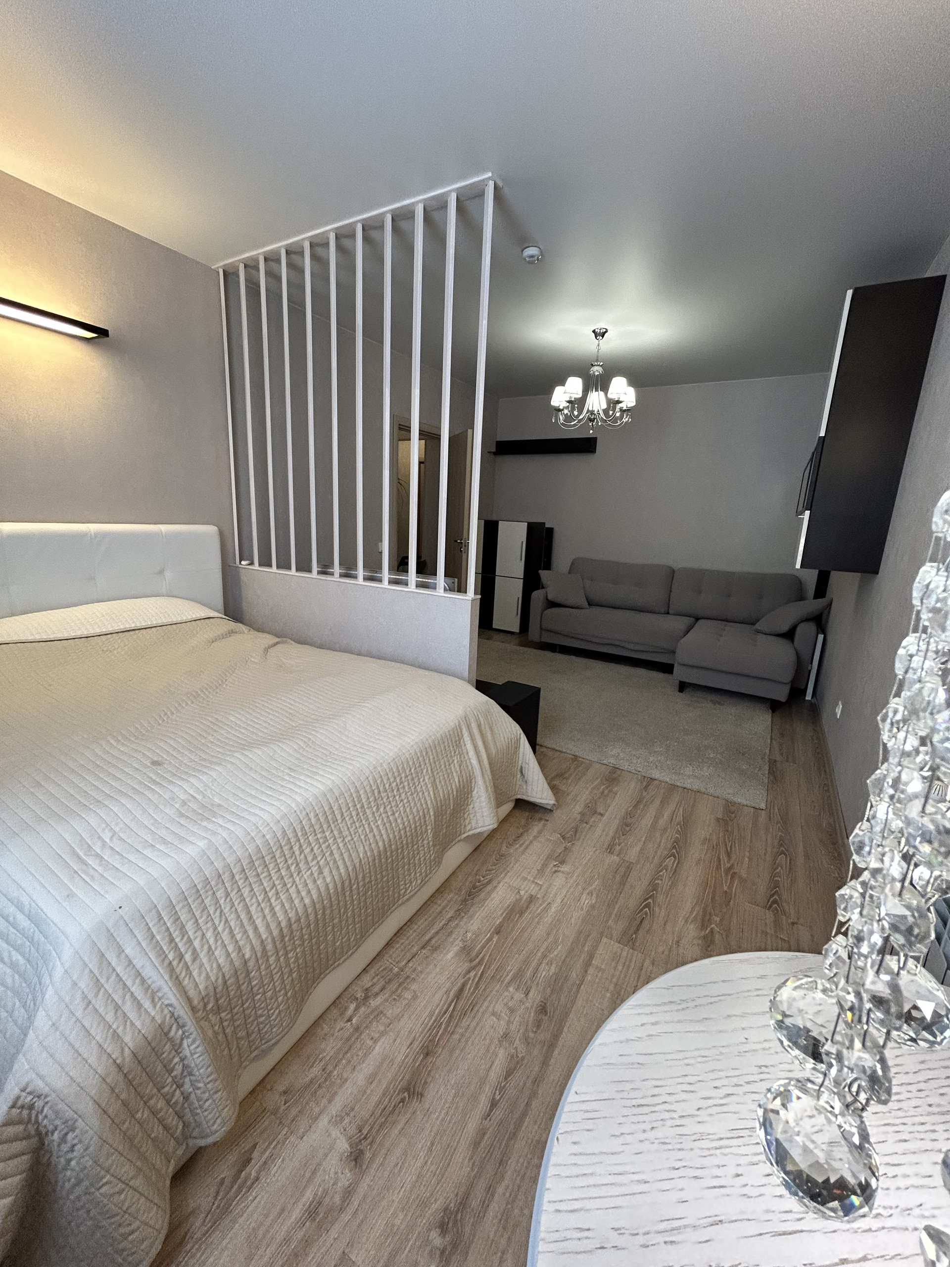 Разделена современной перегородкой, что позволяет грамотно зонировать мебель. Не съедая при этом пространства.