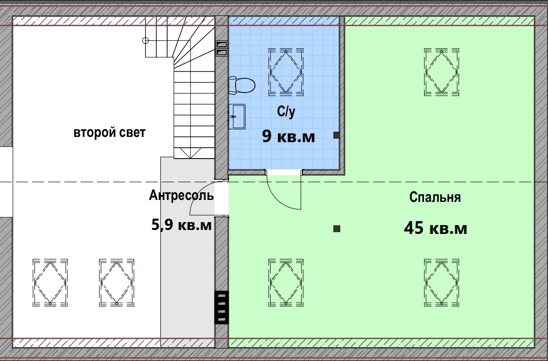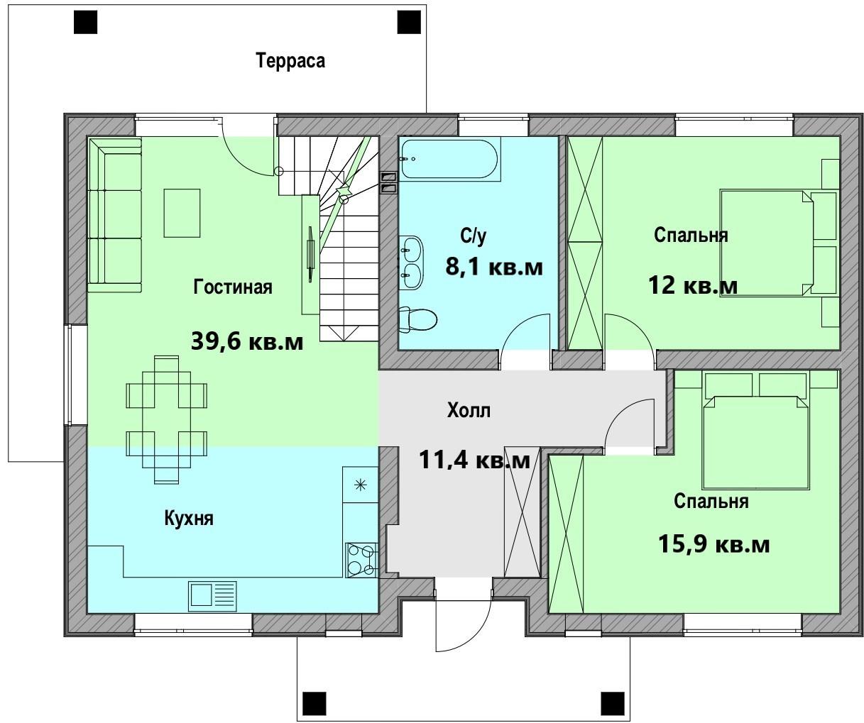 Дом располагает 3- 4 спальнями ( 16 кв, 17 кв.м,25- кв.м,44 кв.м ) 2 санузлами, просторной кухней-гостиной 39 кв.м с выходом на террасу. Также есть антресоль, которую можно продлить по желанию и добавить еще 1 комнату.