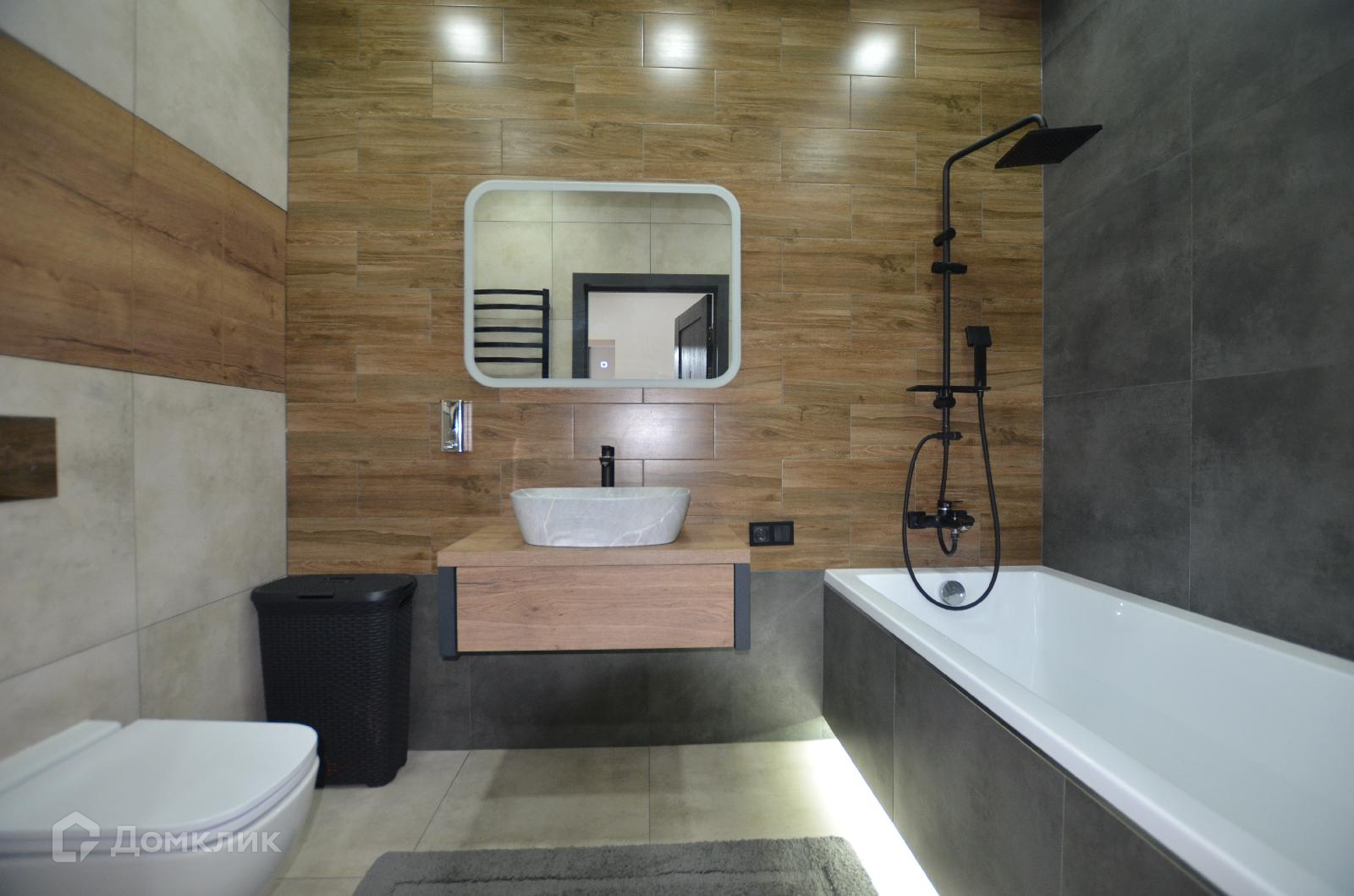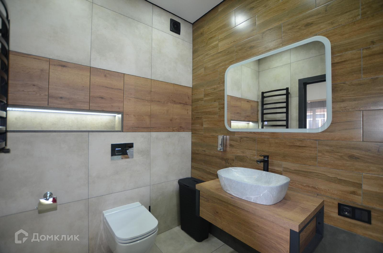 Теплые полы в прихожей, холле, на кухне и в санузле. Дизайн — ремонт в Скандинавском стиле. В прихожей дизайнерская отделка стены под натуральные известняковые скалы ручной работы. Крепкая металлическая лестница лофт, ступени временные из ДСП. Стильный с подсветкой ремонт в санузле, продуманный до мелочей. Темные двери и плинтус под заказ привезены из Финляндии.