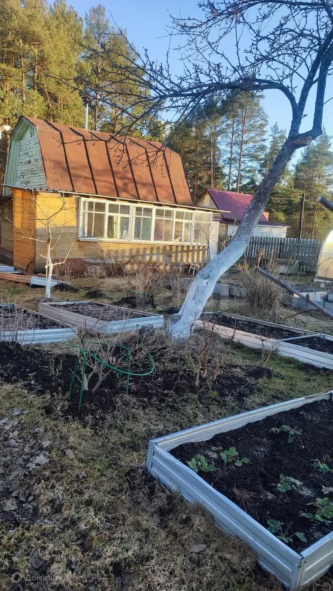 Сад плодоносит, много насаждений- крыжовник, смородина, клубника, земляника белая, жимолость , сад ухожен, все компактно, есть зеленая зона, участок в два места- хозблок отдельно, парковка, гараж , зона барбекю, дом требует косметического ремонта, большой двухэтажный с стекленной шестиметровой верандой, есть место под баню отдельно, в соснах, межевание сделано.
