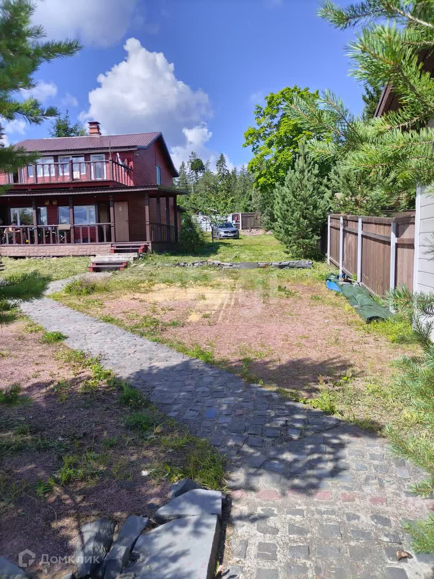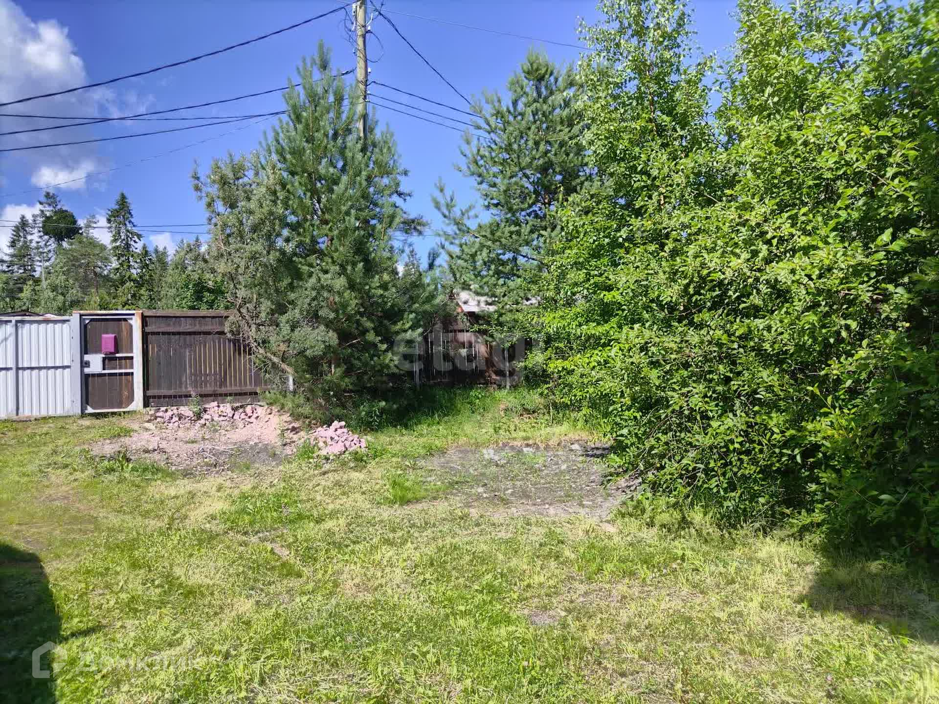 Участок огорожен высоким деревянным забором.