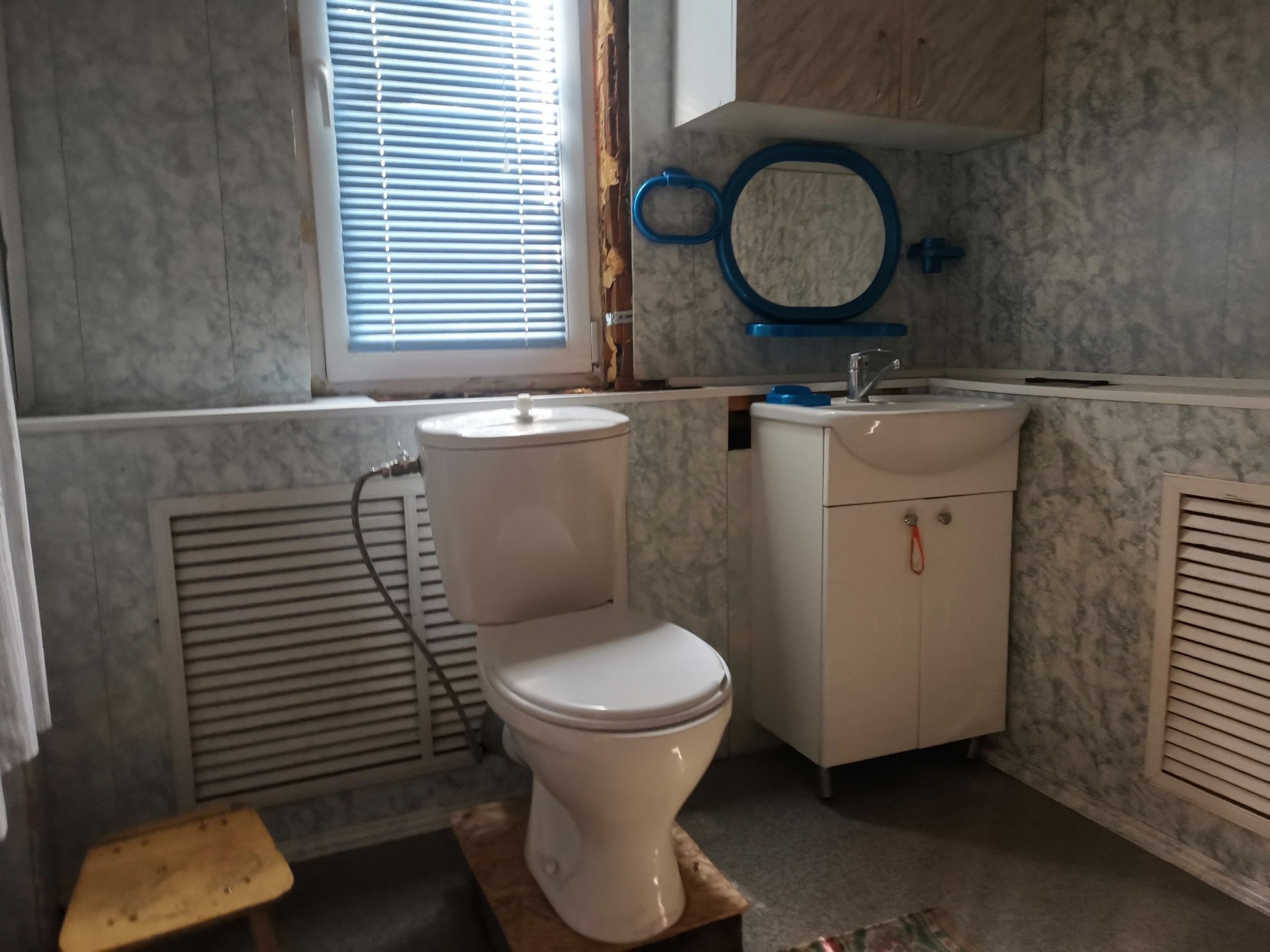 В доме просторная гостиная, спальня и совмещенный санузел (туалет, душевая кабина и раковина).