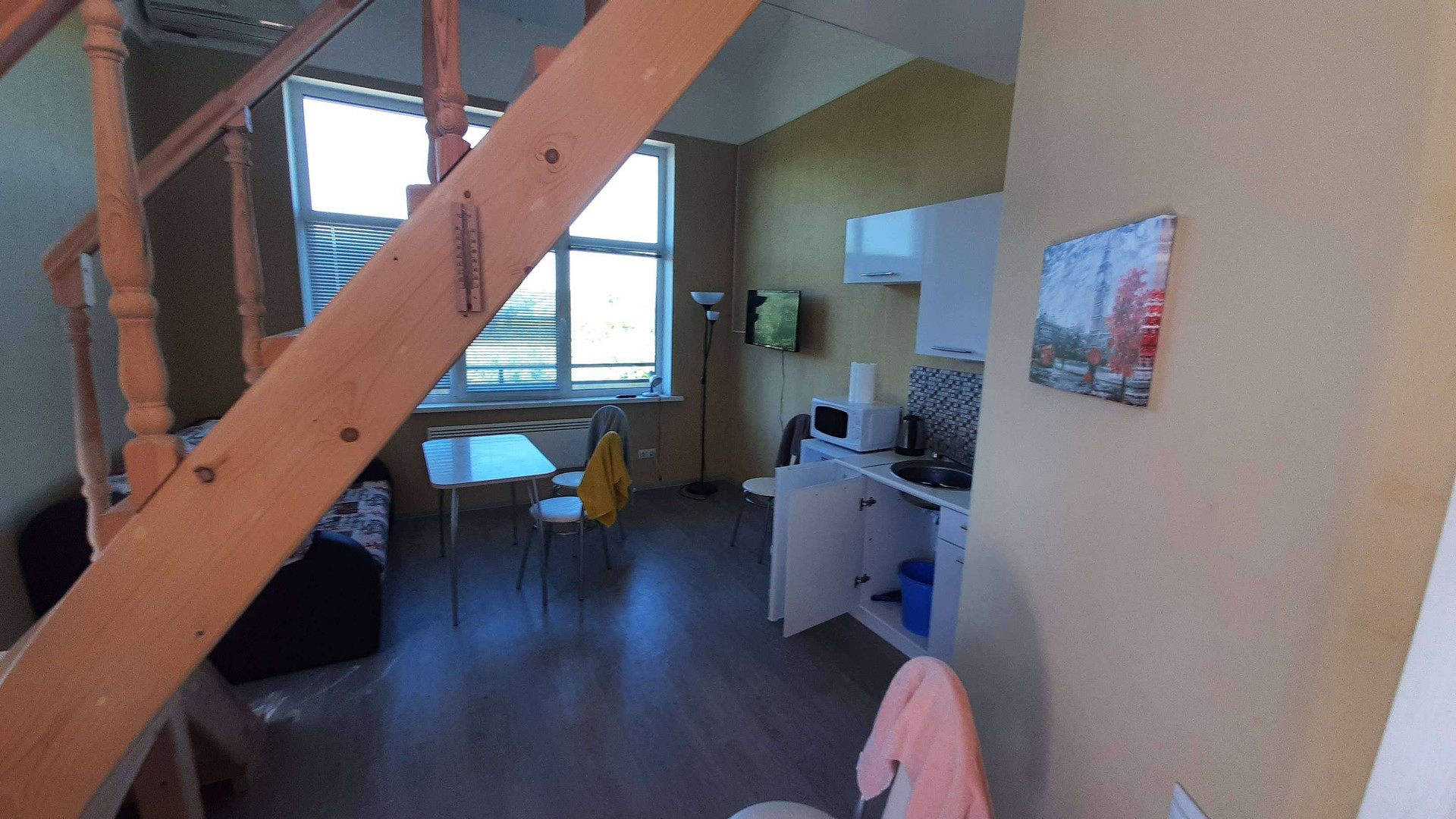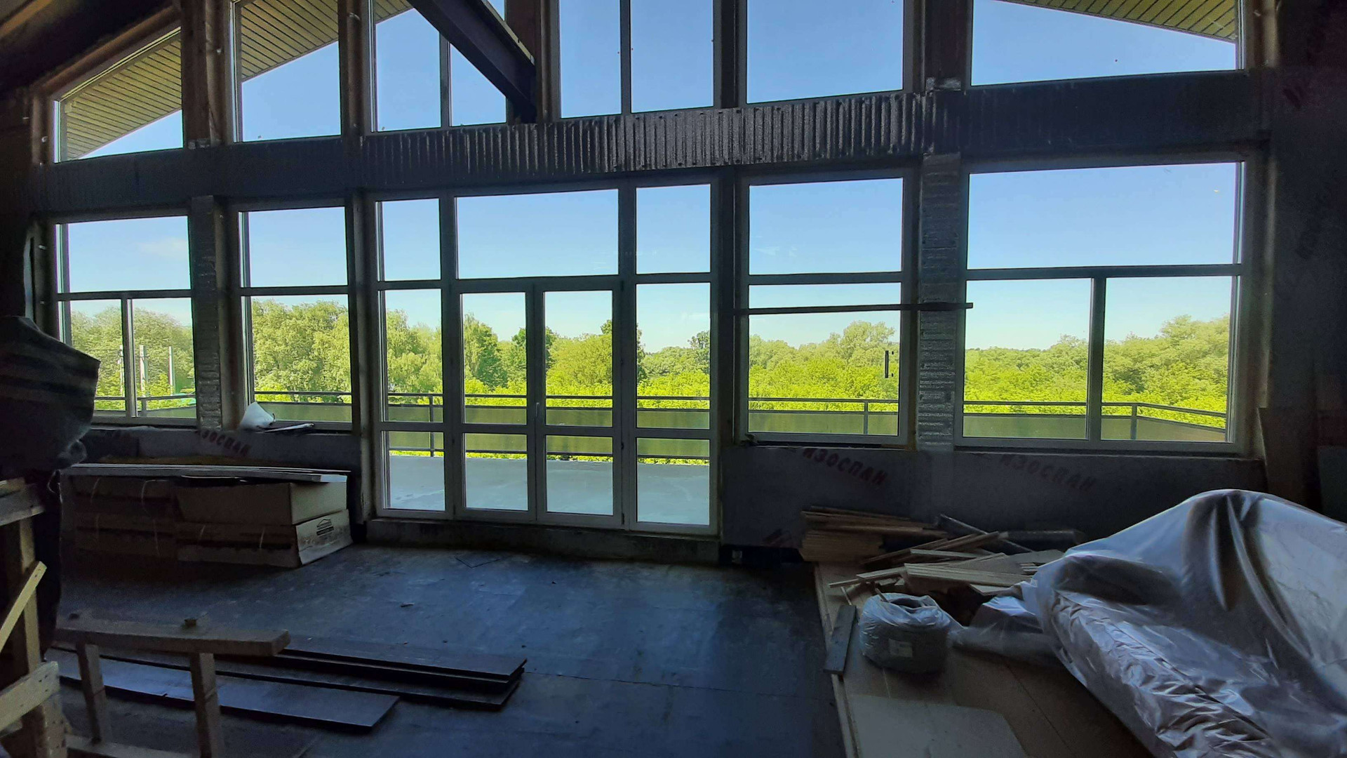 Центральная часть-под отделку , представляет собой кухню-гостиную 55кв.м. , кабинет 13кв.м., с выходом открытую террасу с видом на Оку.