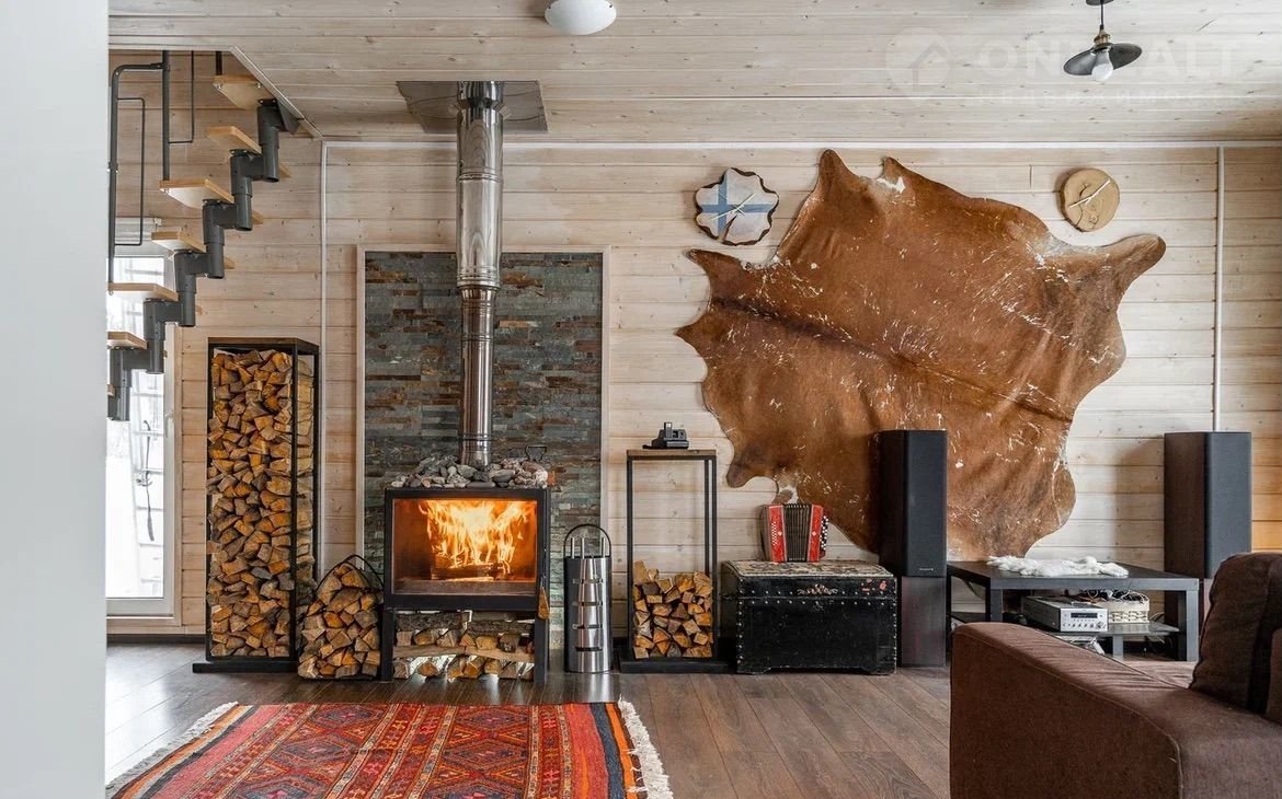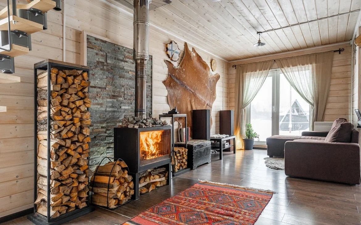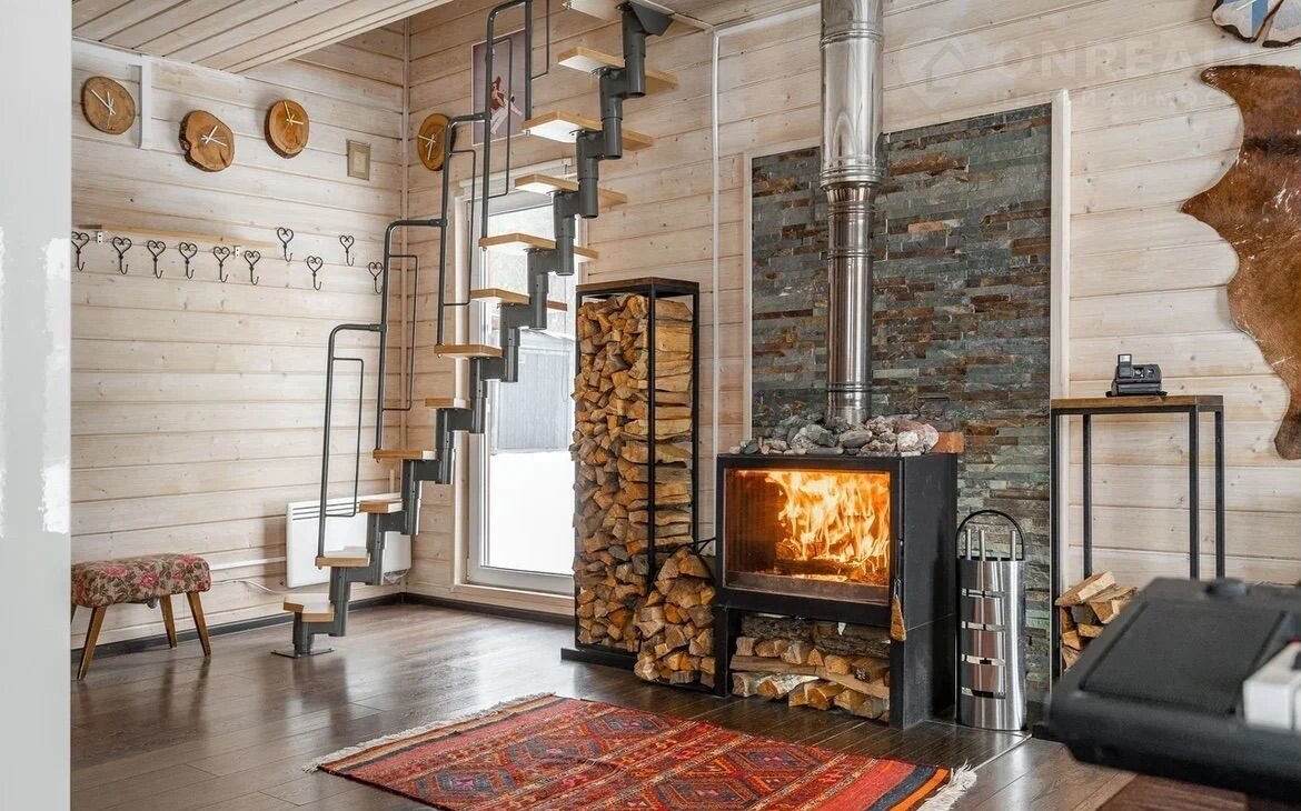 В гостиной есть камин. Он прекрасно обогревает дом зимними вечерами и создаёт уют. Также есть просторное крыльцо-терасса. Летом оно открытое, а на зиму закрывается гибкими прозрачными окнами.