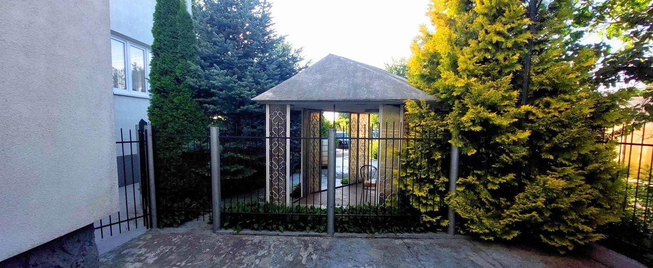-зона барбекю с беседкой, мангалом, красивыми ёлочками и газоном — место для семейных посиделок и дружеских встреч;