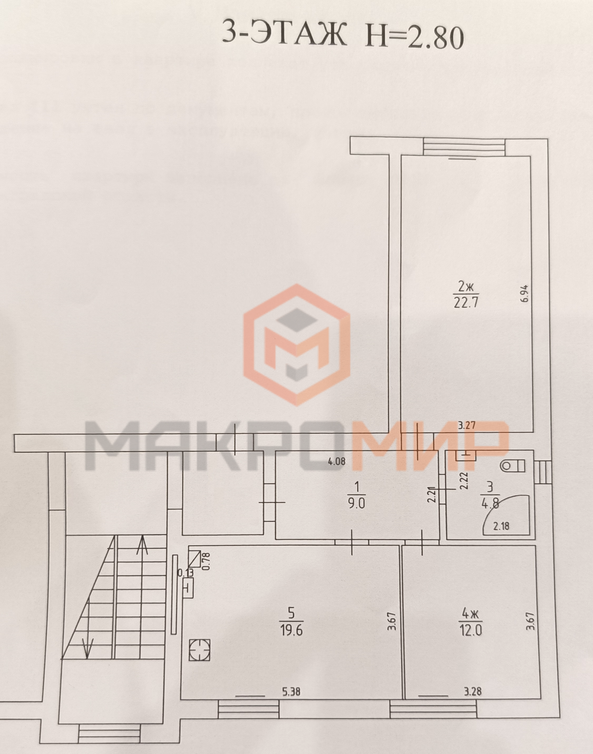 Общая площадь квартиры составляет 68,1м². Жилые комнаты занимает площадь 22,7м² и 12,0м². Просторная кухня-столовая или кухня-гостиная – 19,6м². Совмещенный санузел – 4,8м².