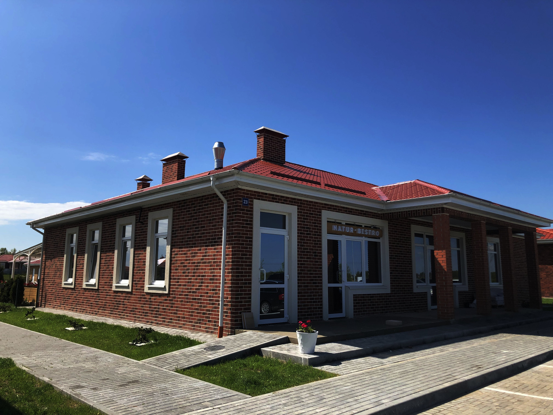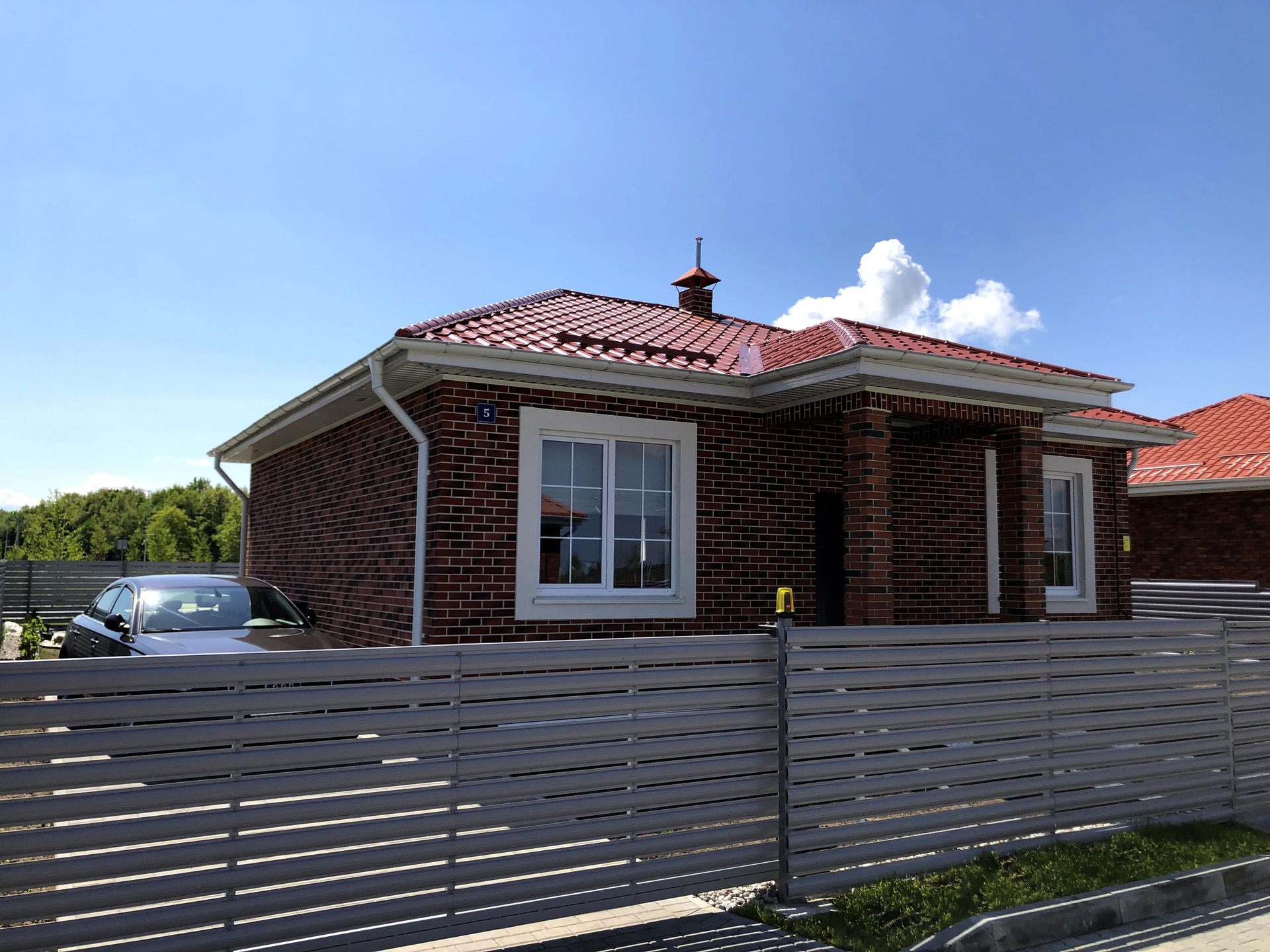 Благоустроенный красивый 1-этажный дом с газоном и цветником это: