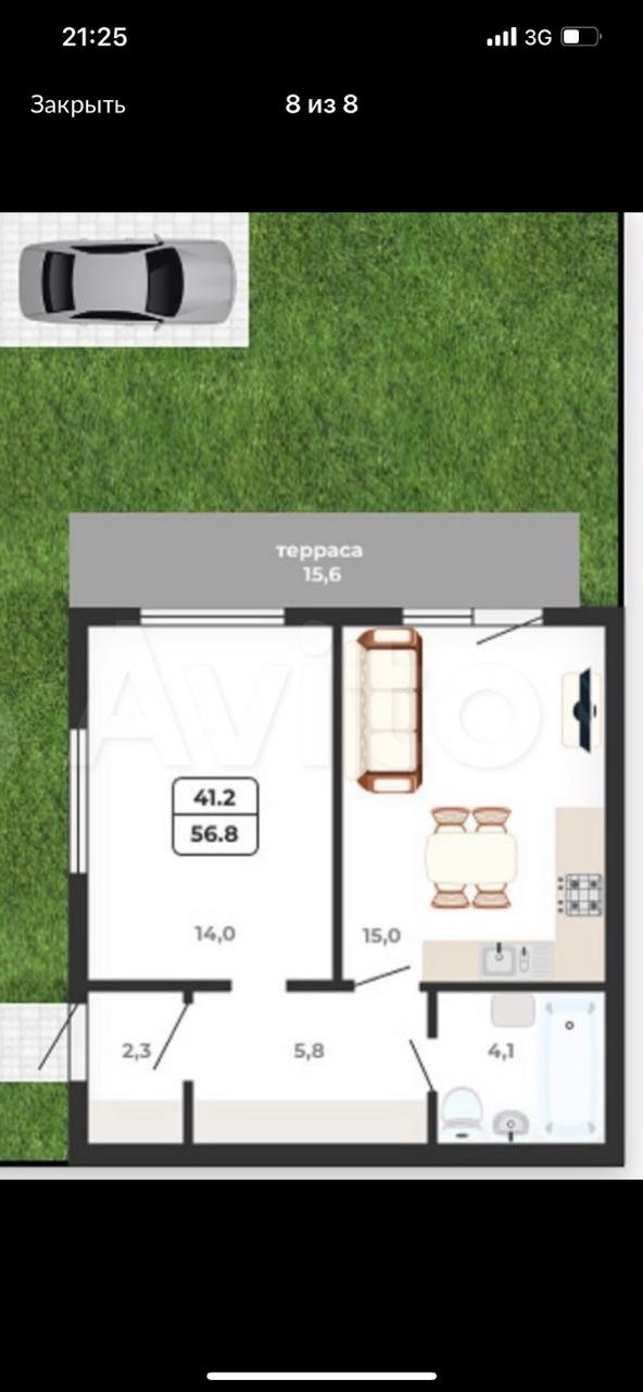 Общая площадь таунхауса 41,2 кв.м. с собственной террасой и 2 сот. земли.