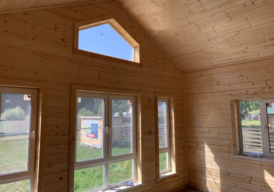 Обшивка внутренних стен и потолка имитацией бруса.