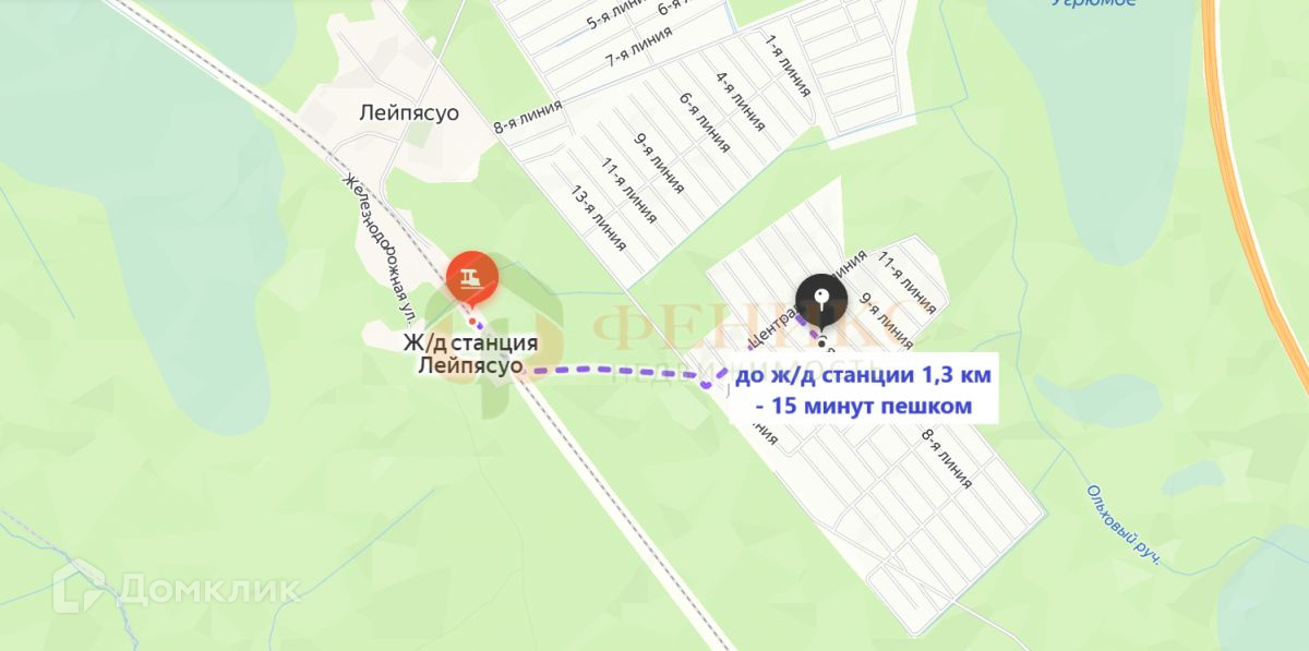 ИНФРАСТРУКТУРА, ТРАНСПОРТ: Садоводство находится у ж/д ст. "Лейпясуо" – 15 минут пешком. Есть магазин, детская площадка - 3 минуты пешком, идеально подходит для тех, кто пользуется электричкой и ценит дикую природу Карельского перешейка. Вокруг садоводства живописный лес с ягодами и грибами. На машине час езды из центра города по трассе "Скандинавия". В 15-ти минутах езды на велосипеде большое рыбное озеро "Глубокое", до г. Выборг со всей городской инфраструктурой 25 минут езды.