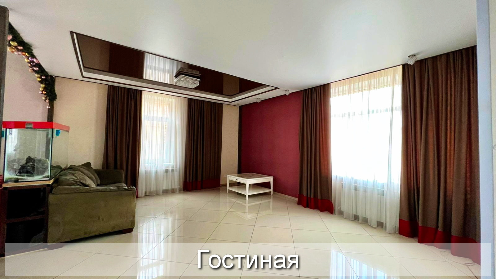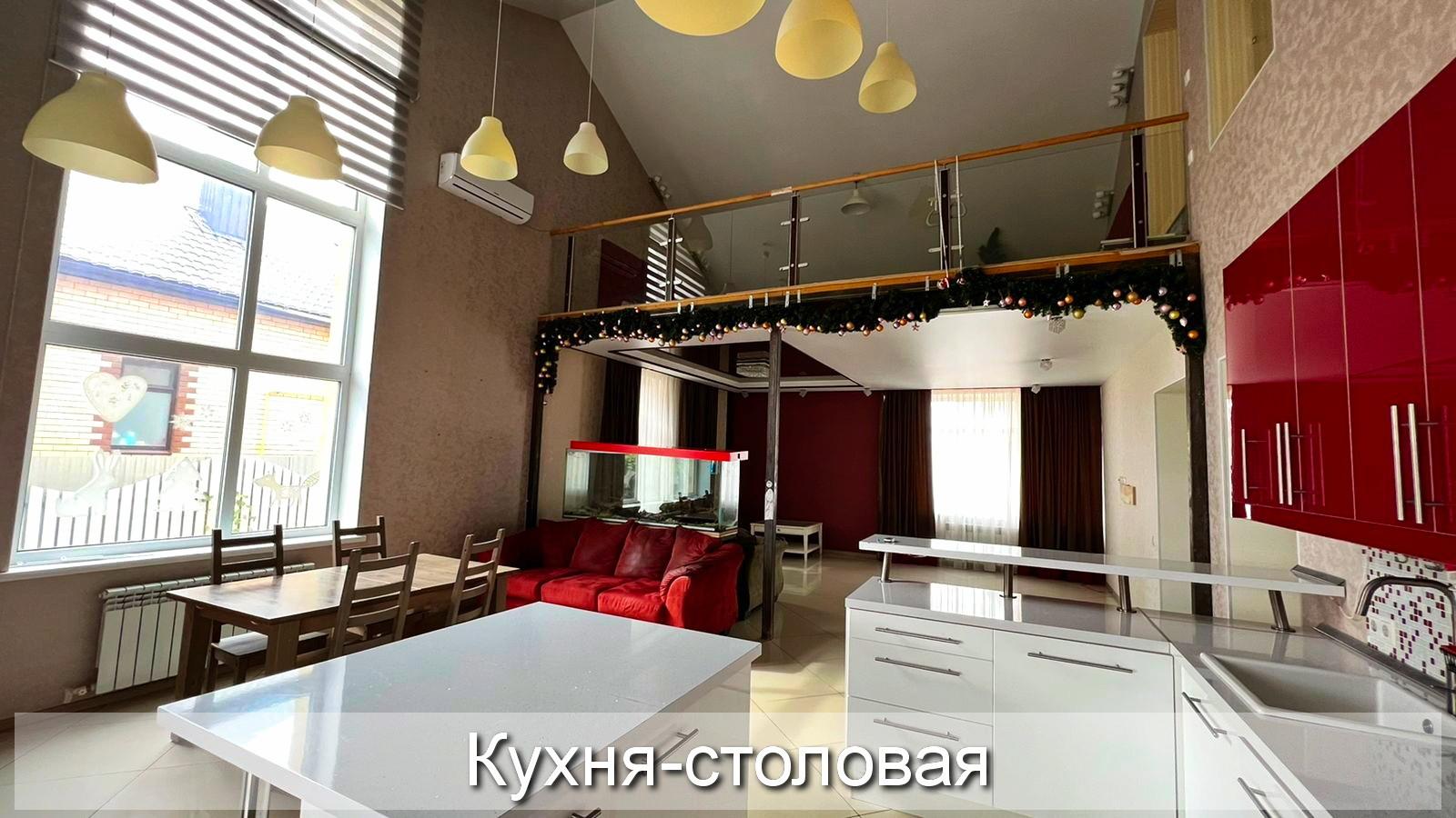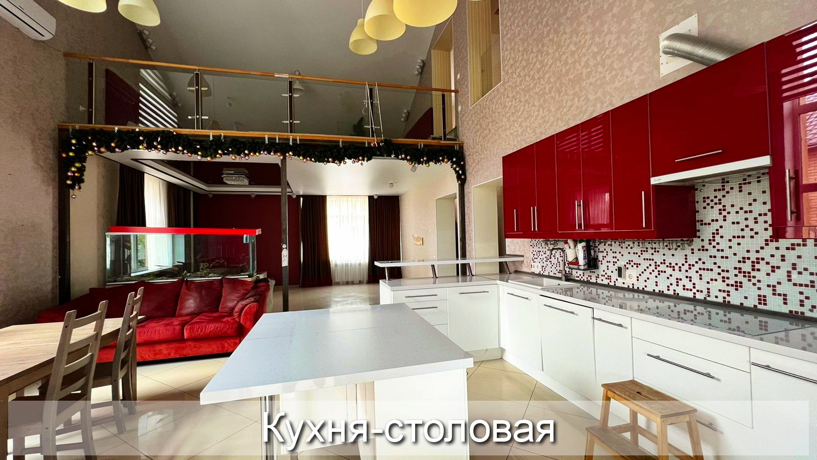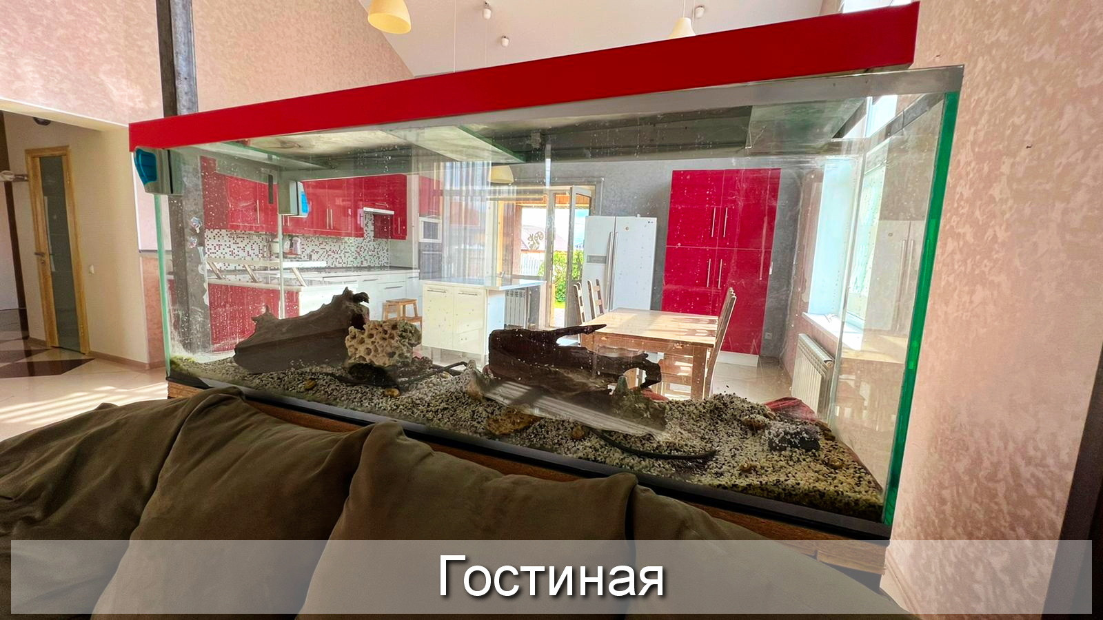 3. Кухня-столовая и гостиная объединены в одно общее пространство площадью более 60 м², и зонированы большим аквариумом на 500 л.;