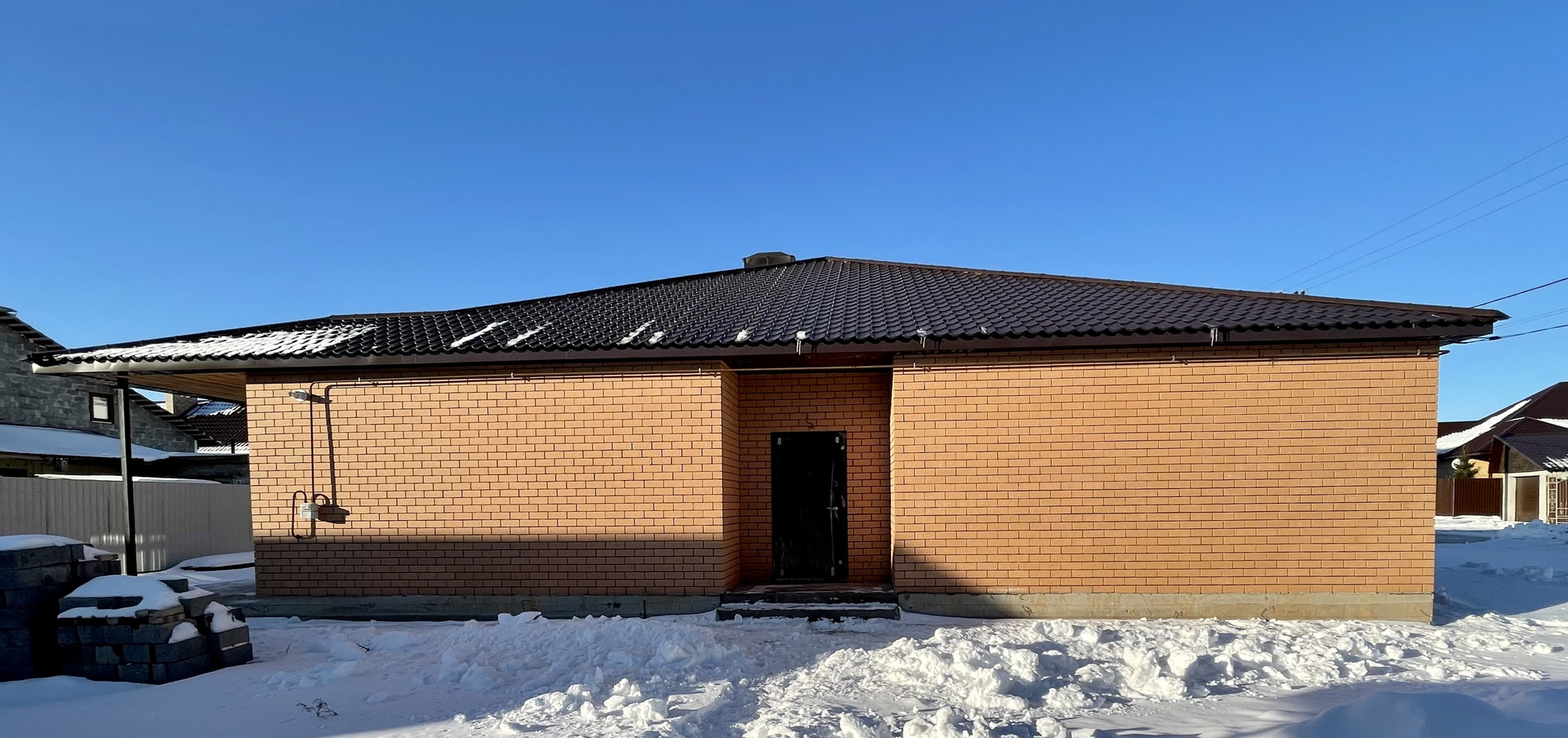 Крыша - металлочерепица цвета тёмный шоколад.