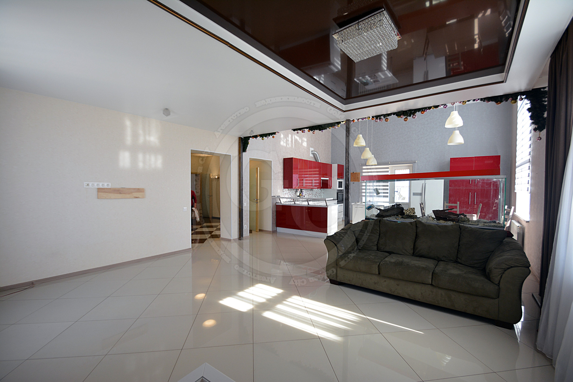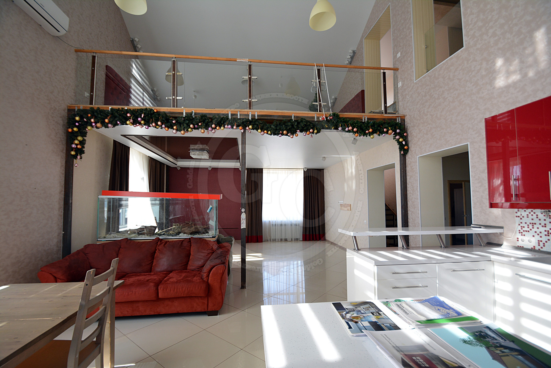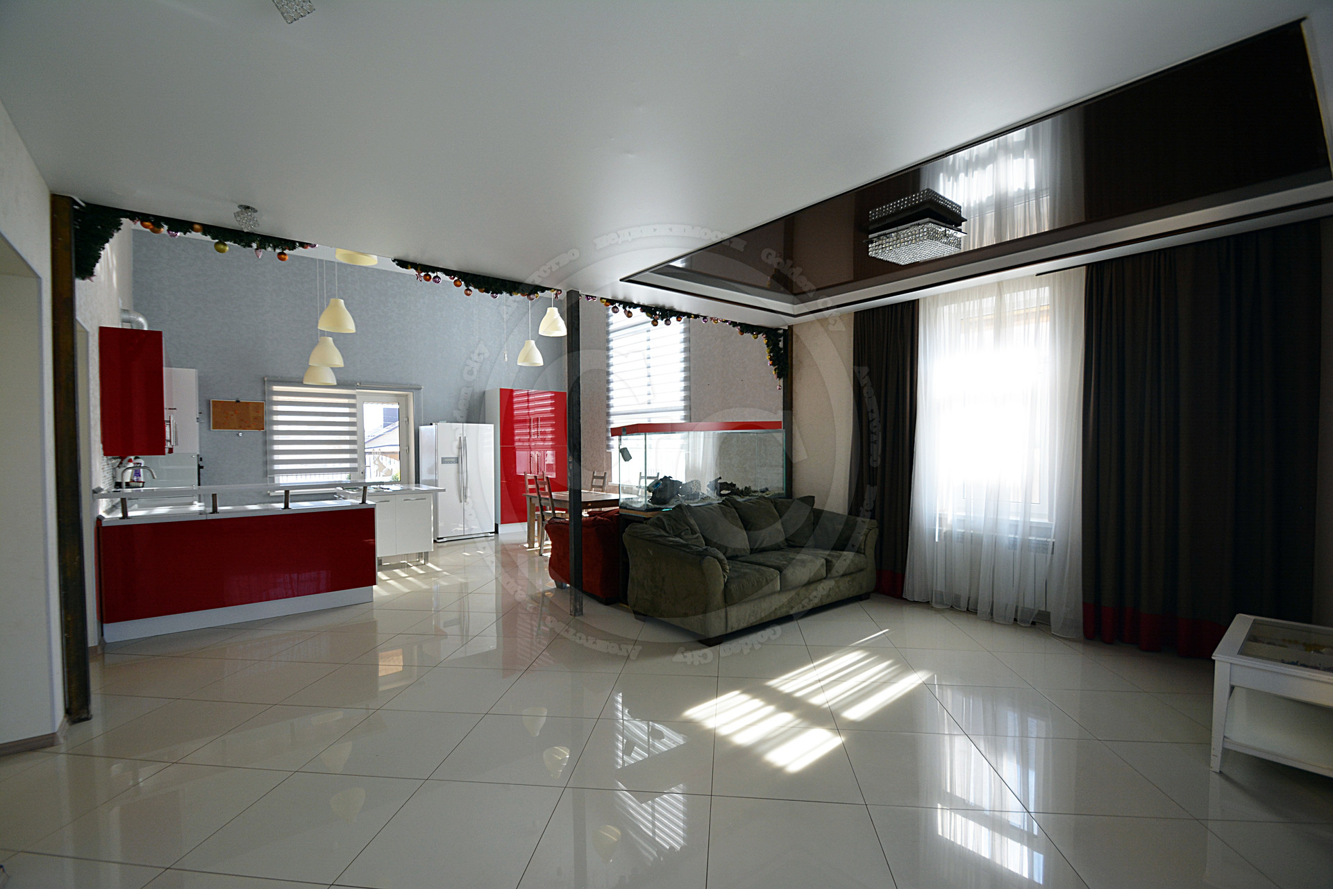 3. Кухня-столовая и гостиная объединены в одно общее пространство площадью более 60 м², и зонированы большим аквариумом на 500 л.;