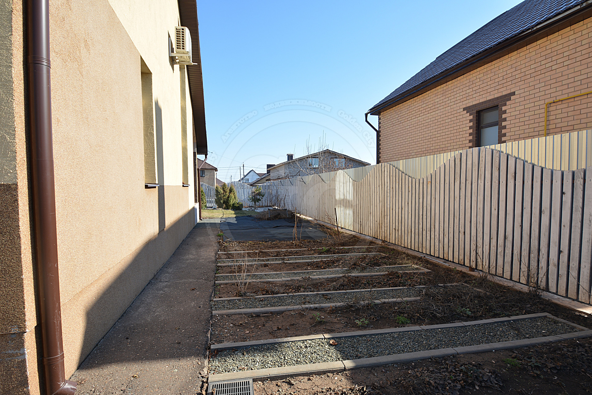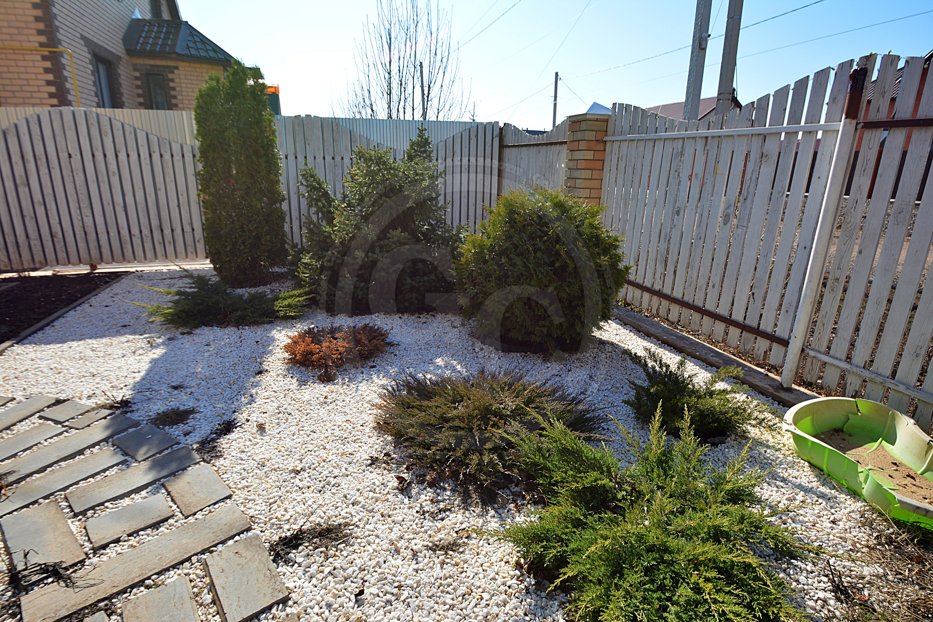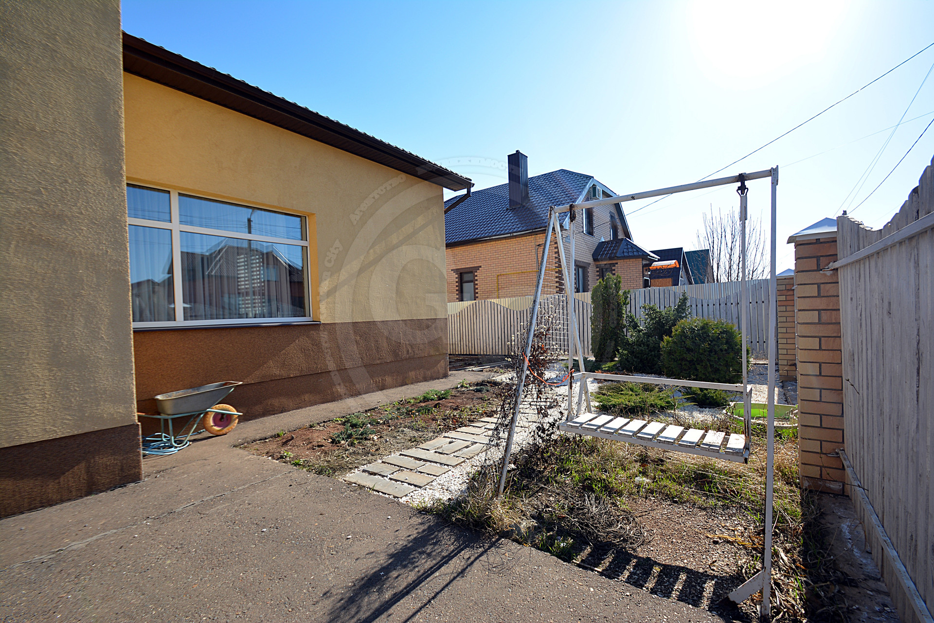 На территории участка имеется практически завершённое ландшафтное озеленение, автополив, подсветка, качели, густой зелёный газон с хвоинками, небольшой огород и 6 сортов плодоносящего районированного винограда. Красивый забор. Система наружного видеонаблюдения.