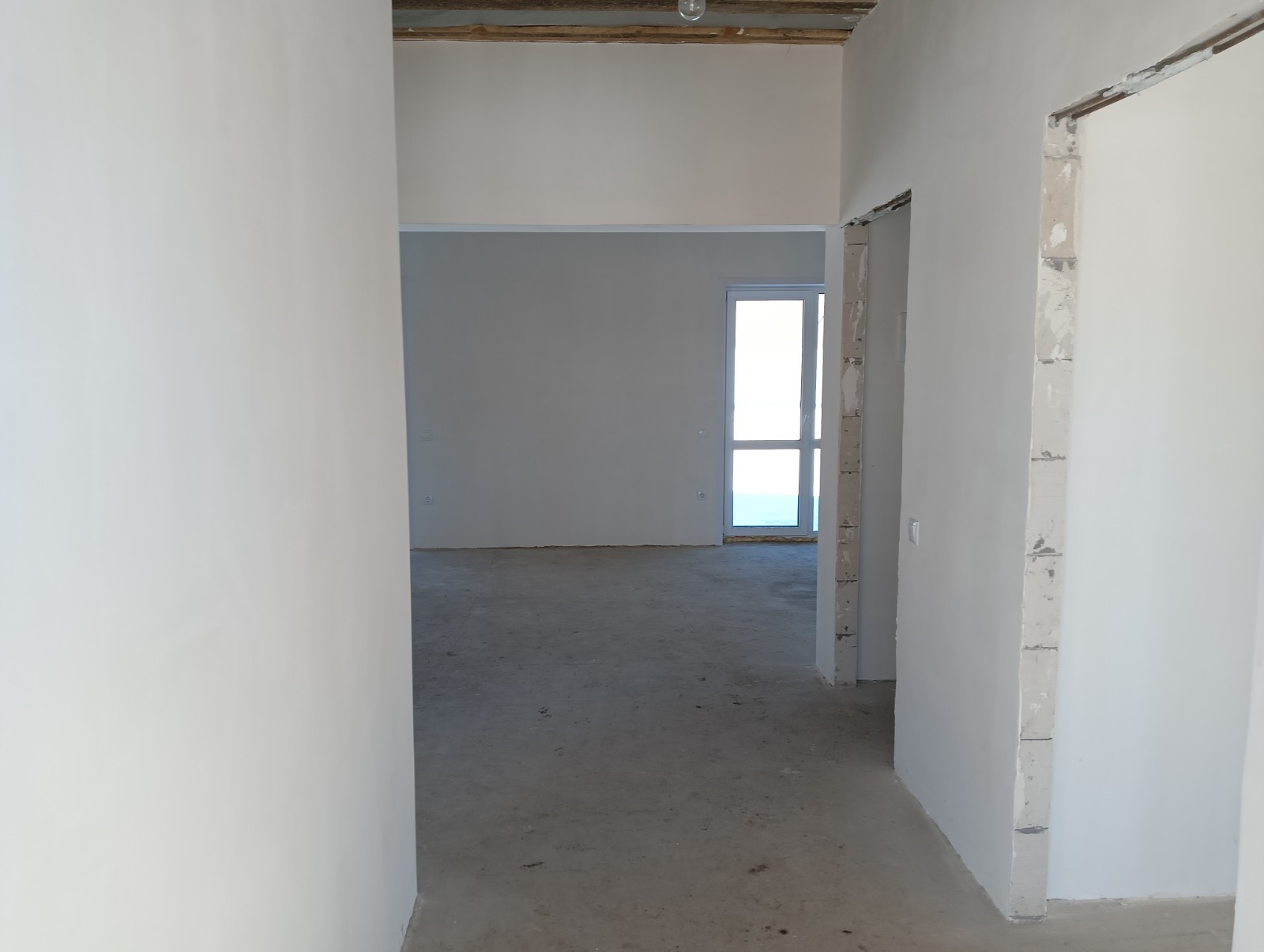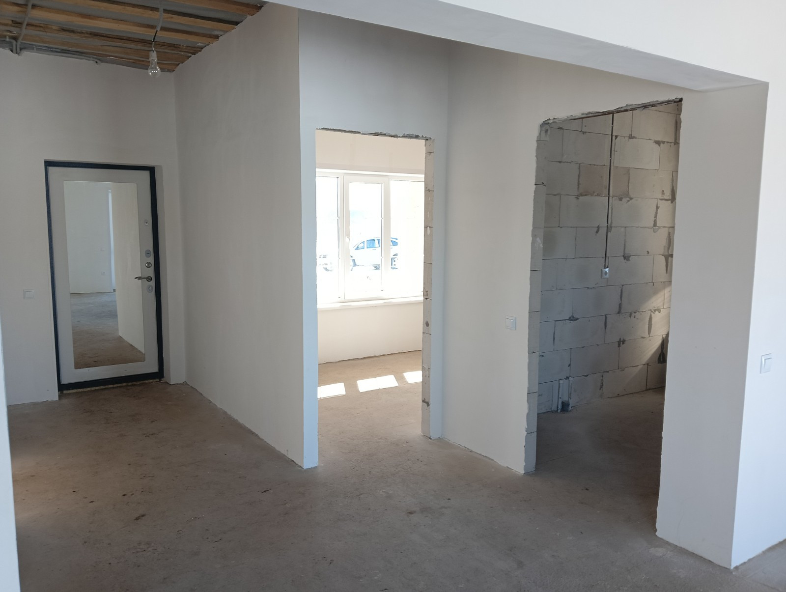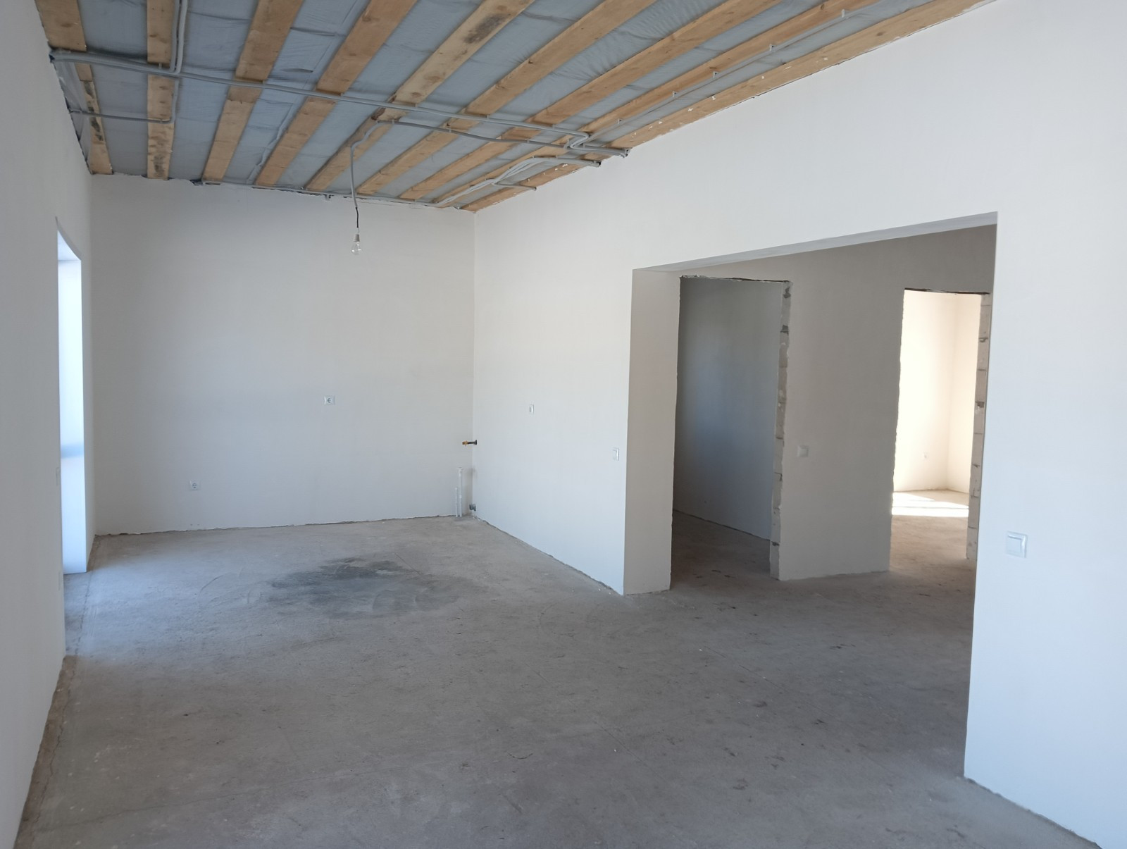 Стены отшпаклеваны под обои, выполнена разводка электрики и отопления -теплый пол, заведены все коммуникации