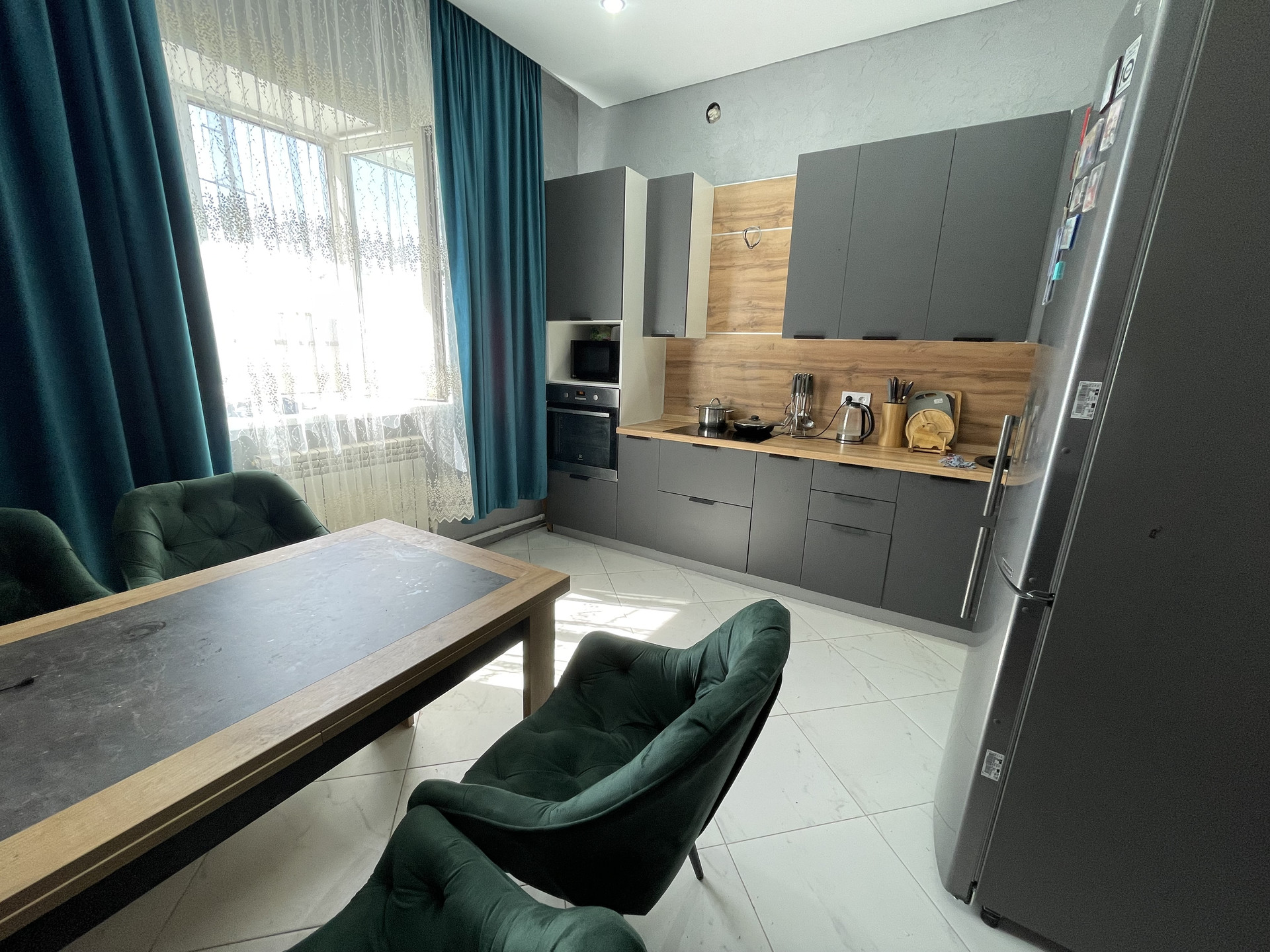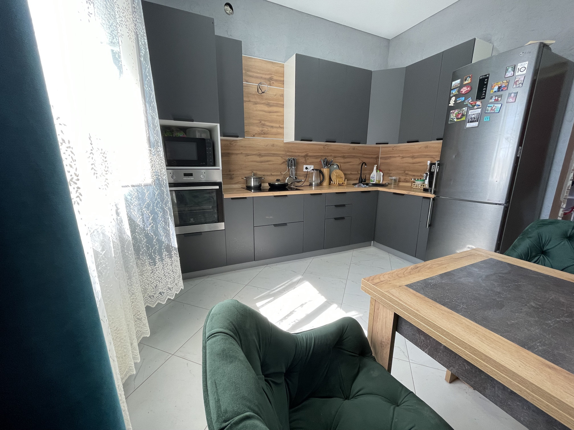 Из мебели остается кухонный гарнитур со встроенной техникой, сплит система, в зале диван, детская мебель, гардеробная.