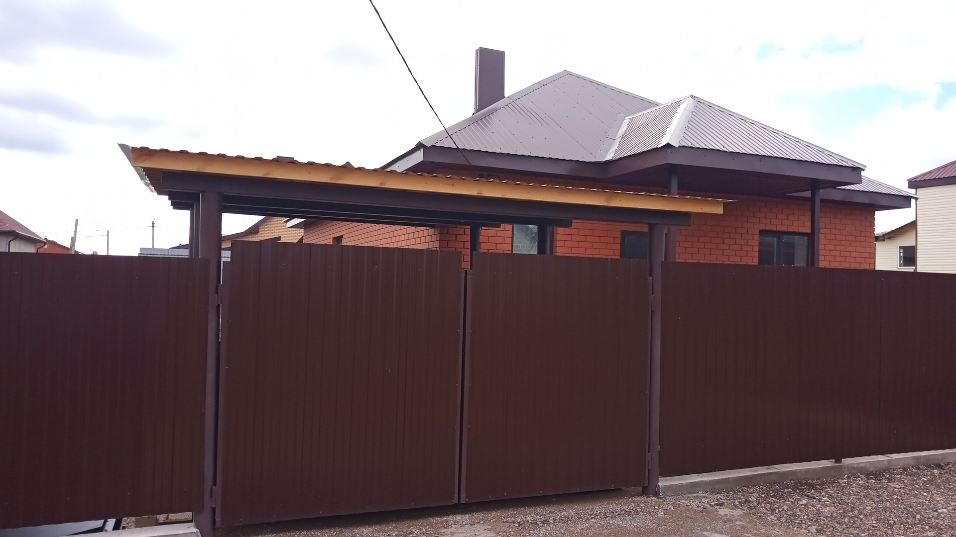 Навес под автомобиль, 3,5 на 6 метров с залитой площадкой. Опоры - толстостенные буровые трубы! Проводка под освещение с отдельным автоматом.