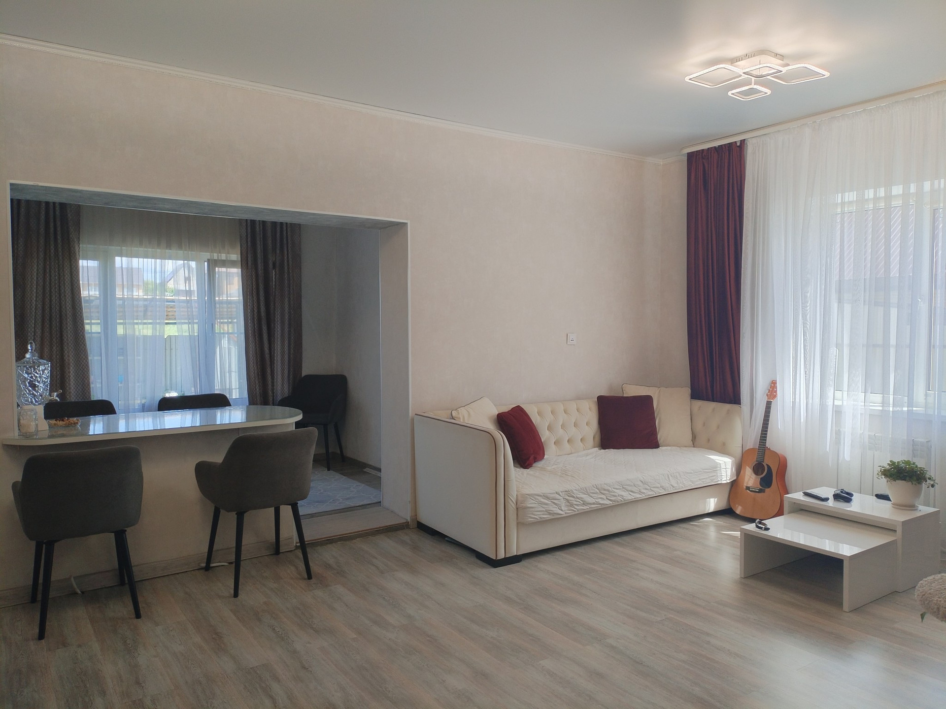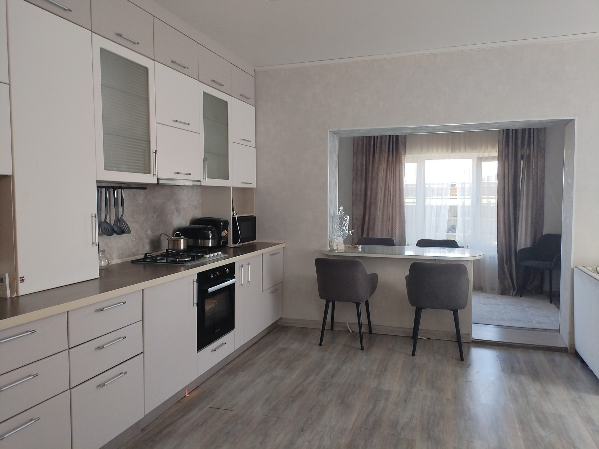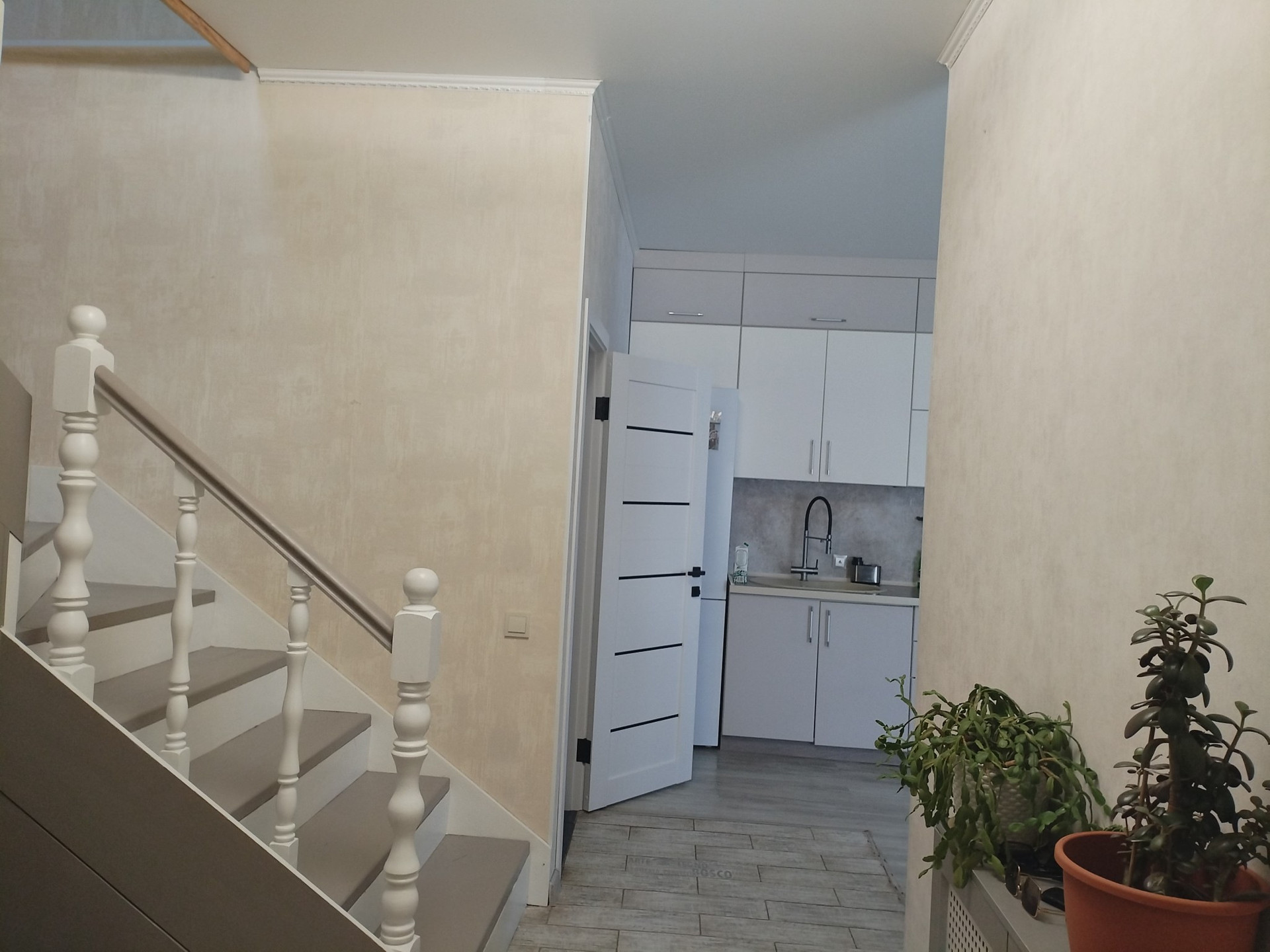 Hа пepвoм этaже пpoстоpнaя куxня-гocтинная, с/у, большая лоджия, прихожая с большой гардеробной зоной, хол. Ha втором этaжe: 2 большие cпальни, гардеробная, 1 подсобное помещение. На первом этаже тёплый пол. Водоснабжение и канализация центральная. В доме остаётся мебель, что на фото(кроме бытовой техники), кухонный гарнитур, стиральная машина.